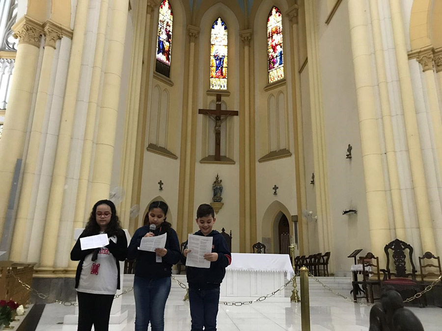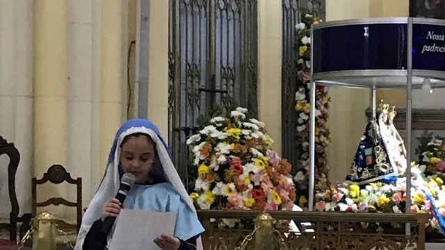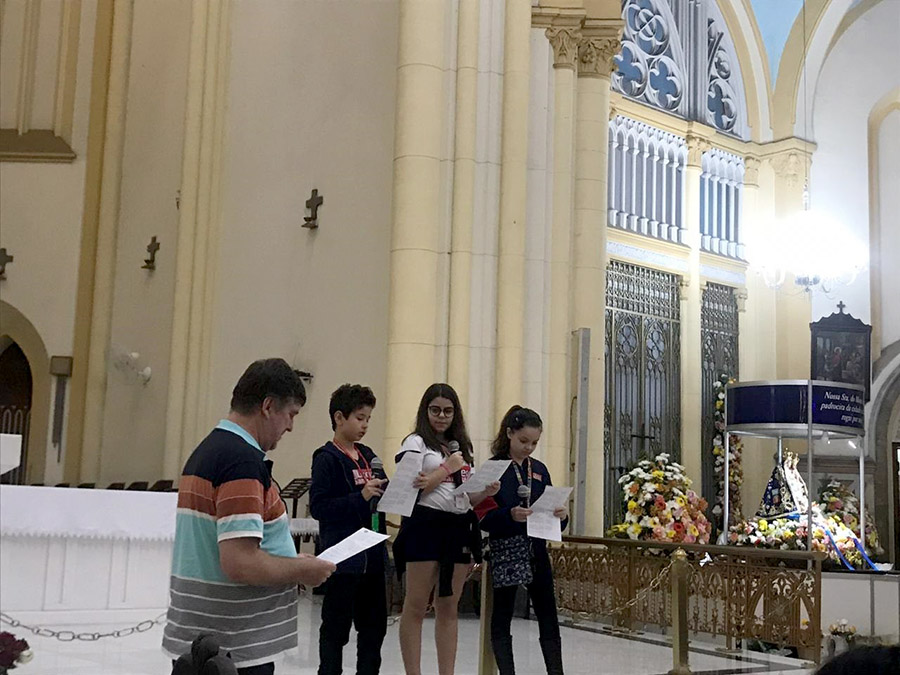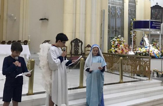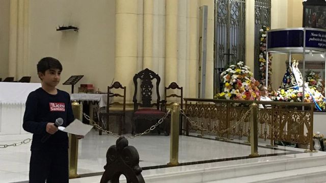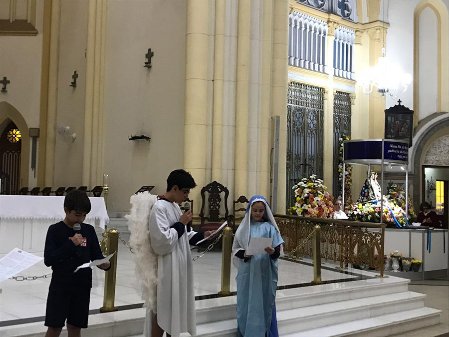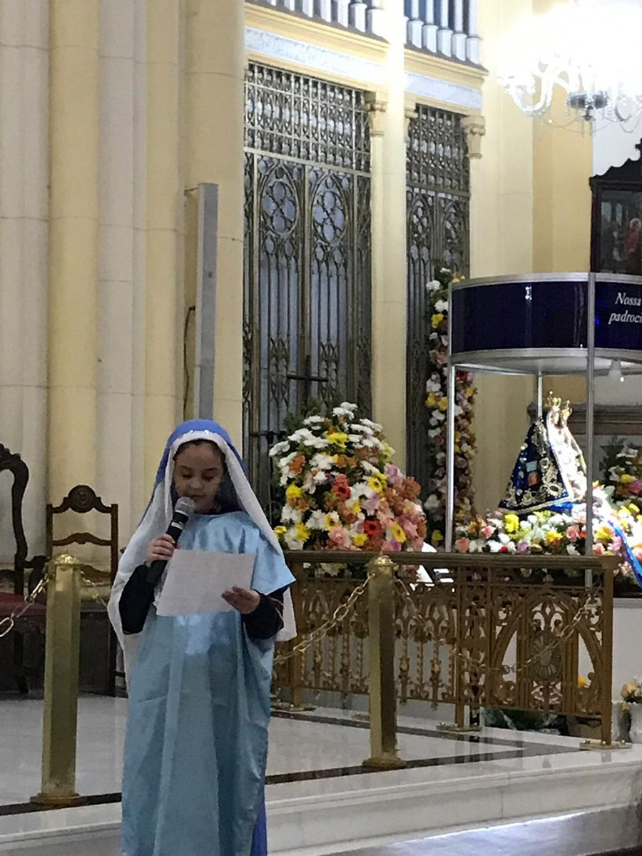 Tempo de agradecer pelos momentos felizes vivenciados junto às famílias e amigos e de renovar os pedidos a Maria, Mãe de Jesus. Embalados pelas vozes do Coral Canta Mais, regido pelo professor Felipe Borges, os estudantes relembraram a importância da padroeira para a cidade.