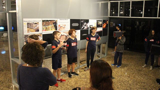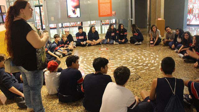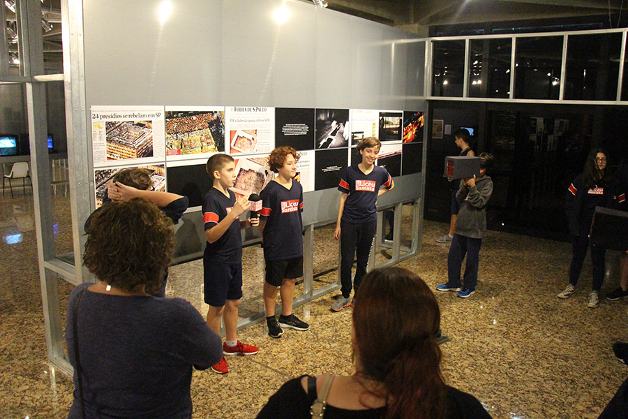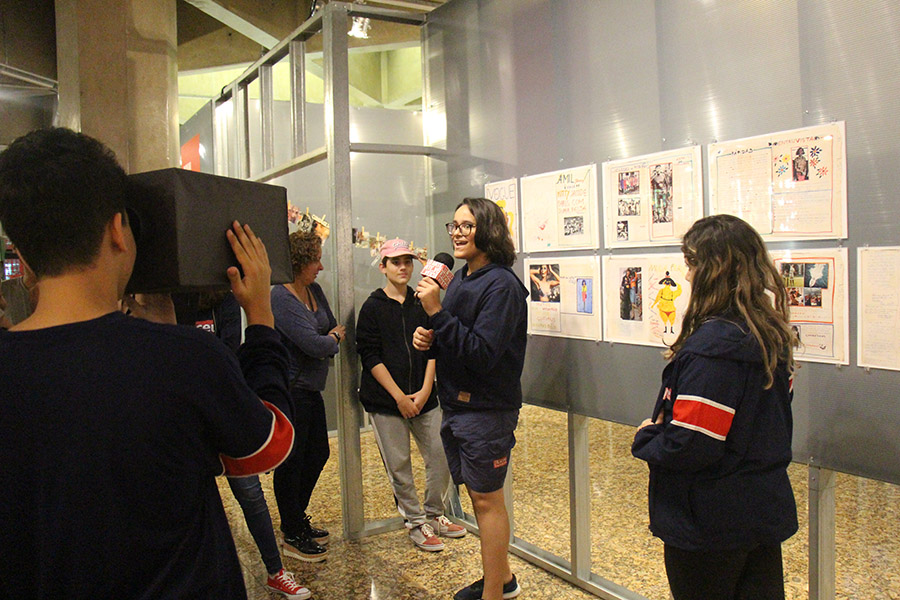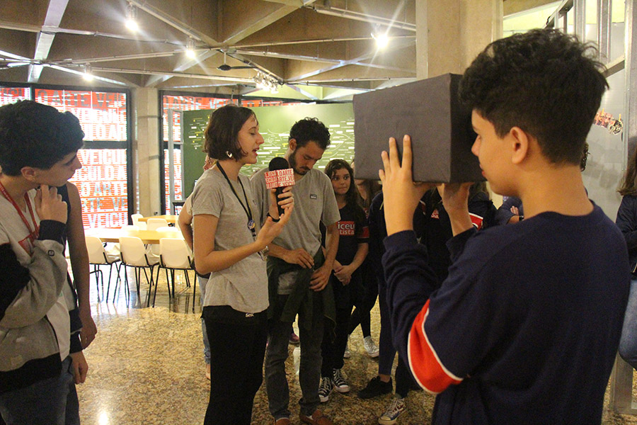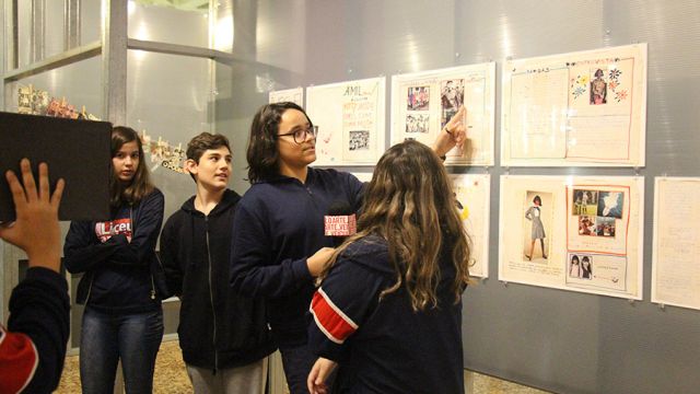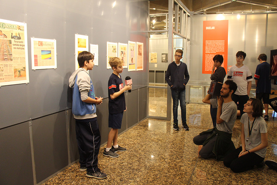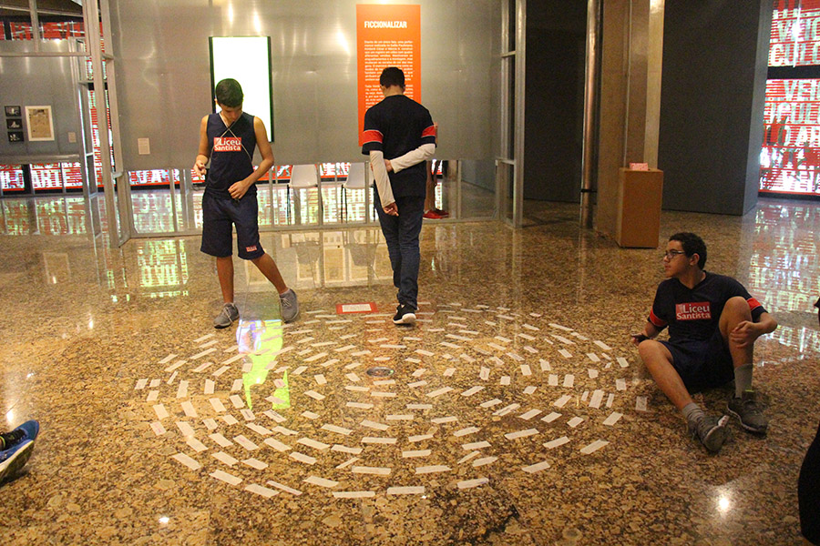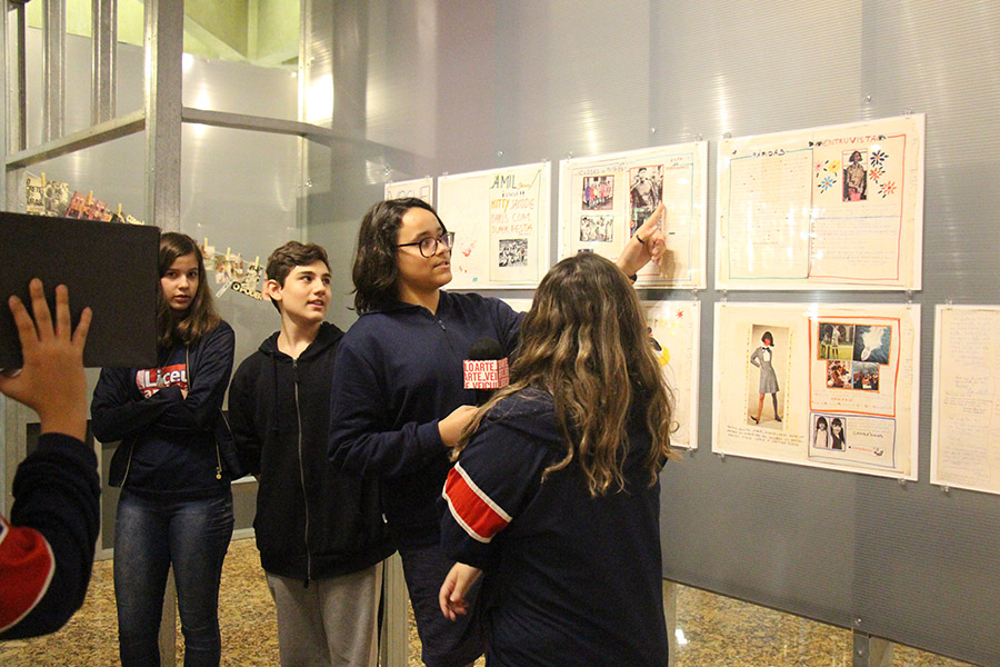 Acompanhados pelas professoras de Arte, Andréa Dall´Antonia, e de Língua Portuguesa, Andreia Carvalho, os liceístas foram convidados pela monitoria da exposição a refletir sobre as obras e a interagir com elas. A proposta sugerida foi que eles escolhessem um dos trabalhos e compartilhassem com os colegas seu entendimento utilizando, simbolicamente, um microfone e uma câmera de papelão.