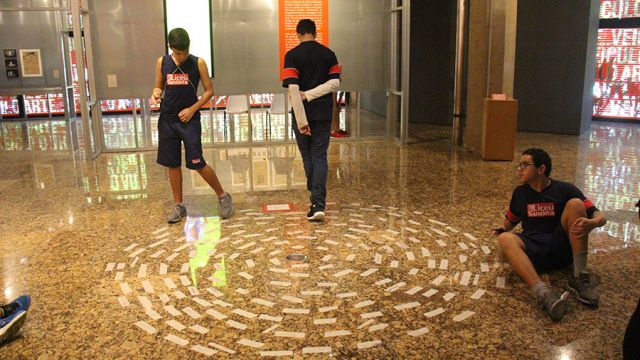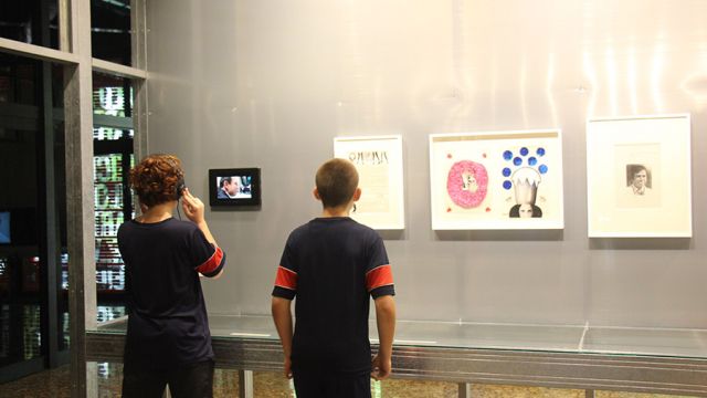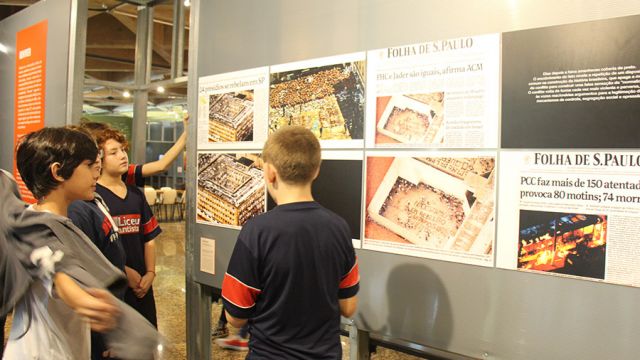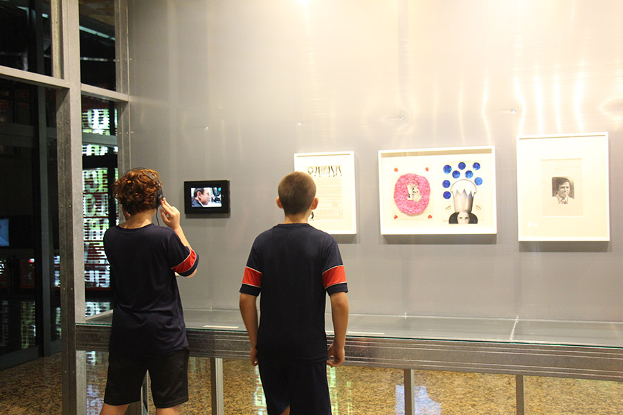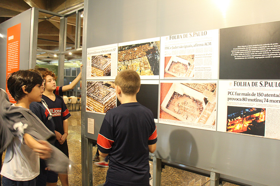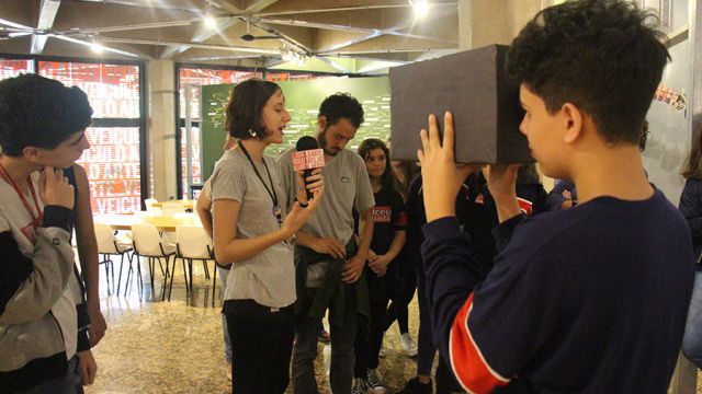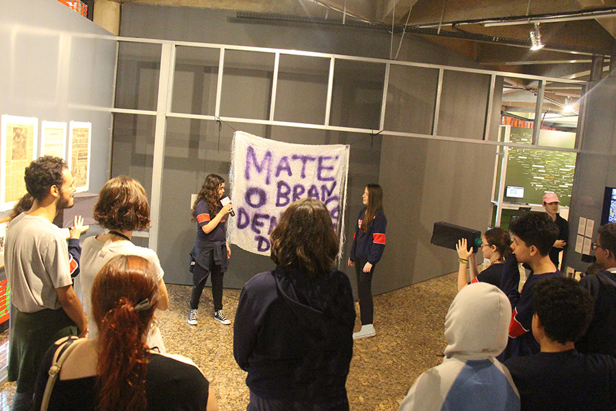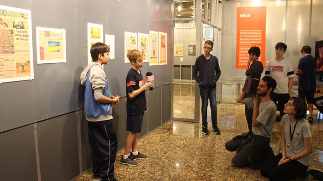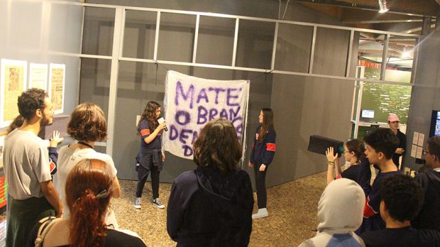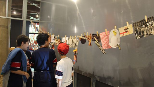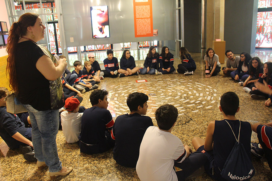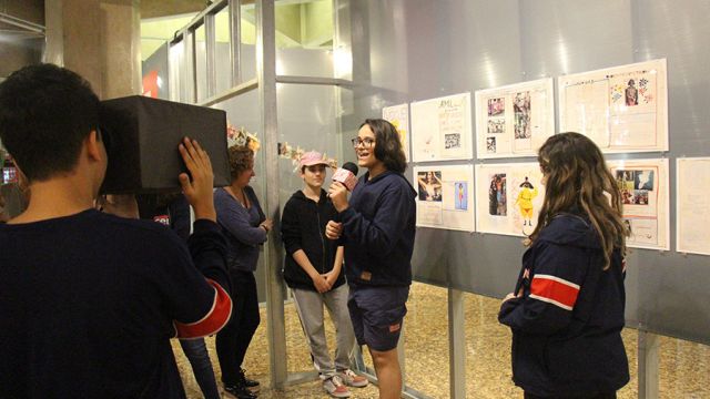Acompanhados pelas professoras de Arte, Andréa Dall´Antonia, e de Língua Portuguesa, Andreia Carvalho, os liceístas foram convidados pela monitoria da exposição a refletir sobre as obras e a interagir com elas. A proposta sugerida foi que eles escolhessem um dos trabalhos e compartilhassem com os colegas seu entendimento utilizando, simbolicamente, um microfone e uma câmera de papelão.
