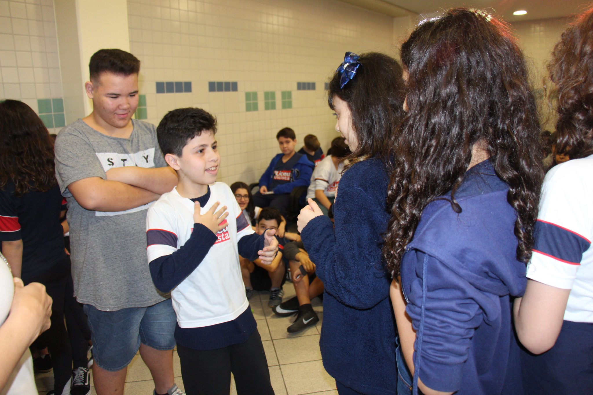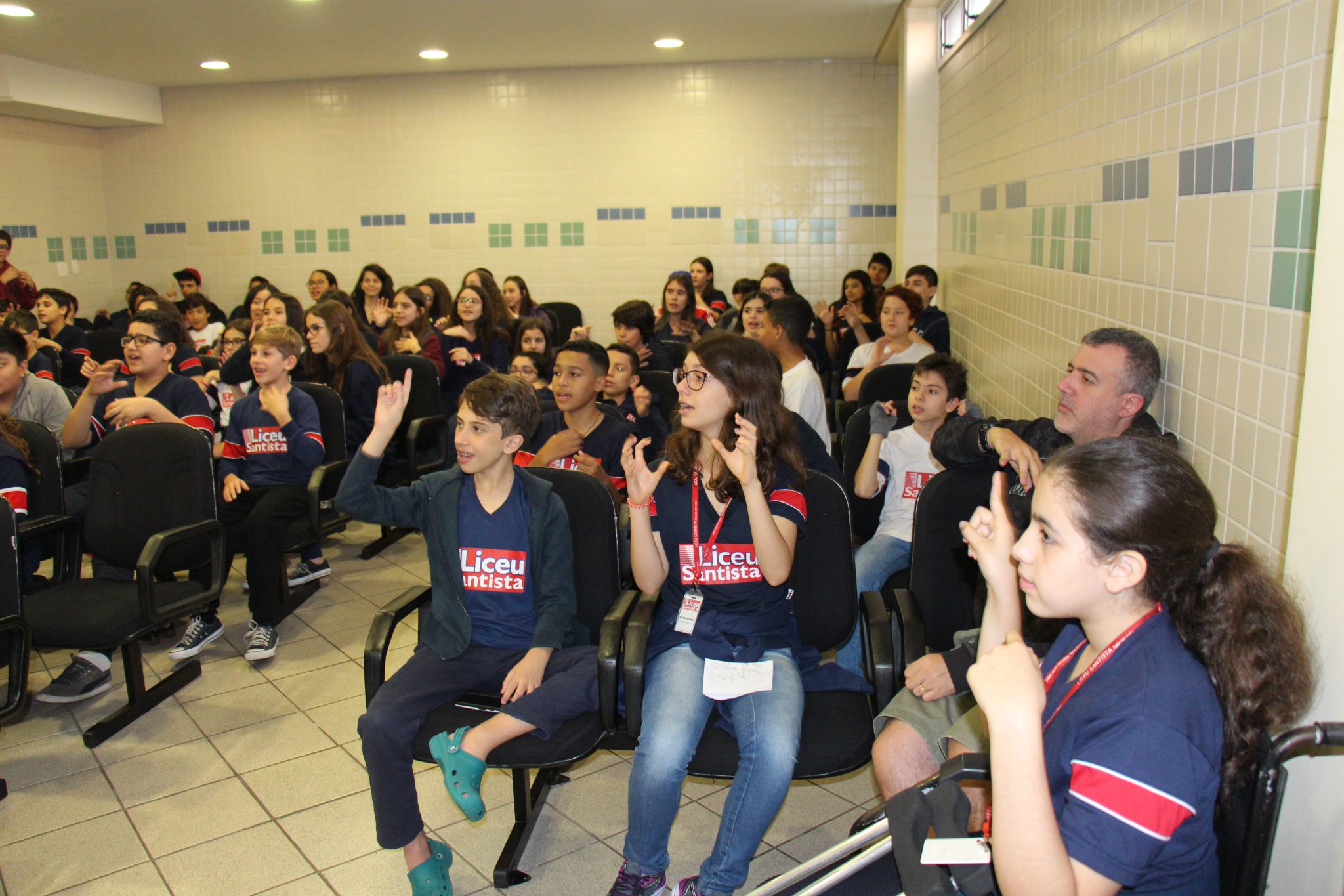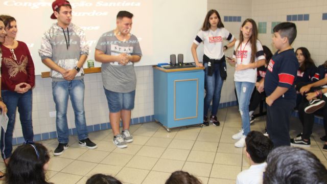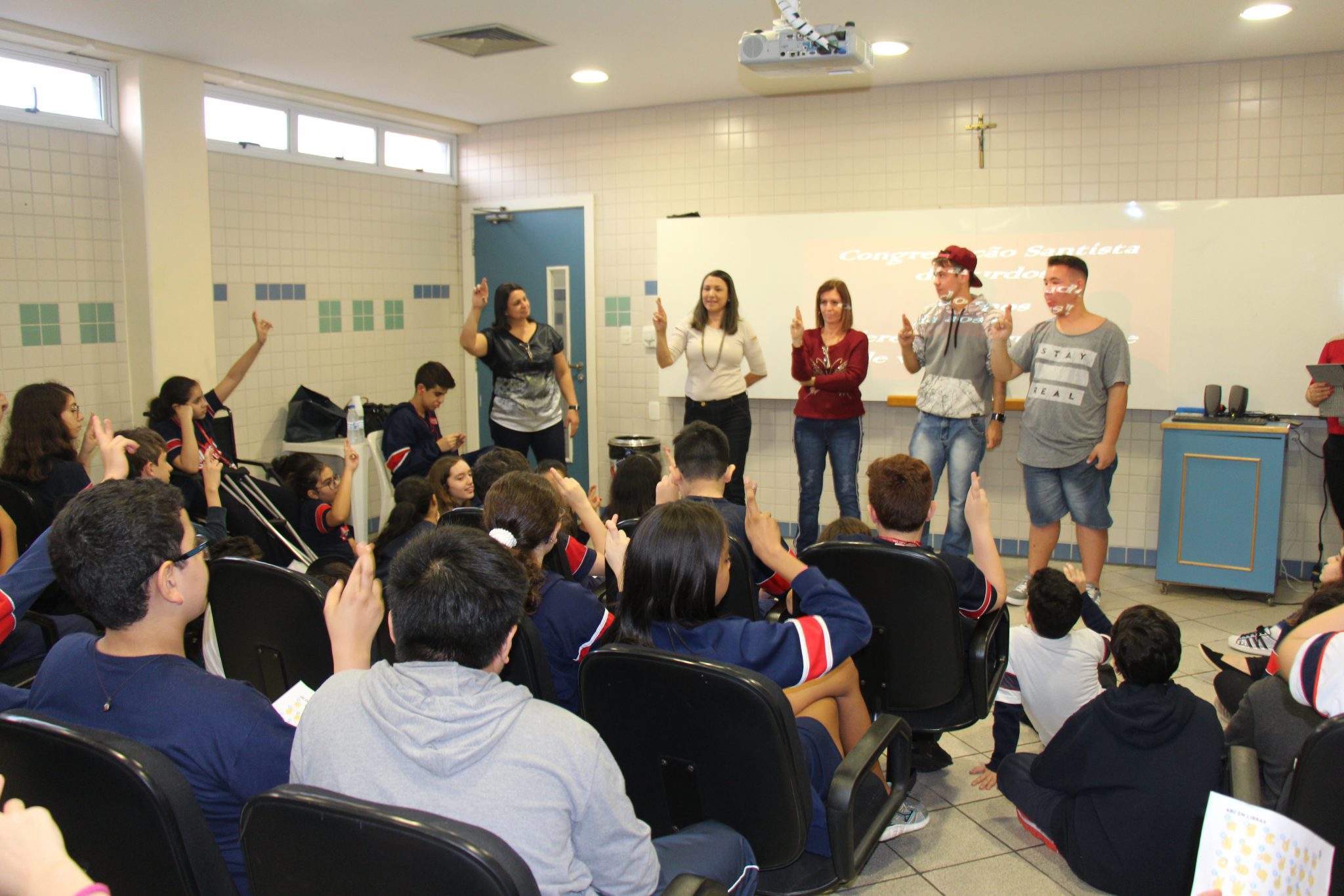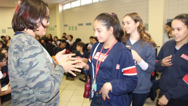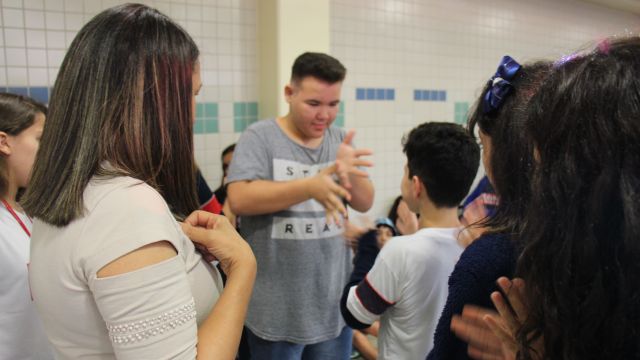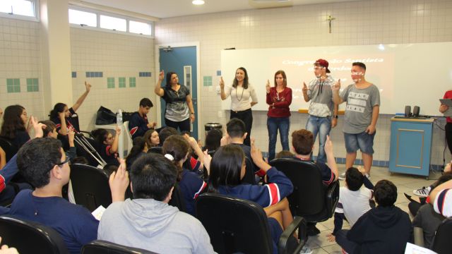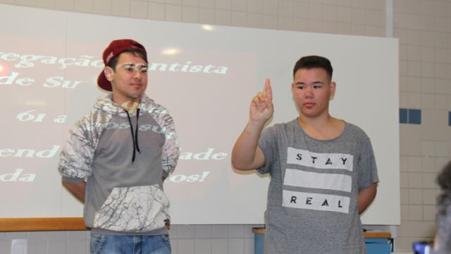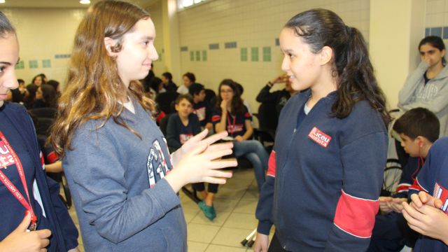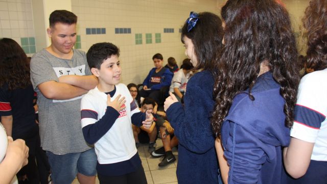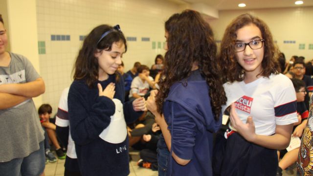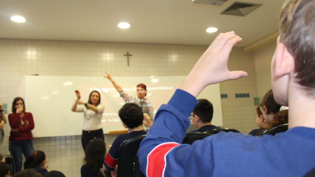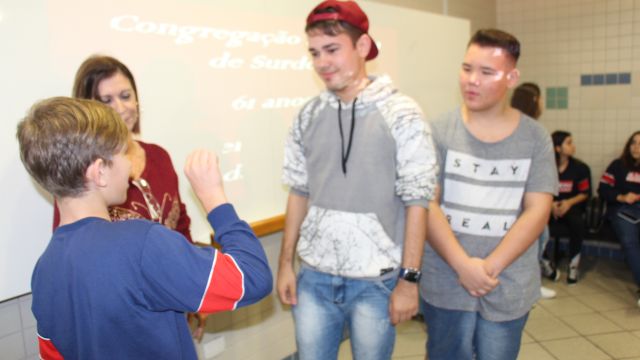 Os alunos do 7º ano do Ensino Fundamental tiveram a oportunidade de conversar, por meio das LIBRAS (Língua Brasileira de Sinais), com estudantes que participam de atividades na Congregação Santista de Surdos.