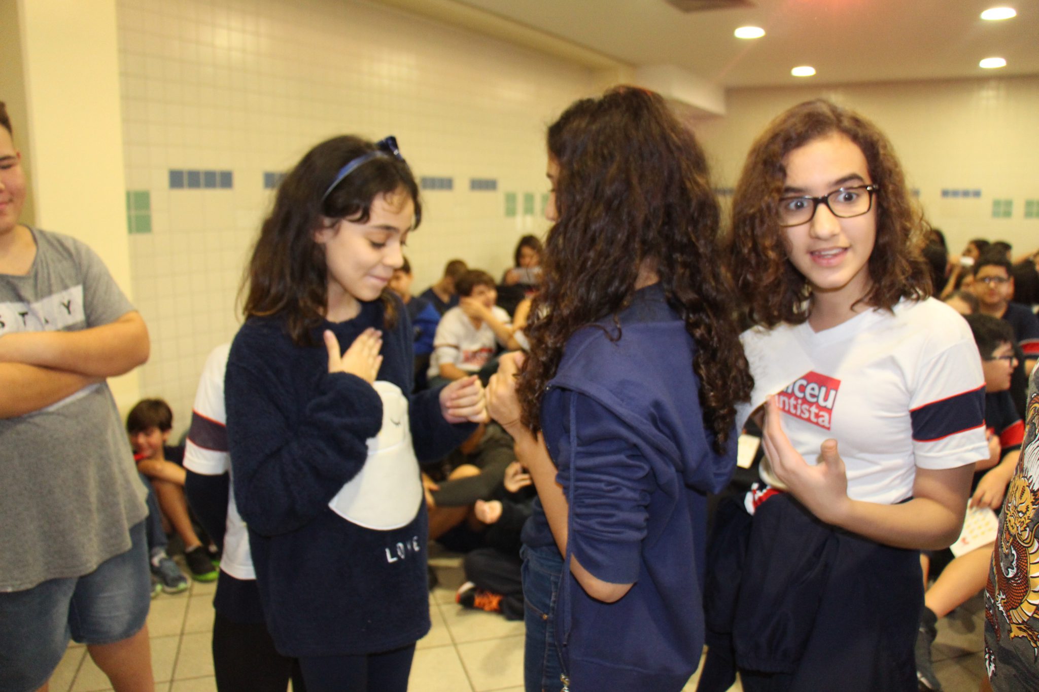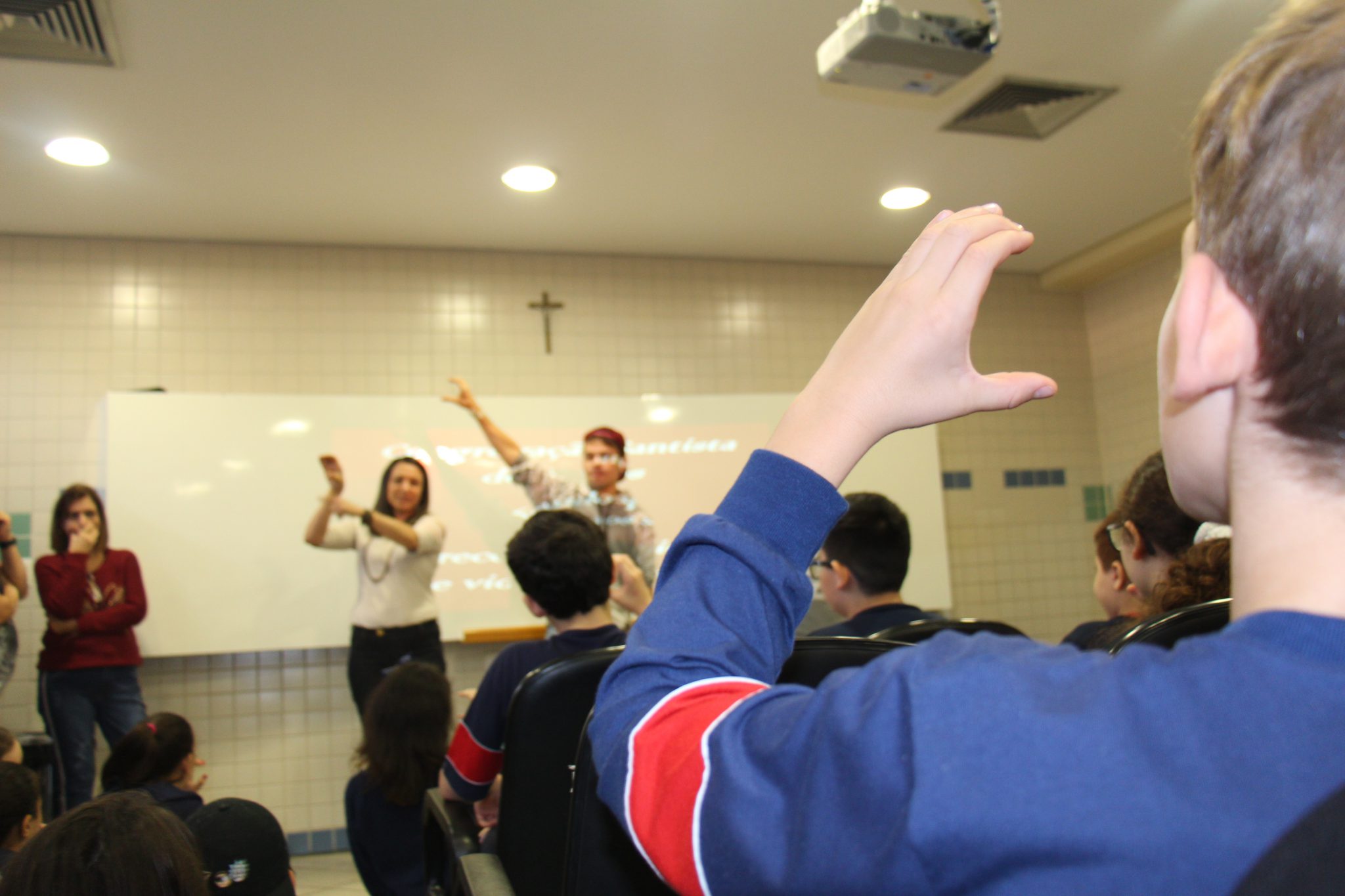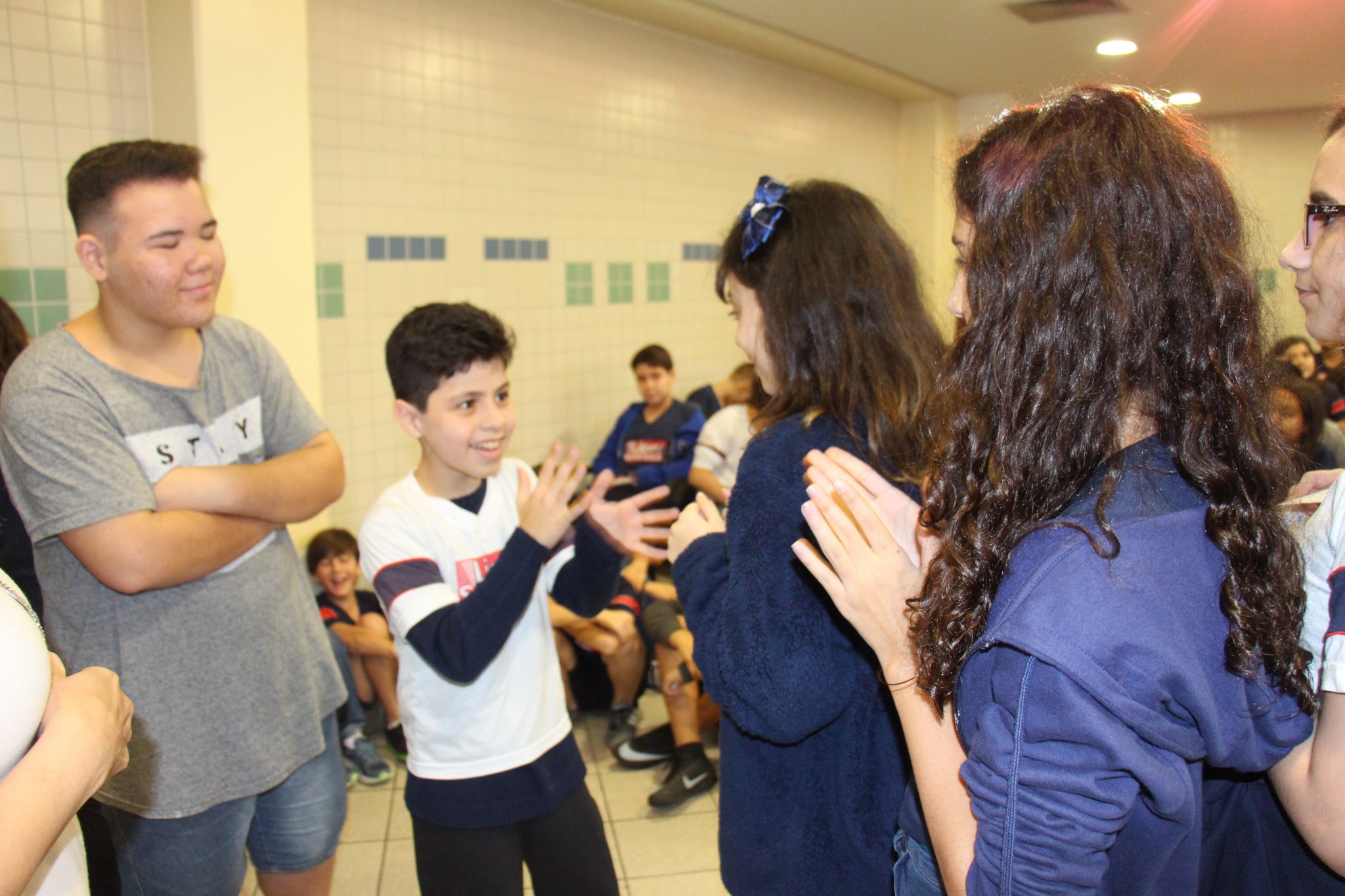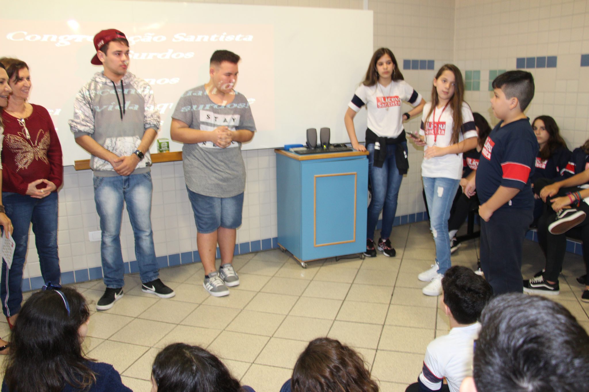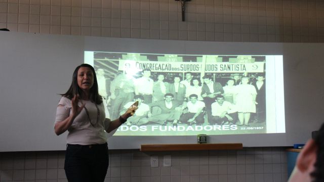 Os alunos do 7º ano do Ensino Fundamental tiveram a oportunidade de conversar, por meio das LIBRAS (Língua Brasileira de Sinais), com estudantes que participam de atividades na Congregação Santista de Surdos.