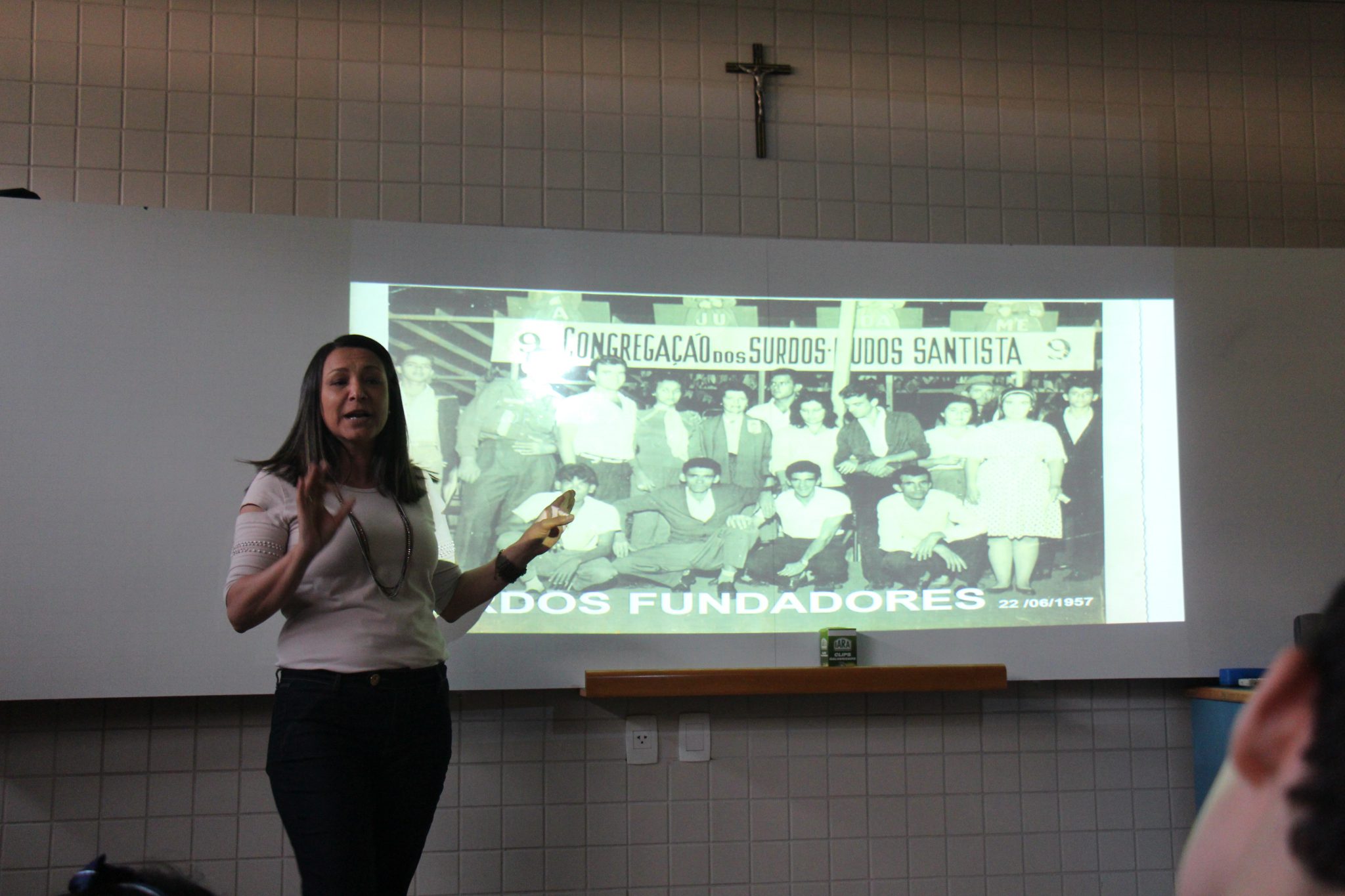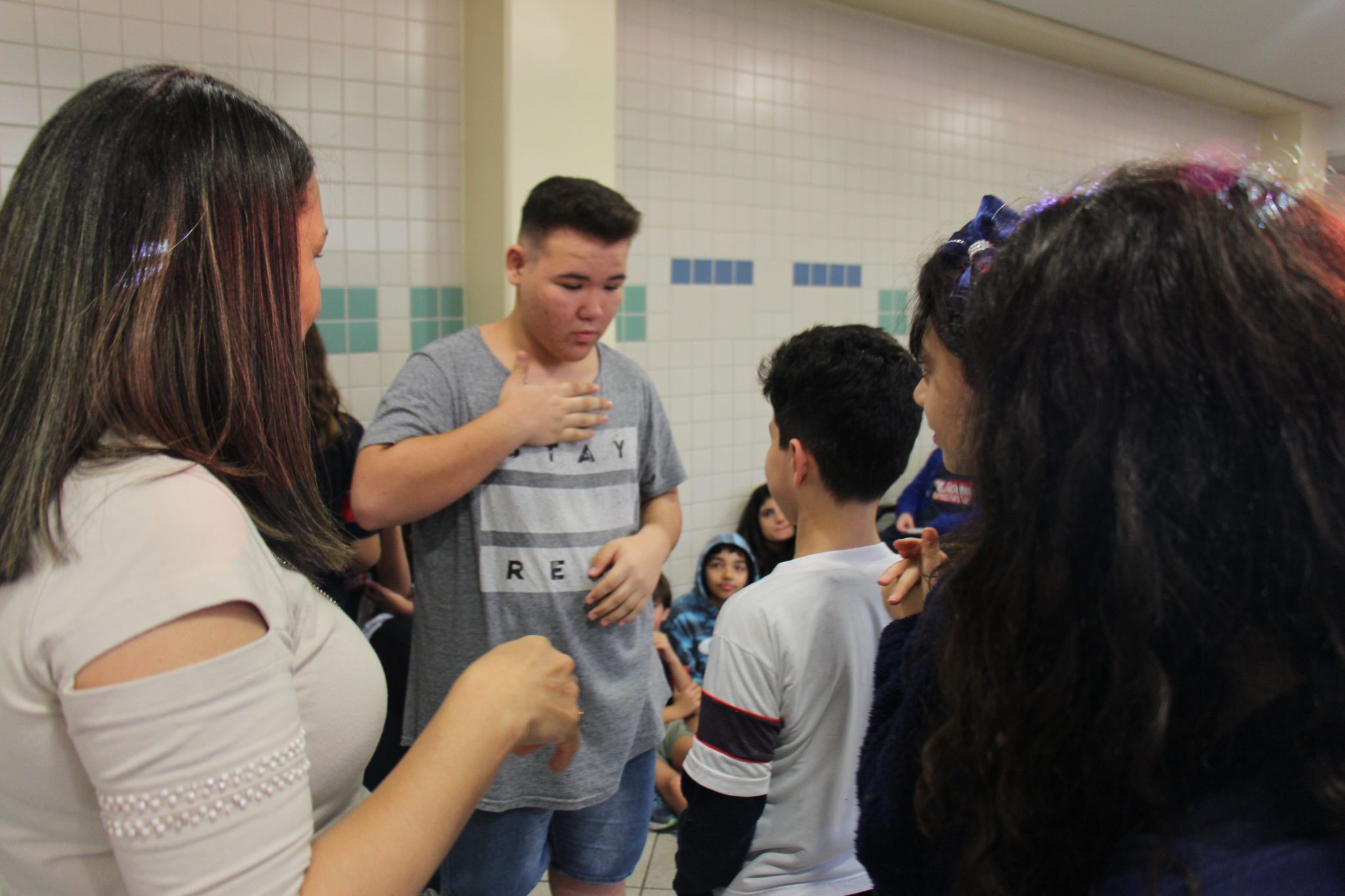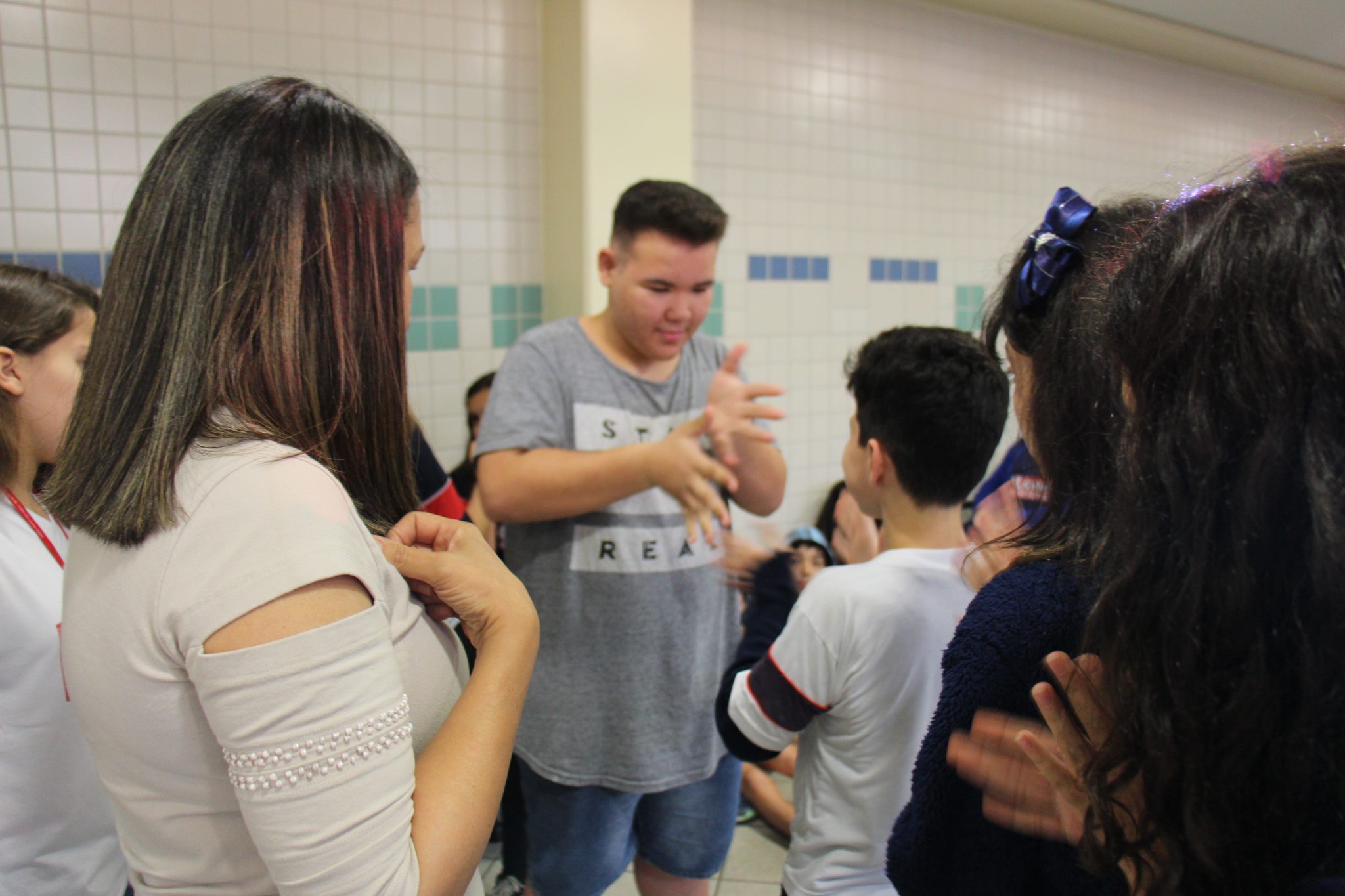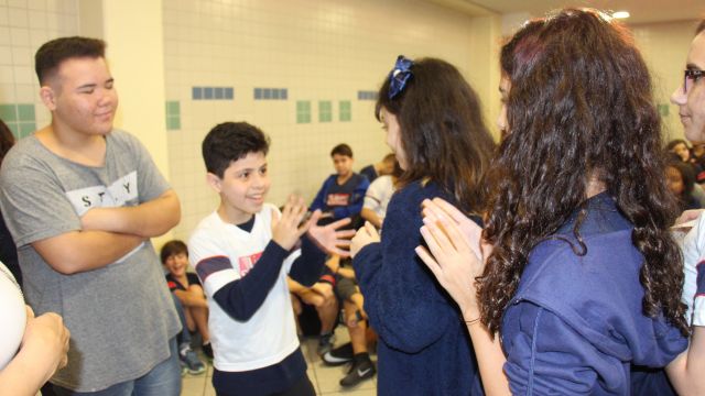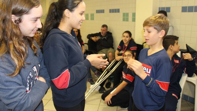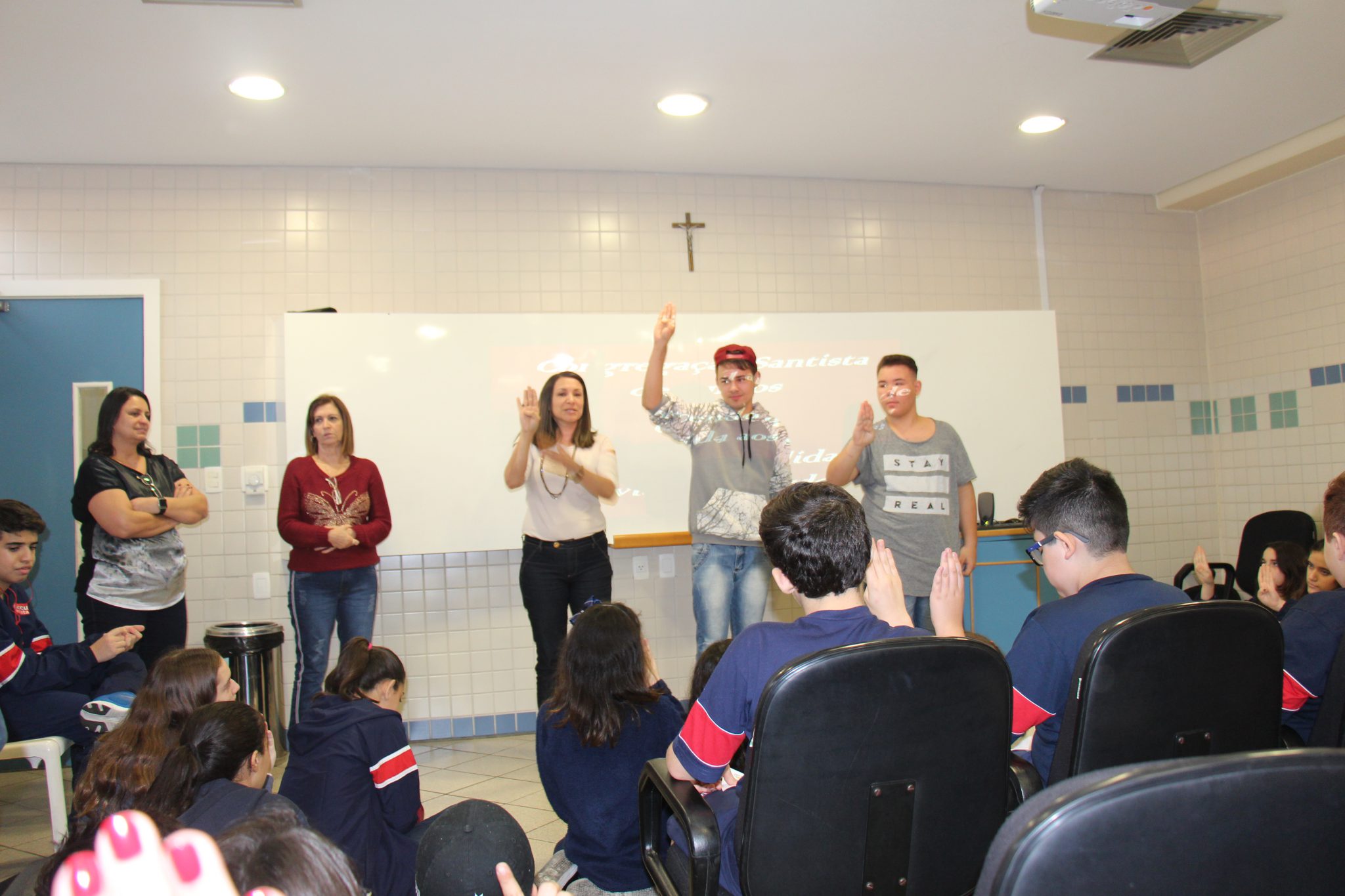 Os alunos do 7º ano do Ensino Fundamental tiveram a oportunidade de conversar, por meio das LIBRAS (Língua Brasileira de Sinais), com estudantes que participam de atividades na Congregação Santista de Surdos.