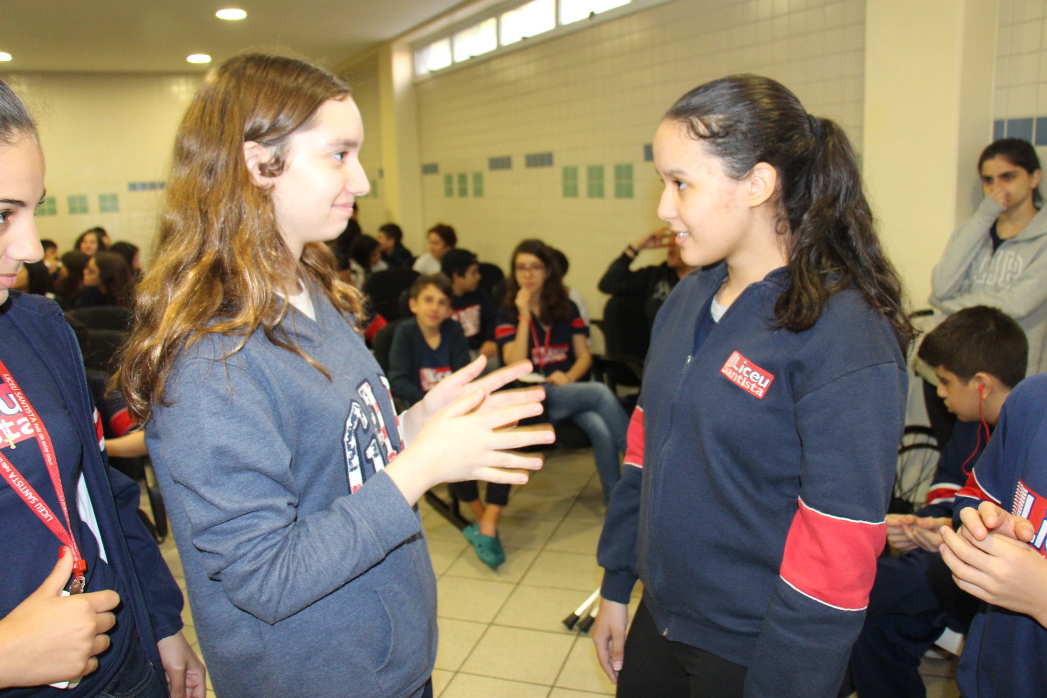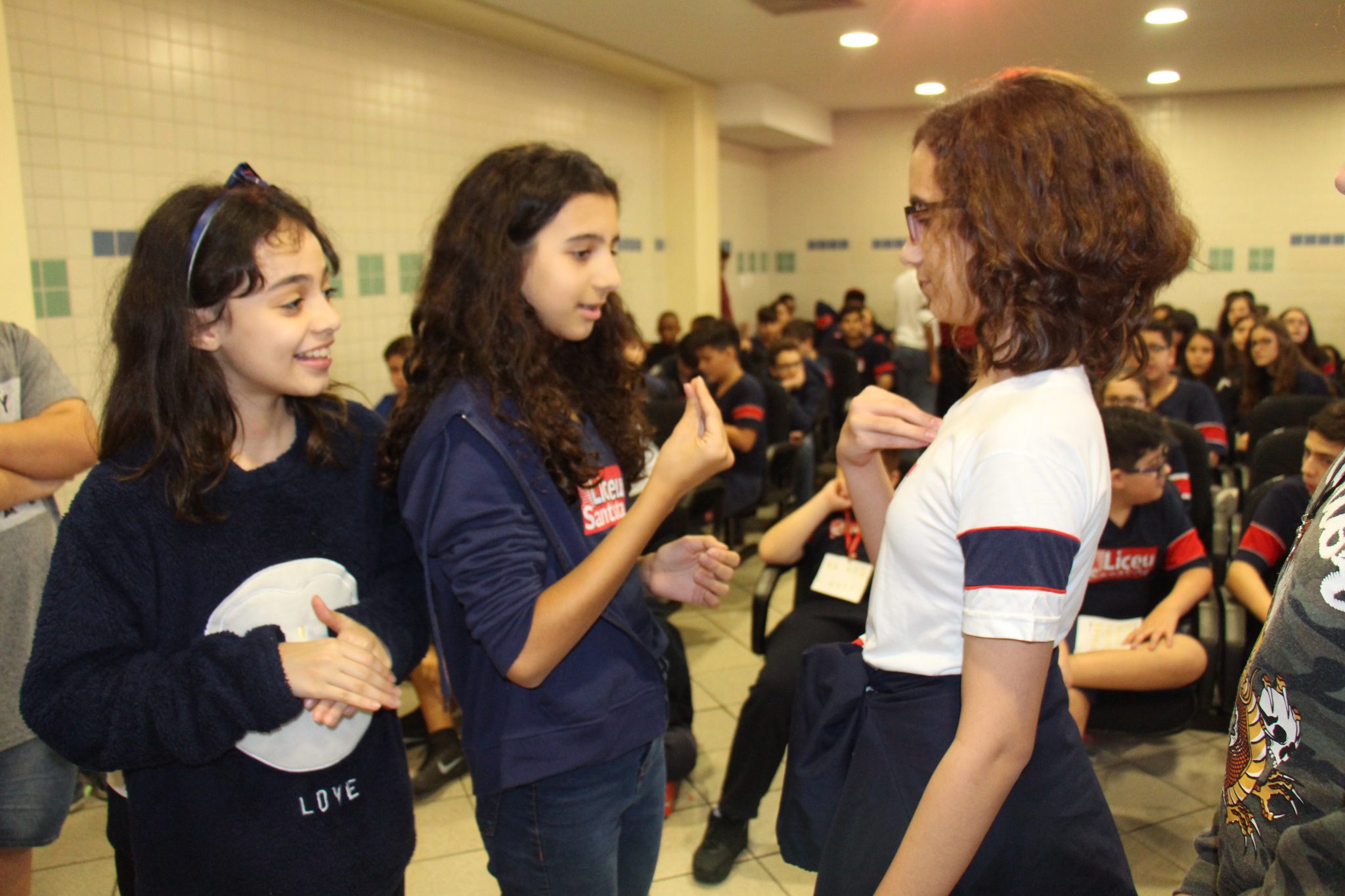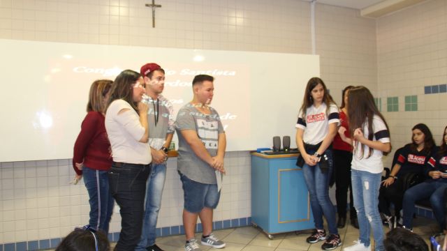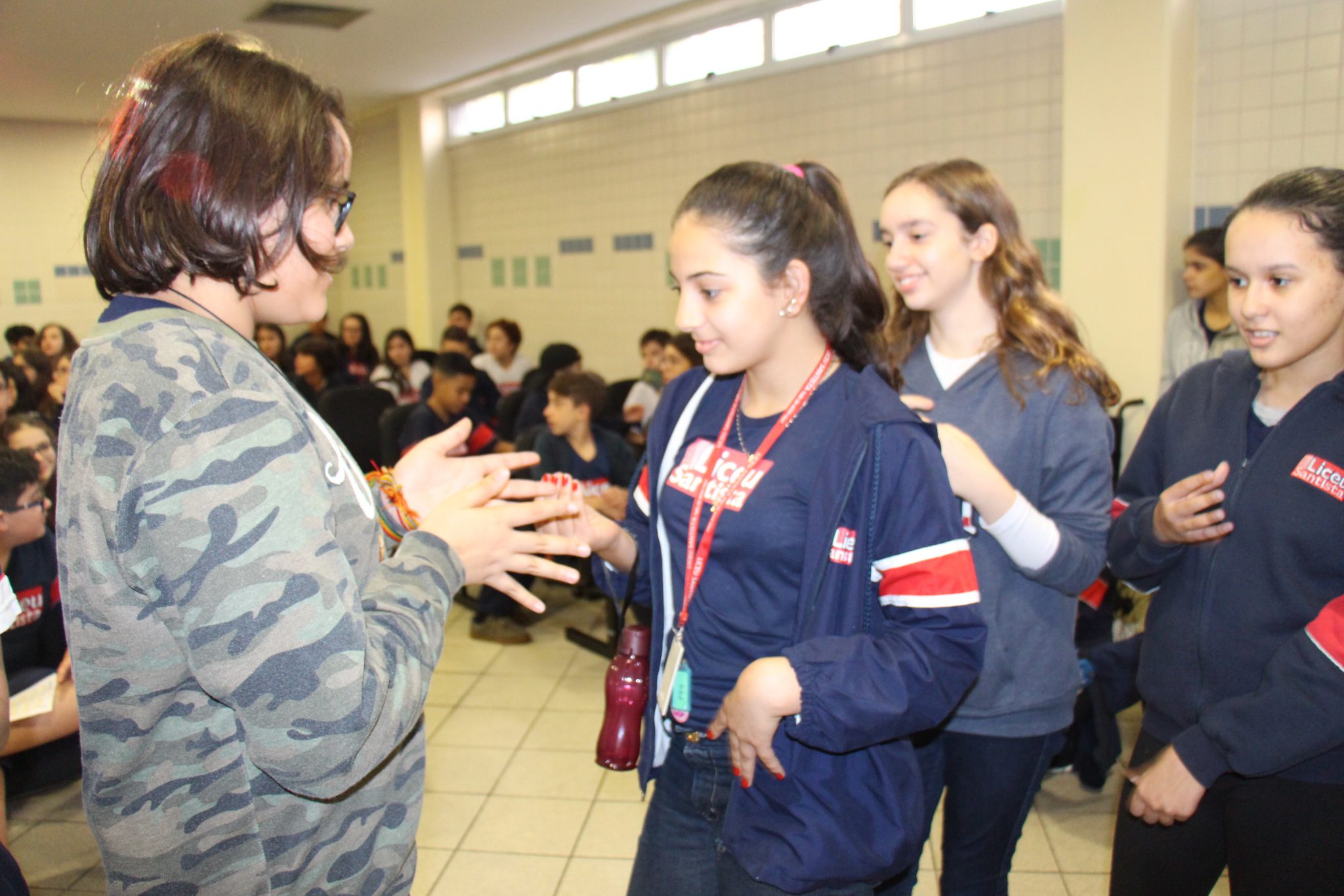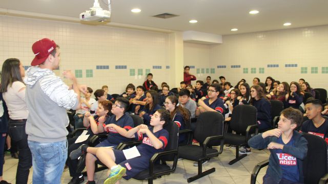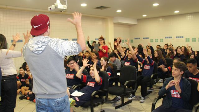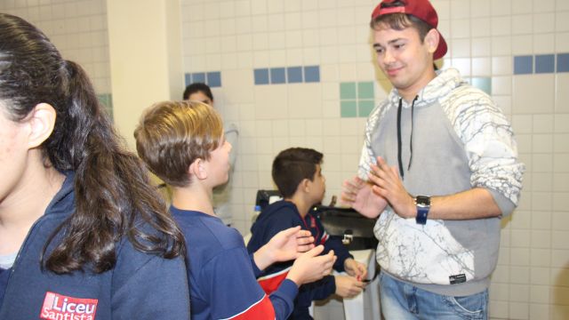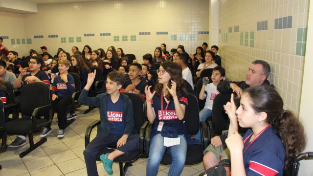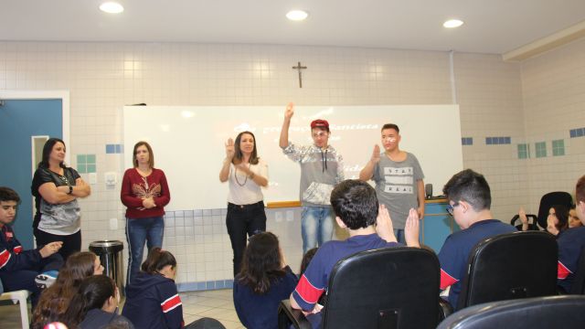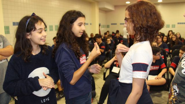 Durante as aulas de Ensino Religioso, os liceístas pesquisaram o alfabeto em LIBRAS e expressões de rápida comunicação, como agradecimentos, cumprimentos e apresentação pessoal. No dia do encontro, puderam interagir com os rapazes na língua de sinais e aprender novas palavras.