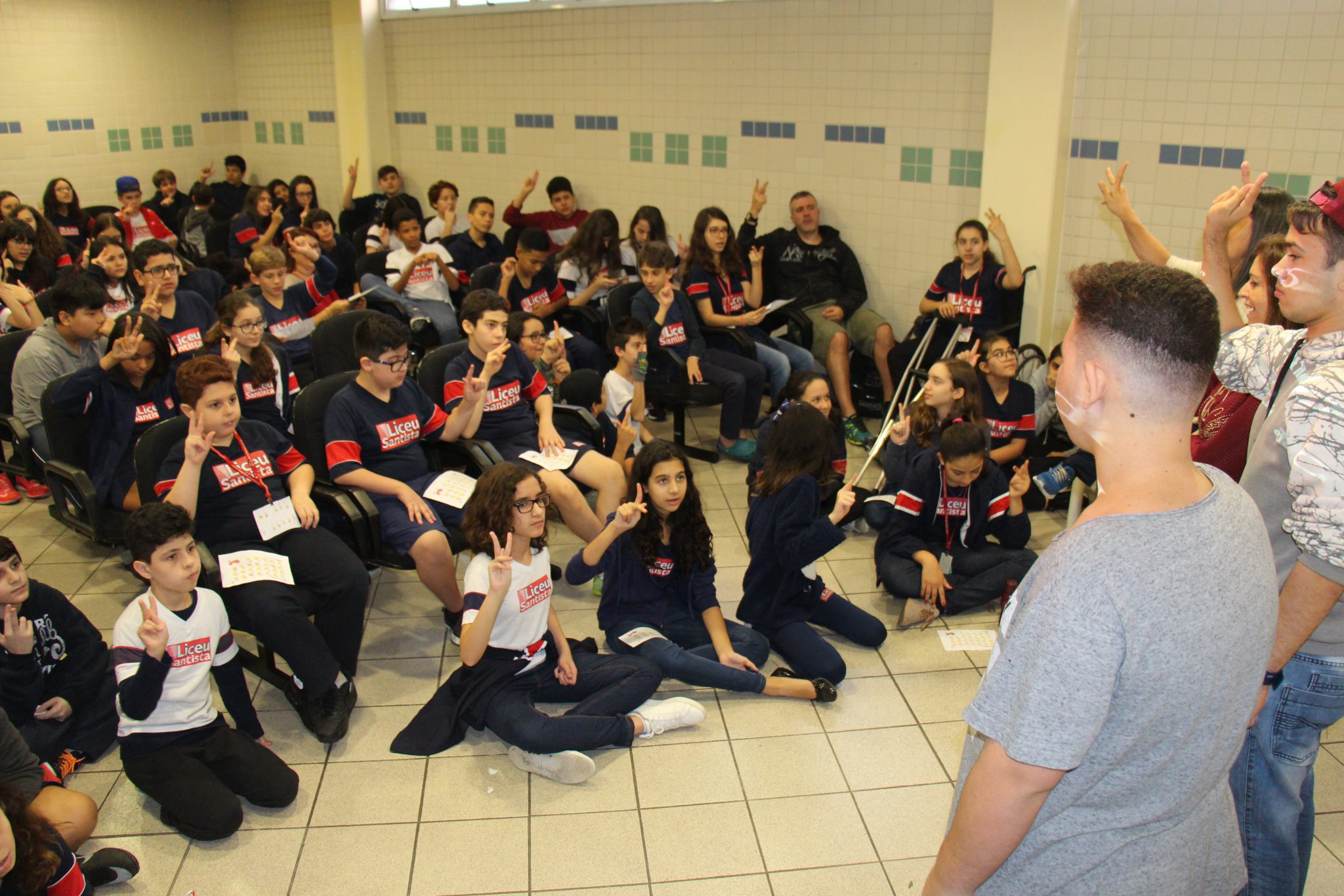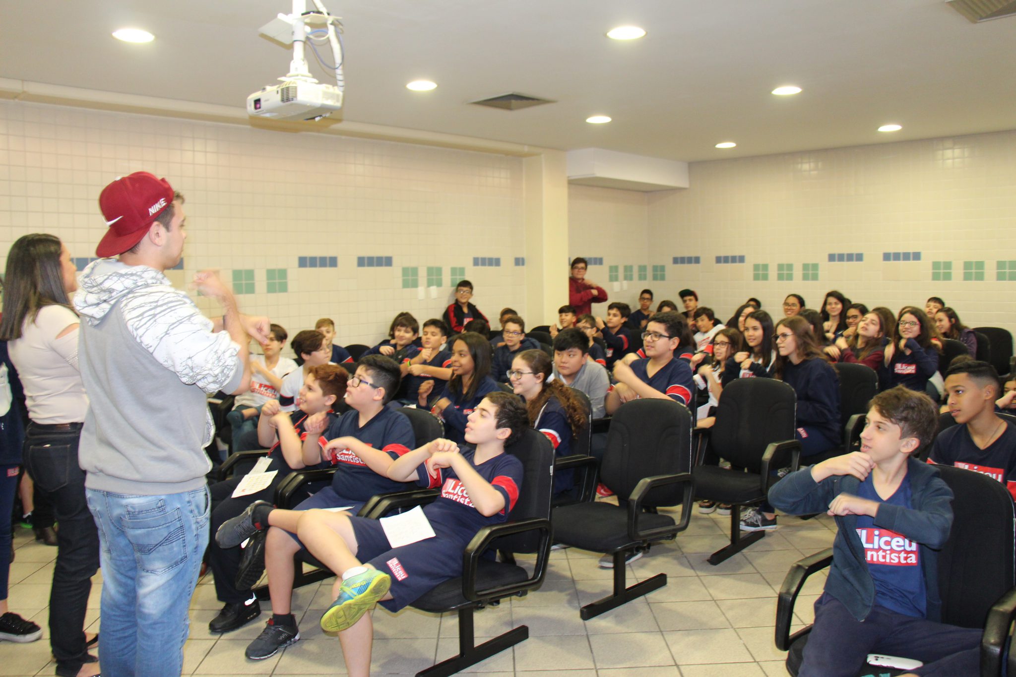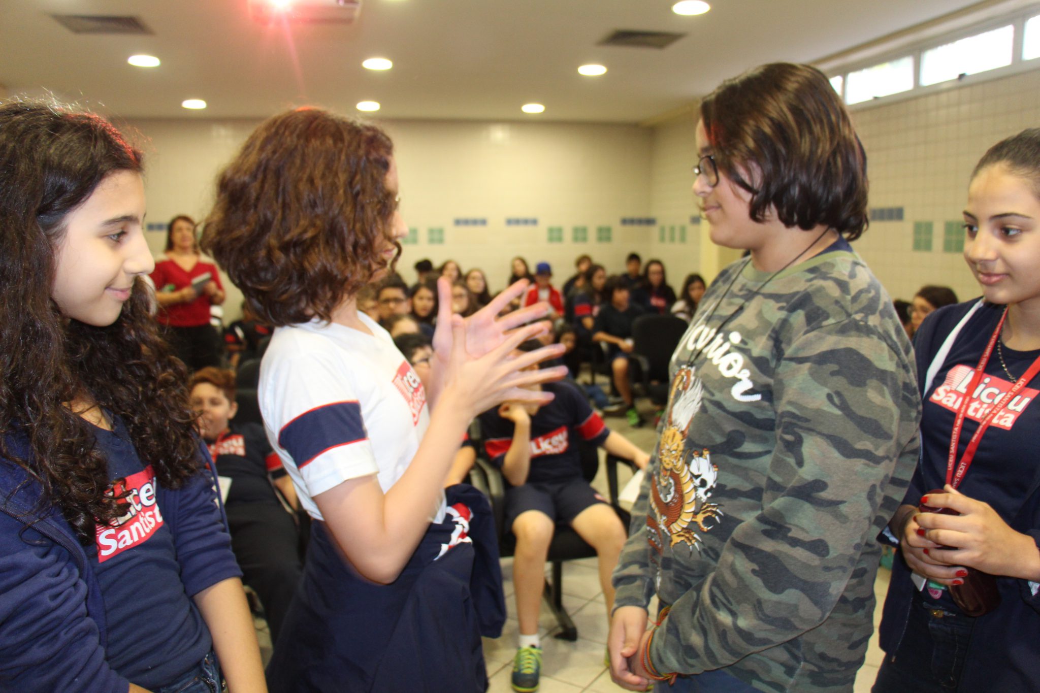 Durante as aulas de Ensino Religioso, os liceístas pesquisaram o alfabeto em LIBRAS e expressões de rápida comunicação, como agradecimentos, cumprimentos e apresentação pessoal. No dia do encontro, puderam interagir com os rapazes na língua de sinais e aprender novas palavras.