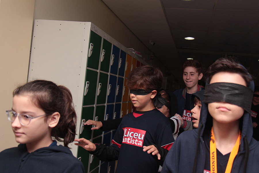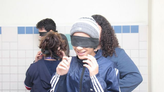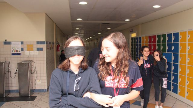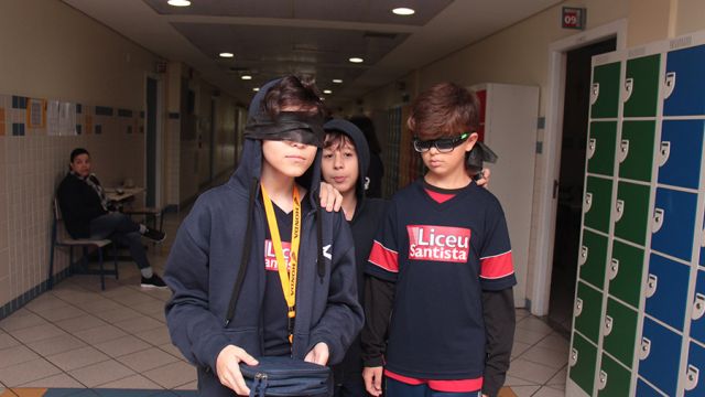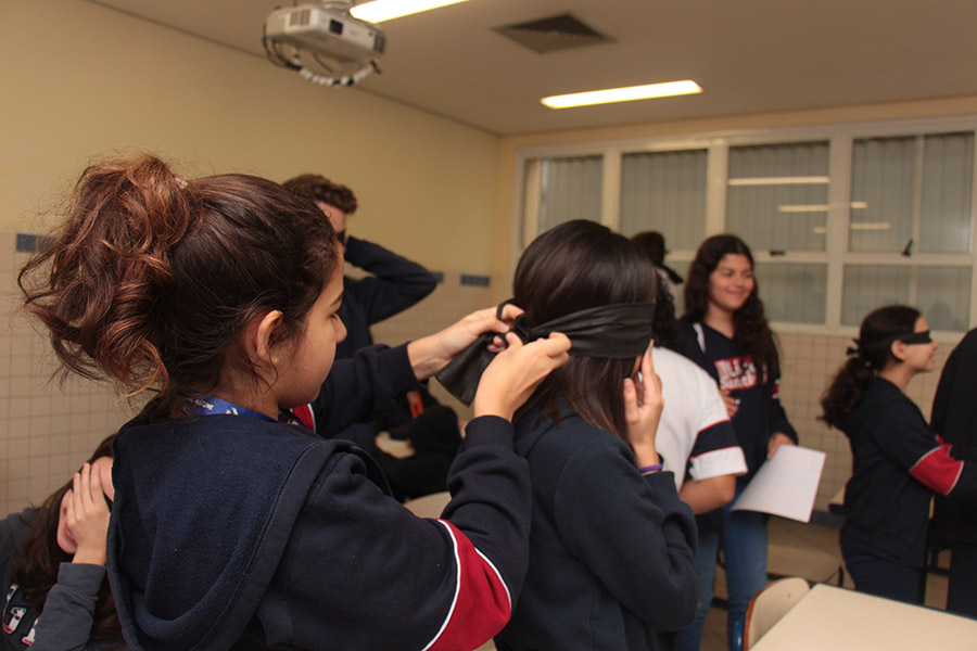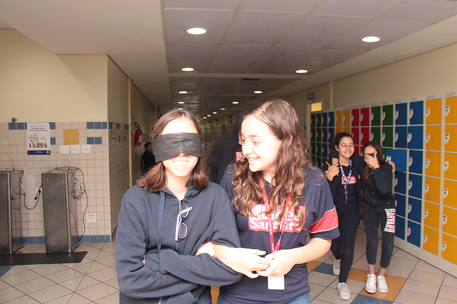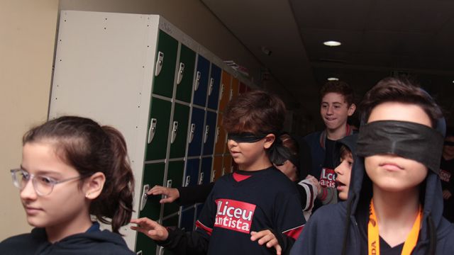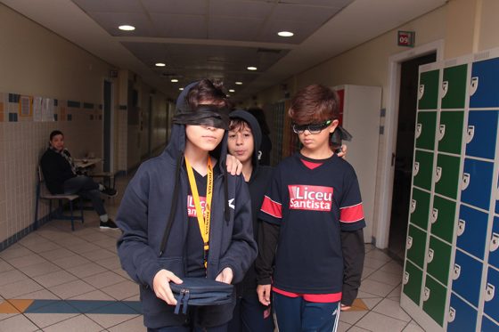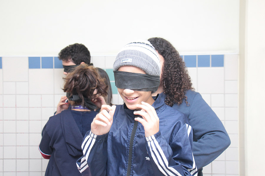 A situação de dependência dos alunos vendados também foi experimentada ao percorrerem o corredor, quando precisaram de auxílio para não tropeçar uns nos outros nem esbarrar nos armários.