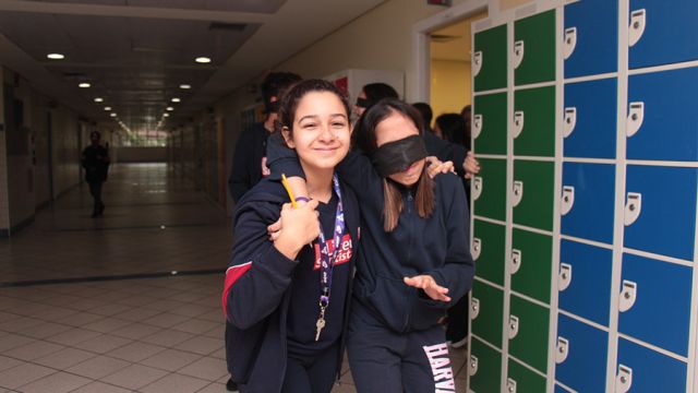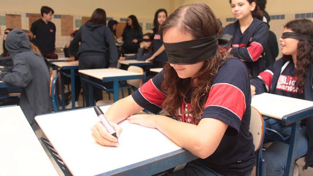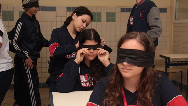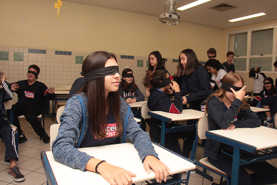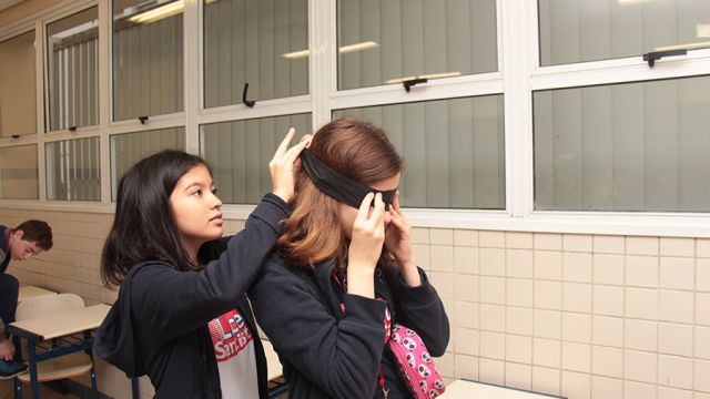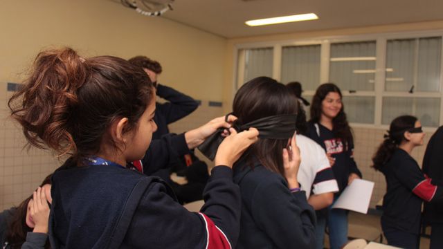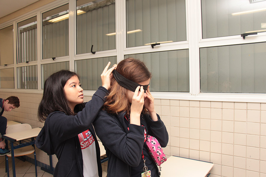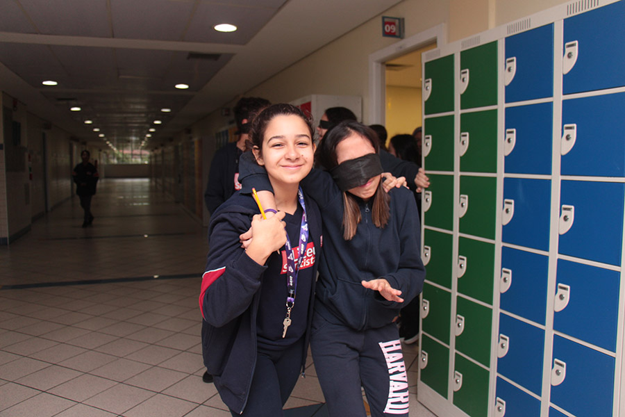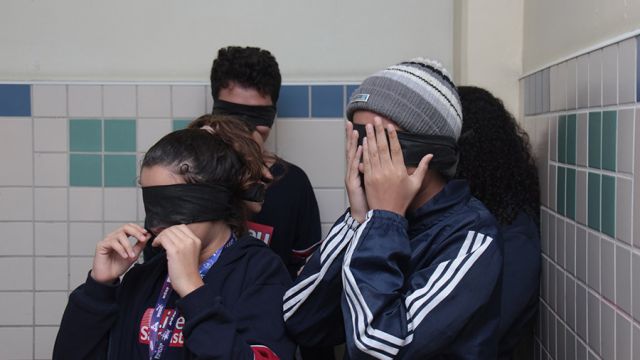A situação de dependência dos alunos vendados também foi experimentada ao percorrerem o corredor, quando precisaram de auxílio para não tropeçar uns nos outros nem esbarrar nos armários.