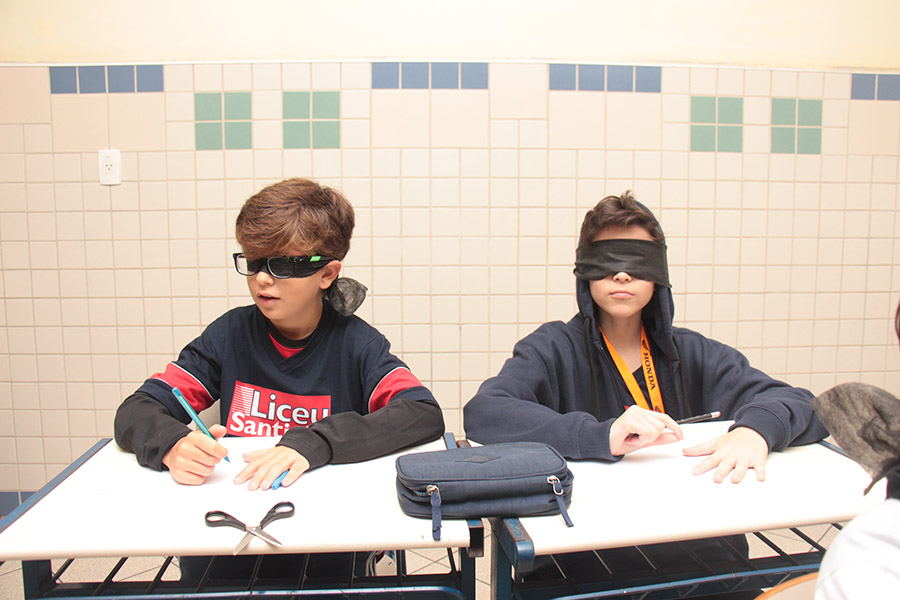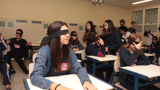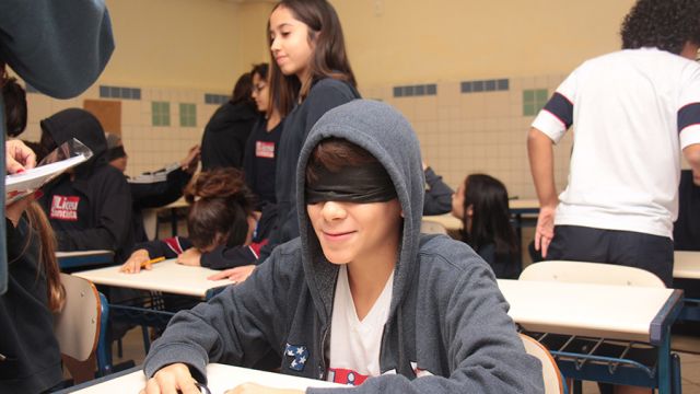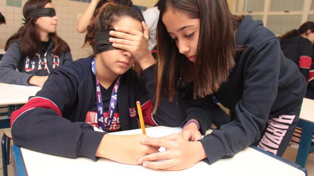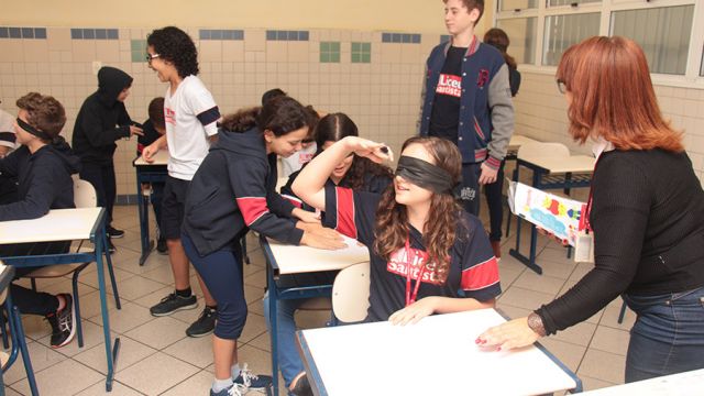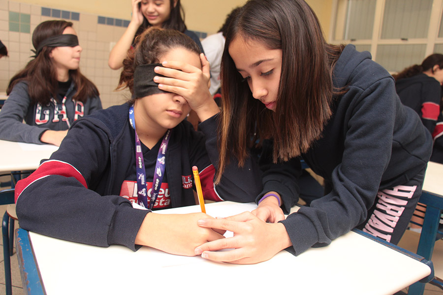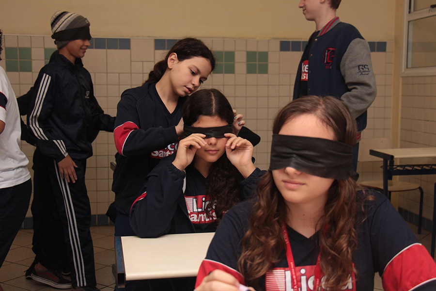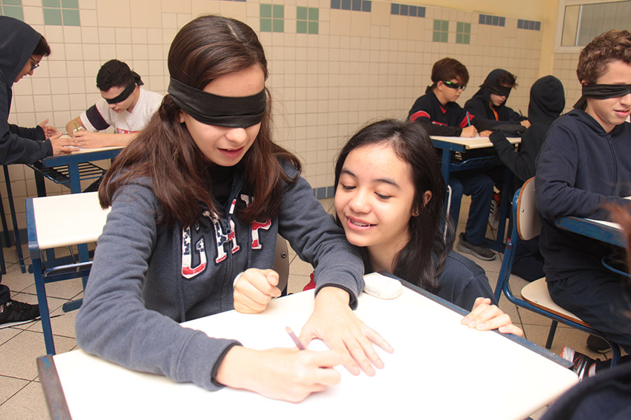 Colocar-se no lugar do outro e sentir as dificuldades pelas quais ele passa é um exercício de empatia. O projeto “Os desafios para a inclusão”, desenvolvido com alunos do 7º ano do Ensino Fundamental com base na Declaração Universal dos Direitos Humanos, teve esse intuito: oferecer a eles uma vivência para que possam replicar ações solidárias sempre que elas se fizerem necessárias, seja na própria escola, seja no dia a dia fora dela.
