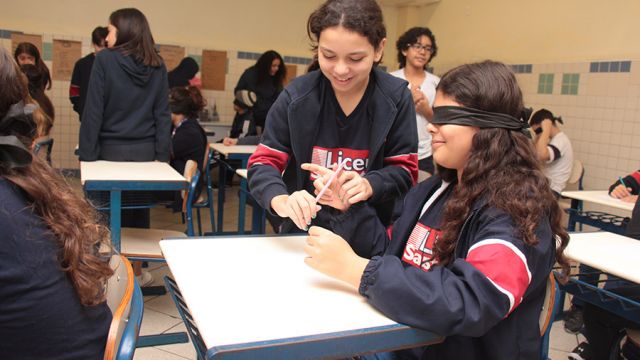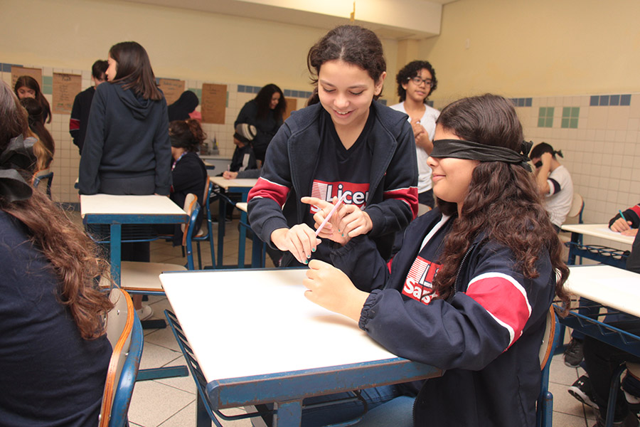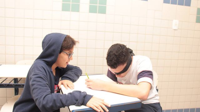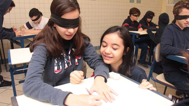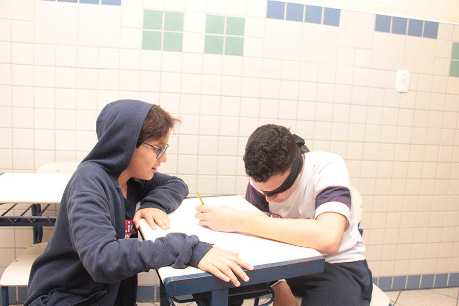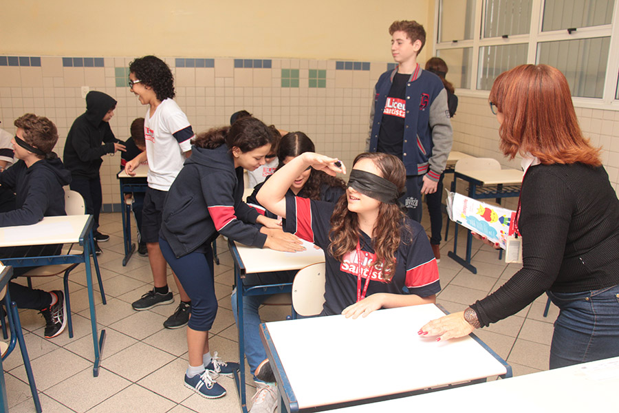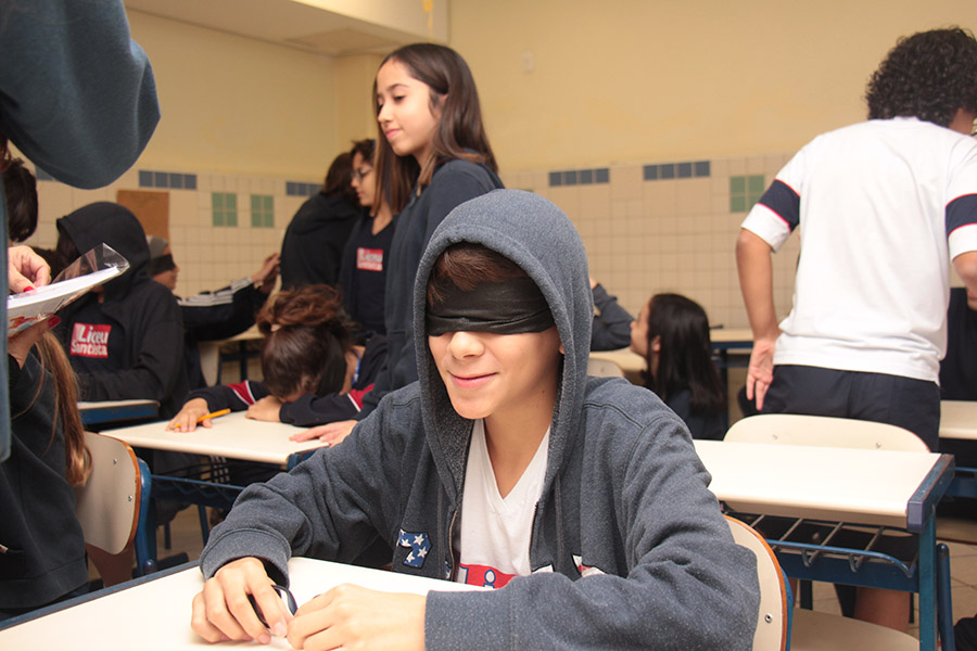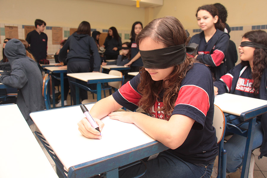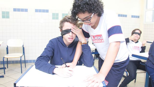 Acompanhada pela professora de Ensino Religioso, Rosemeire Ribeiro Abreu, a dinâmica “Guia de cego” foi uma atividade realizada em sala de aula em que um grupo de estudantes teve os olhos vendados e outro grupo serviu de guia na realização de algumas tarefas, como escrever o nome em uma folha de papel.