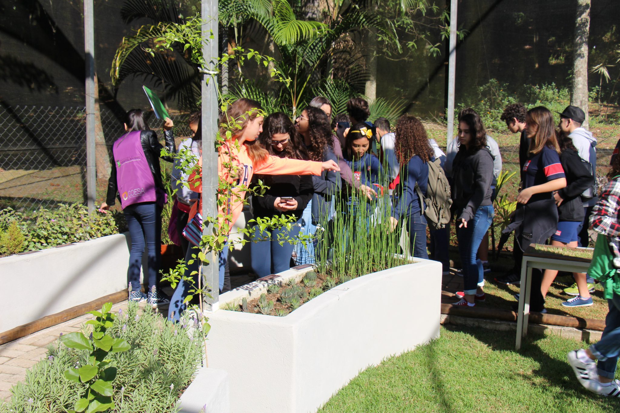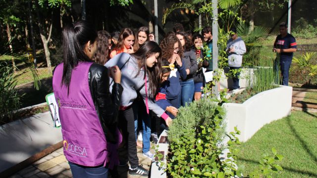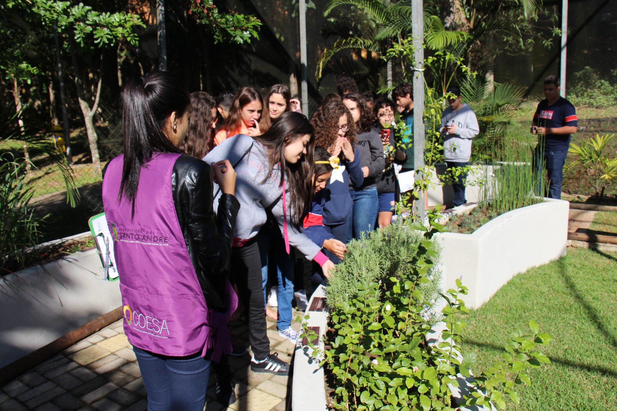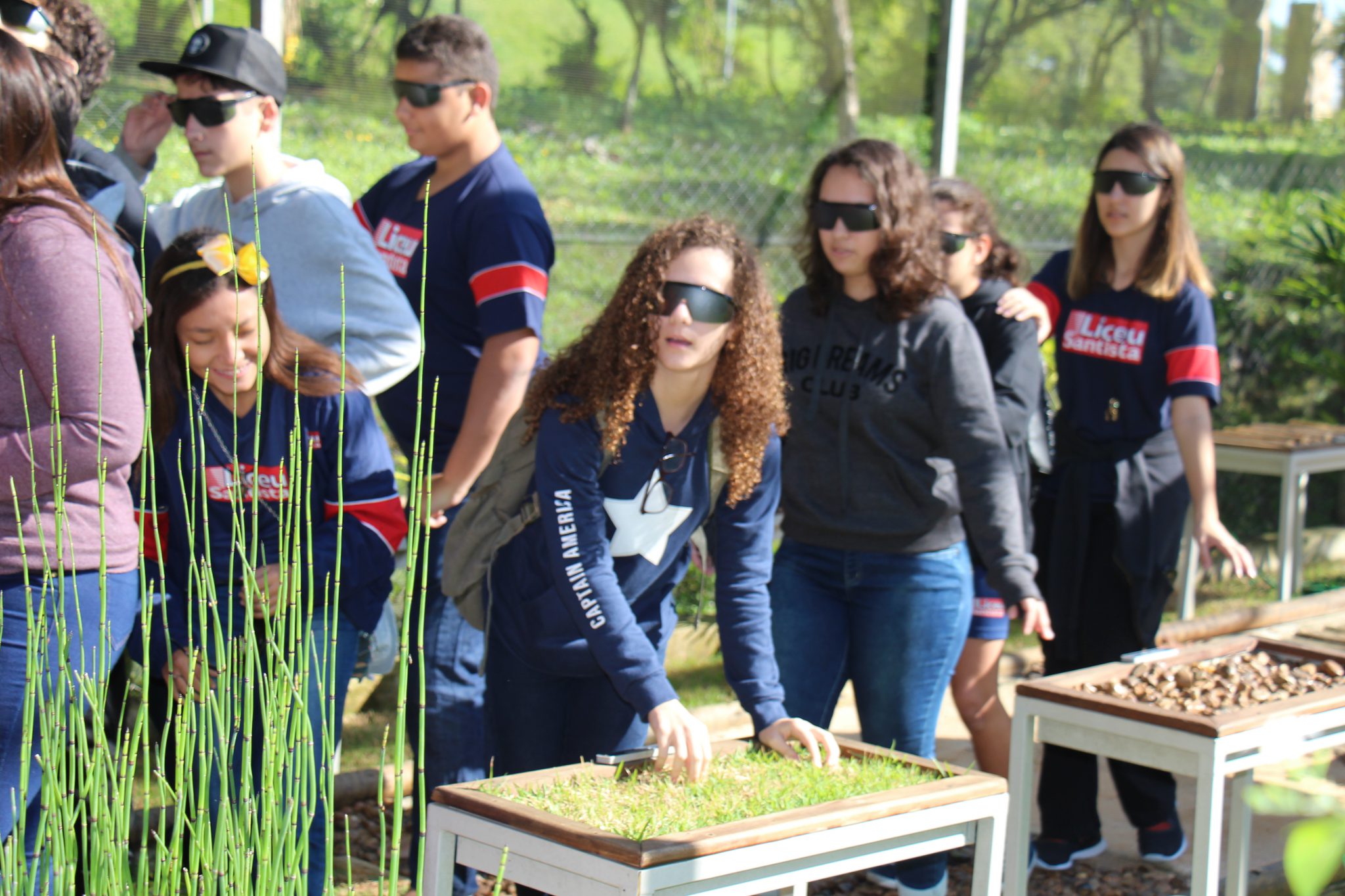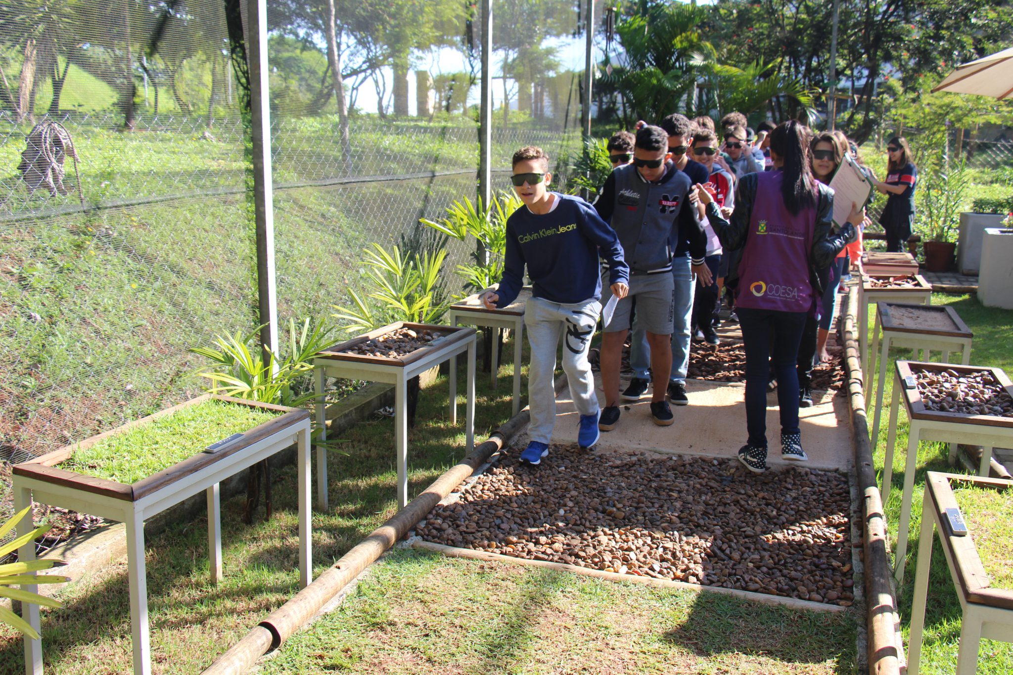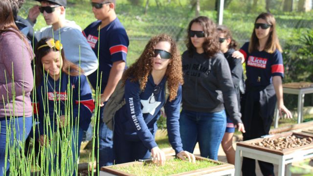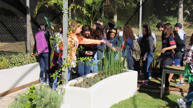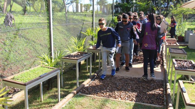 Uma vivência realizada no jardim sensorial buscou estimular todos os sentidos dos alunos. Antes de entrar, prestaram atenção aos sons do entorno do parque. Em seguida, de olhos vendados, os estudantes que optaram por tirar os tênis experimentaram o tato, pisando em grama, seixos e areia. Sentiram aromas de ervas perfumadas, como alecrim e hortelã, e degustaram outras como manjericão e orégano fresco.