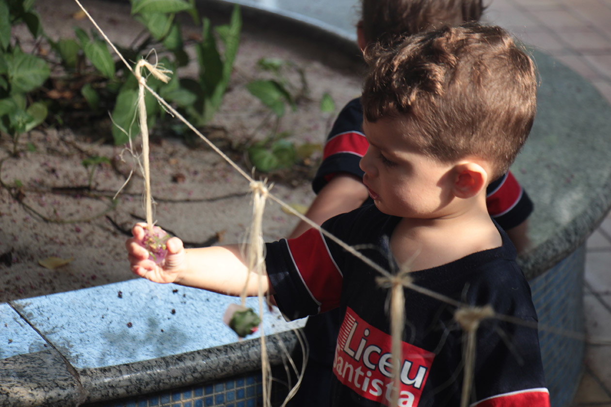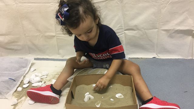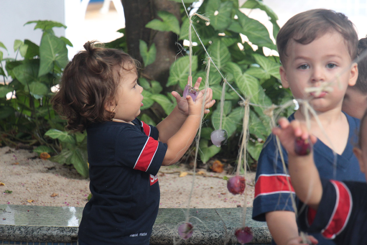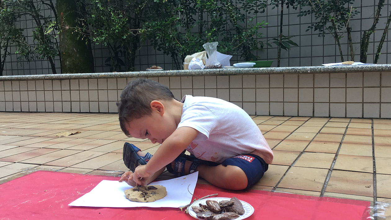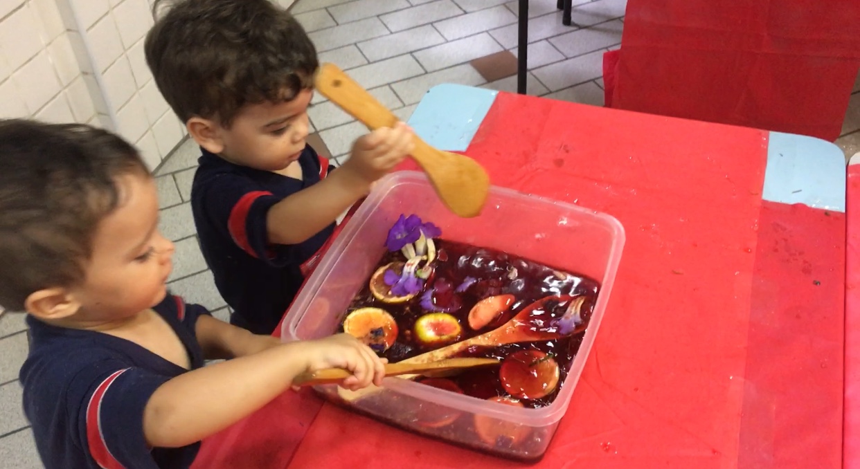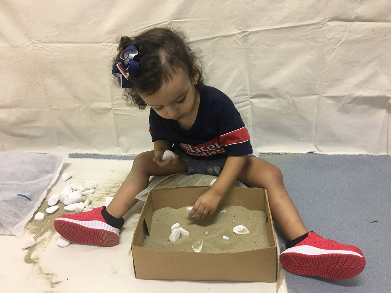 As crianças sentiram o aroma de flores, sua maciez, identificaram o formato irregular das pedras, trabalharam com argila, gravetos, sementes e folhas. Sentiram a delicadeza da areia fininha e a rigidez dos seixos (pedras sem pontas), as sensações de surpresa ao tocarem pedrinhas coloridas de gelo.