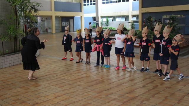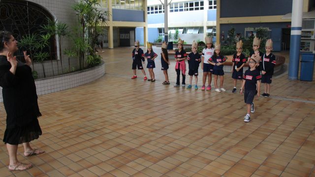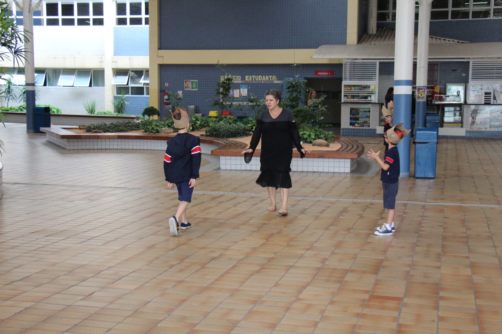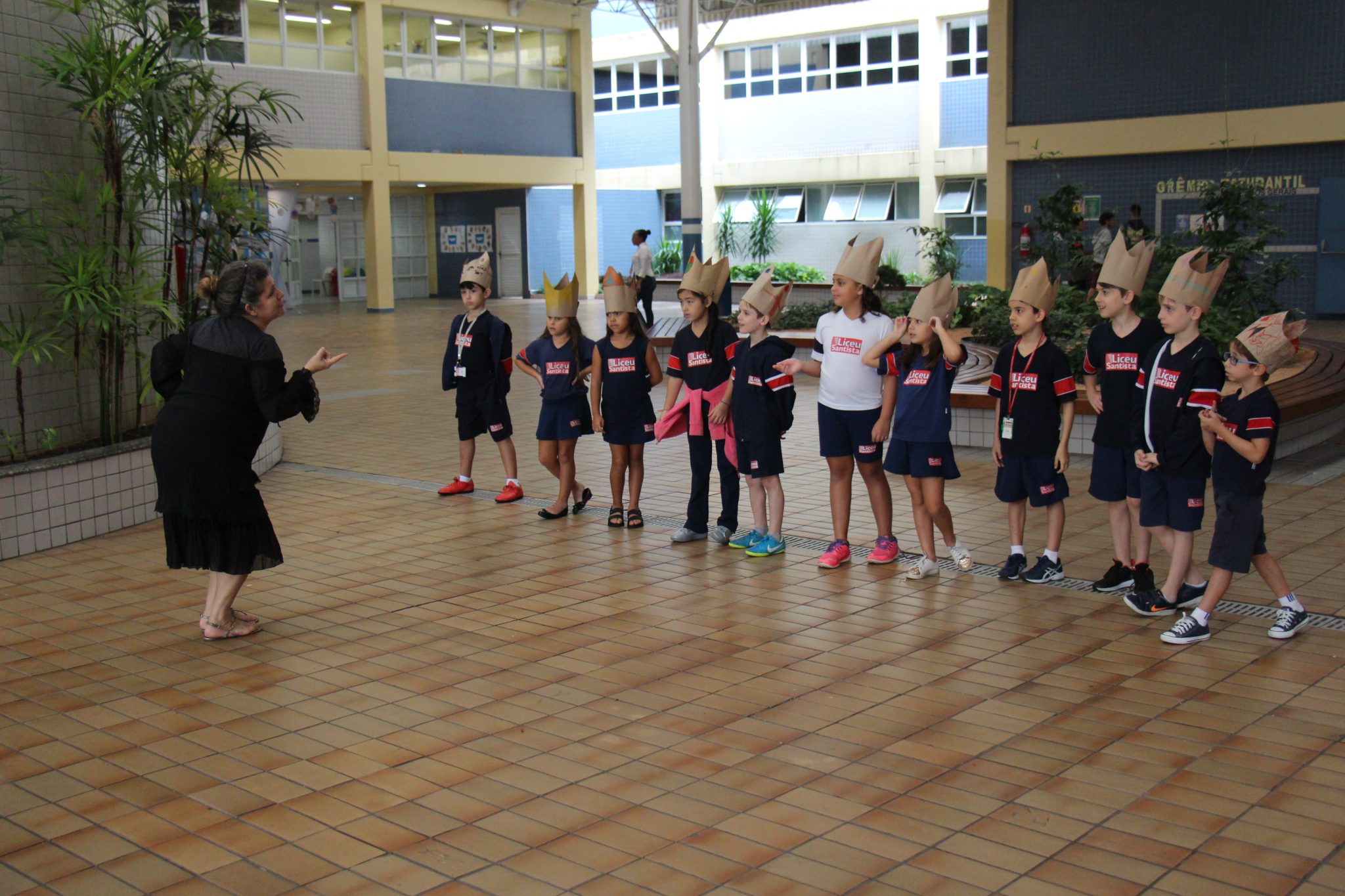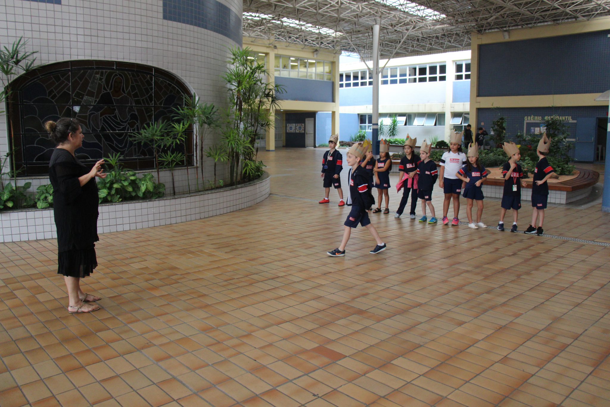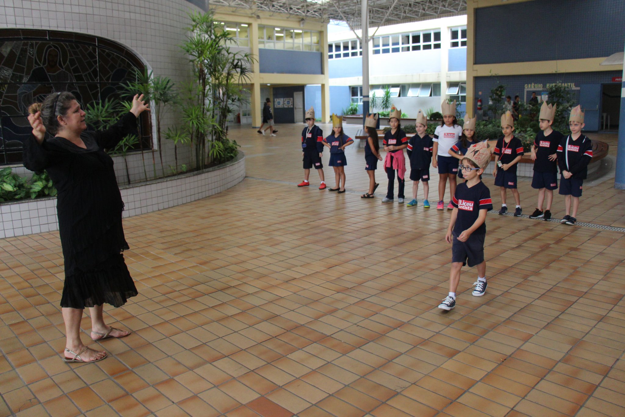 Caracterizada de Rainha Negra, a professora de xadrez Cris Furtado comandou os alunos do 2º ano do Ensino Fundamental que frequentam o Período Ampliado na movimentação daquela peça no tabuleiro. A atividade, realizada no pátio da escola com as crianças “vestindo” a personagem, segue apresentando cada um dos seis componentes do jogo: peão, torre, cavalo, bispo, rainha e rei.