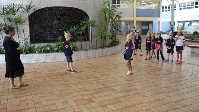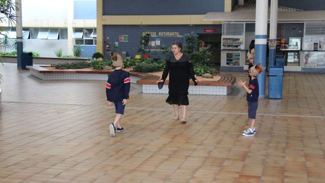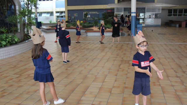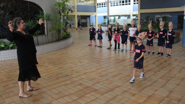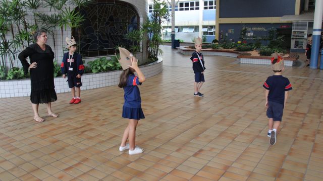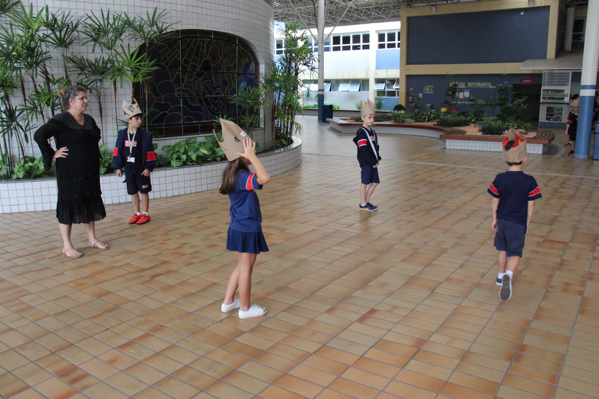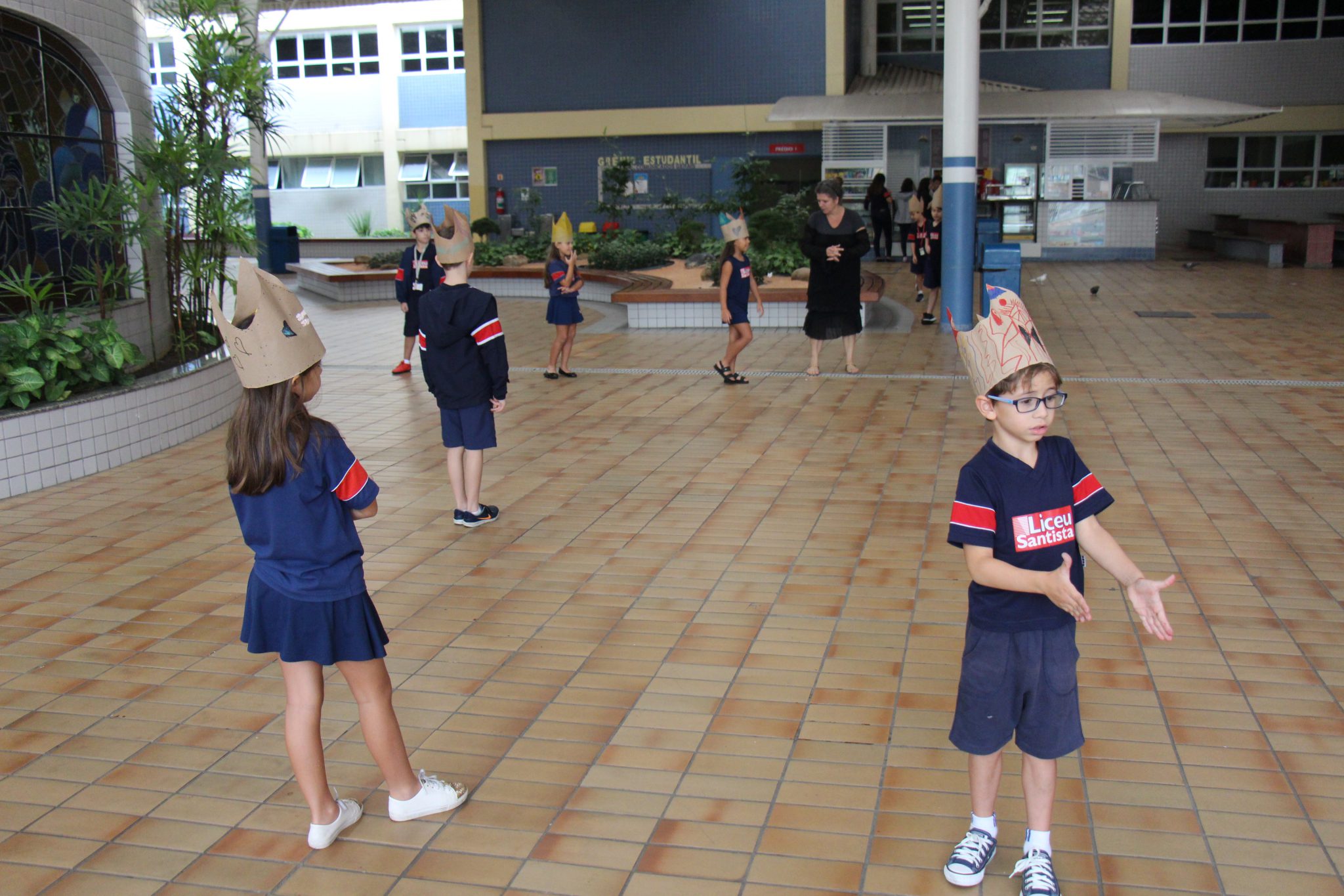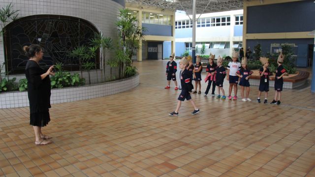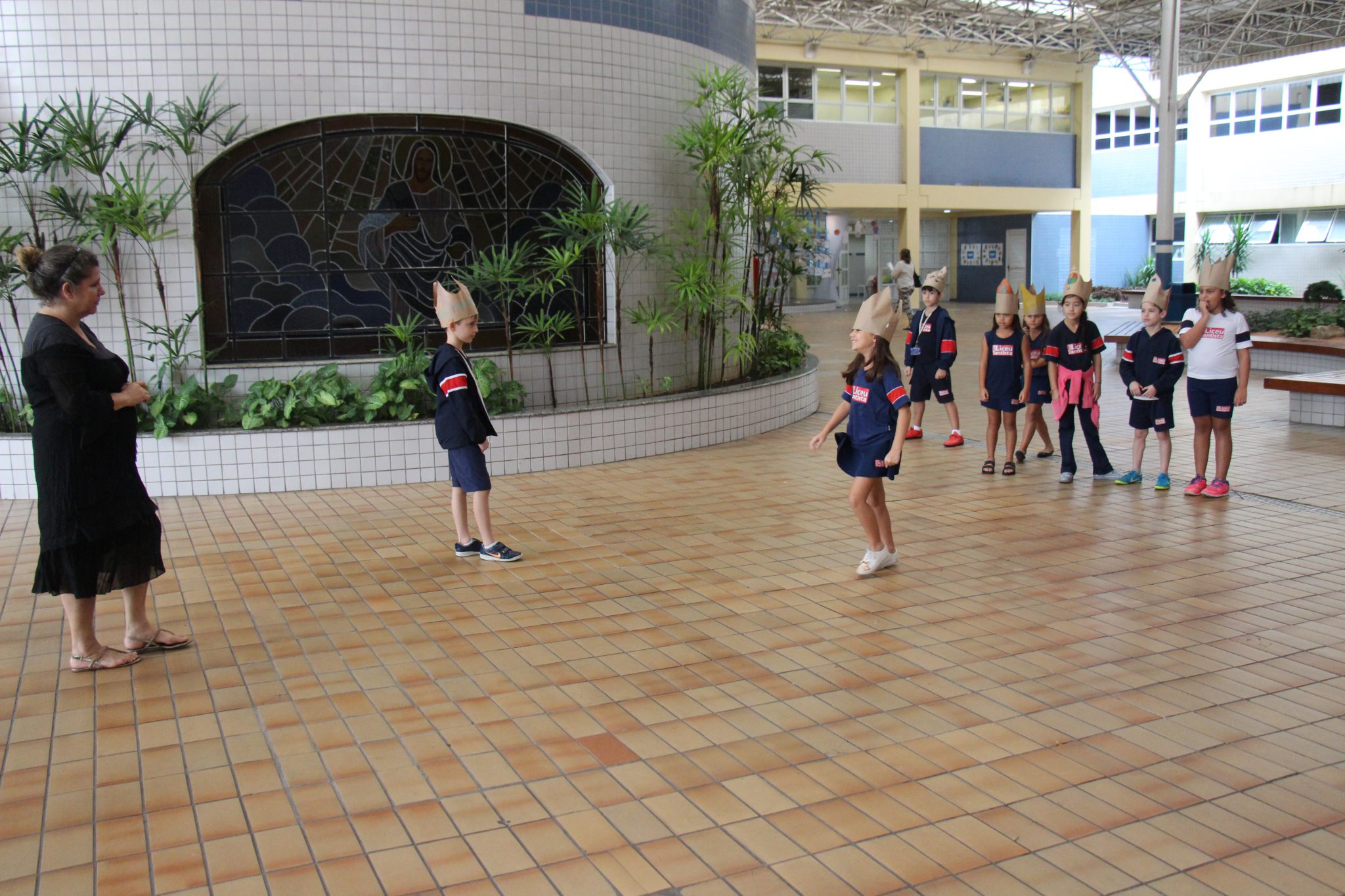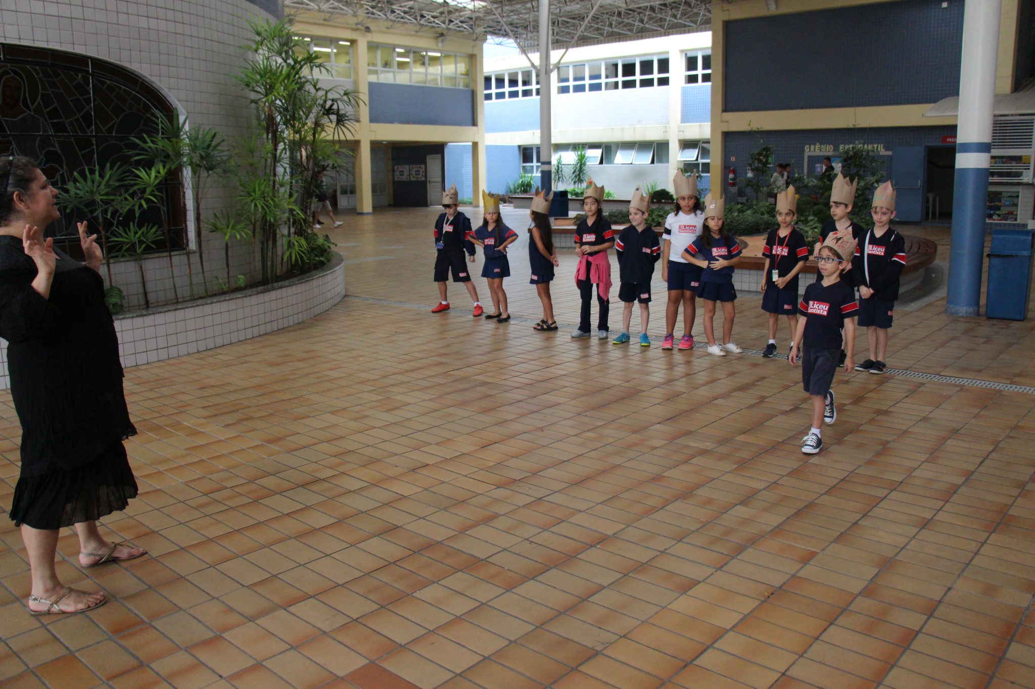 Caracterizada de Rainha Negra, a professora de xadrez Cris Furtado comandou os alunos do 2º ano do Ensino Fundamental que frequentam o Período Ampliado na movimentação daquela peça no tabuleiro. A atividade, realizada no pátio da escola com as crianças “vestindo” a personagem, segue apresentando cada um dos seis componentes do jogo: peão, torre, cavalo, bispo, rainha e rei.