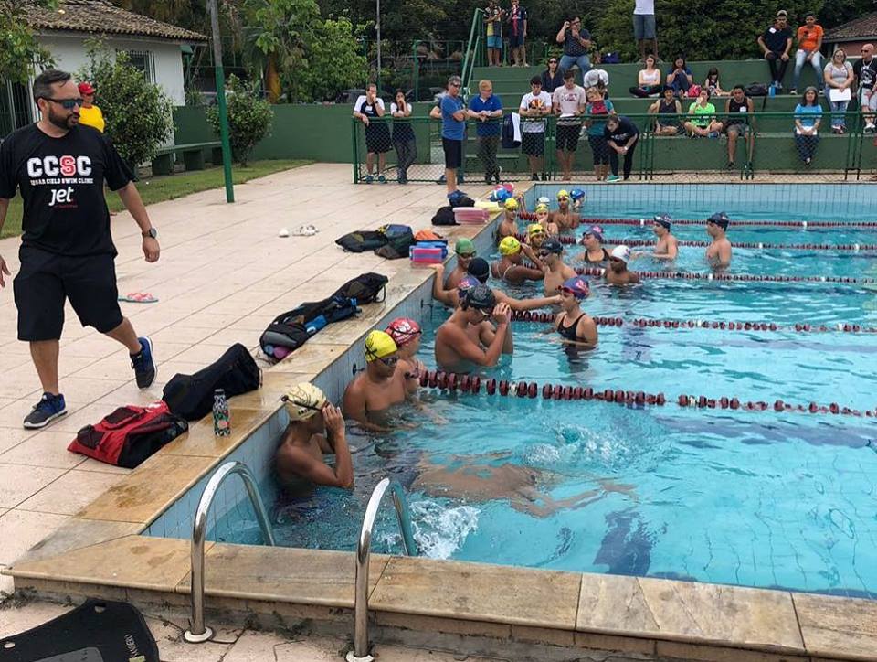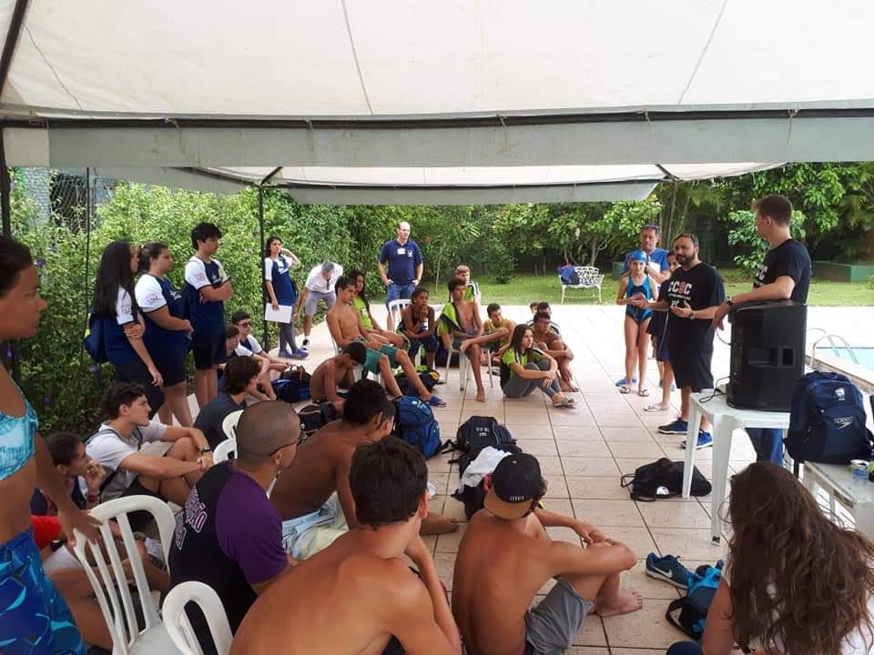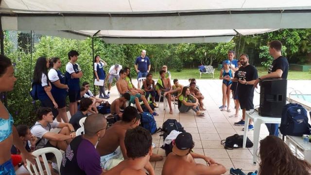 Os professores Fábio ELeutério, Milton Cunha, a estagiária Caren Simeão, juntamente com os alunos Ana Beatriz de Carvalho Oliveira, Diogo Marmé Santejo, Luan Taiyo Yogui Dias, Sabryna Sayuri Harada Caetano e Victor Hugo Domingues da Silva passaram um dia com Cielo e sua equipe participando de palestras motivacionais, análises técnicas, preparação físsica para nadadores, treino de velocidade entre outros.