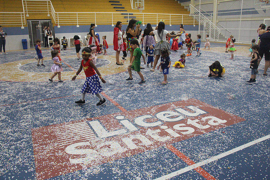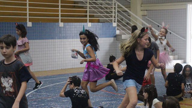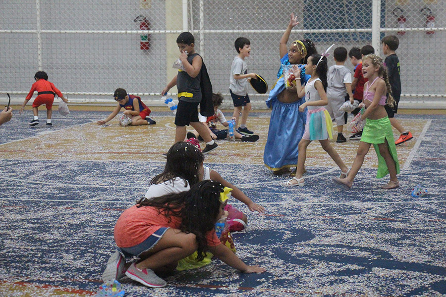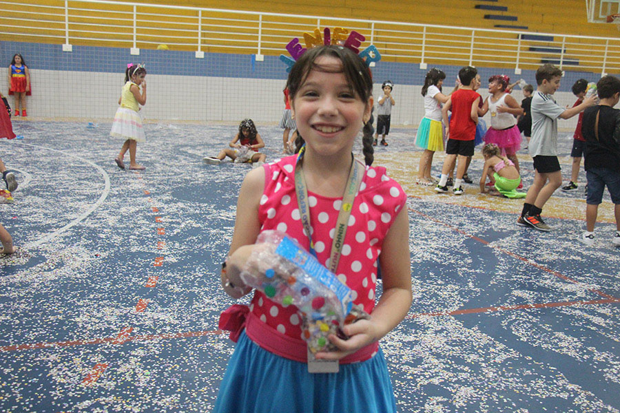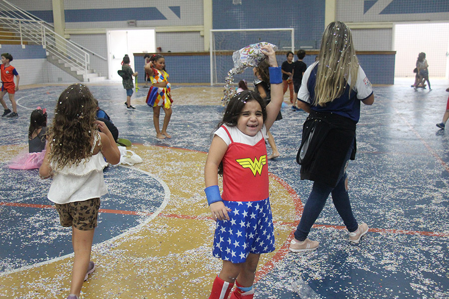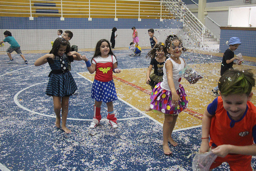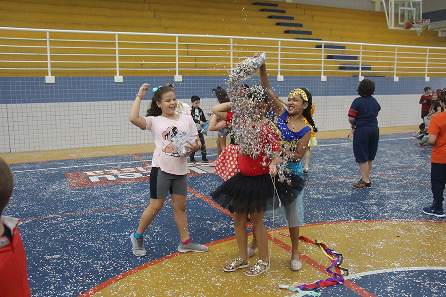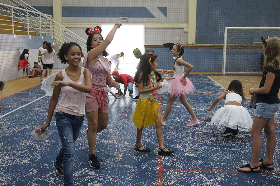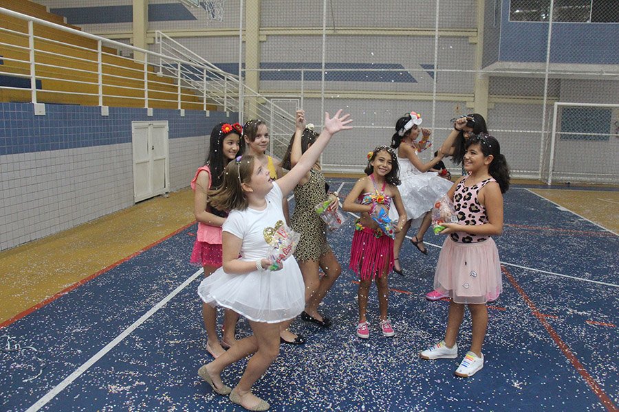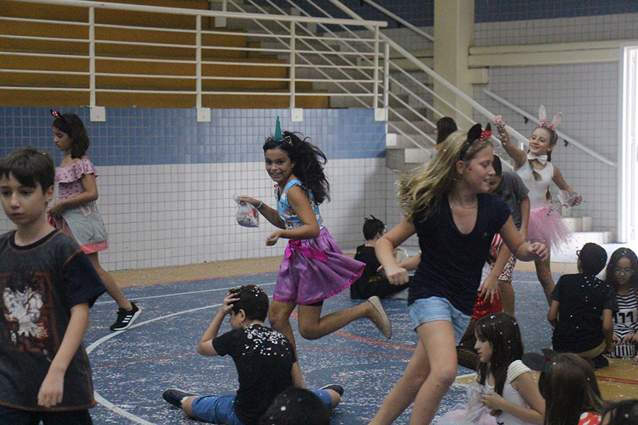 Também no Fundamental 1 não faltou animação. Para os liceístas, o que importava era brincar, correr, jogar confete nos amigos e ser feliz. E eles também capricharam nas fantasias: havaianas, odaliscas, sereias, unicórnios, piratas, centuriões…