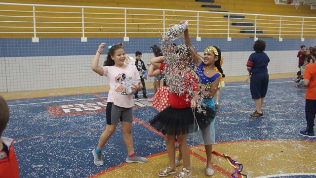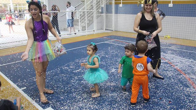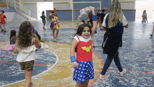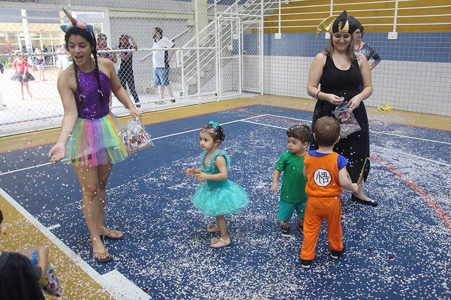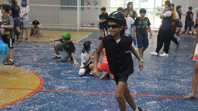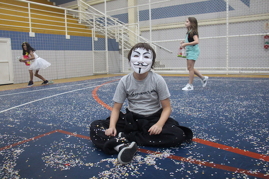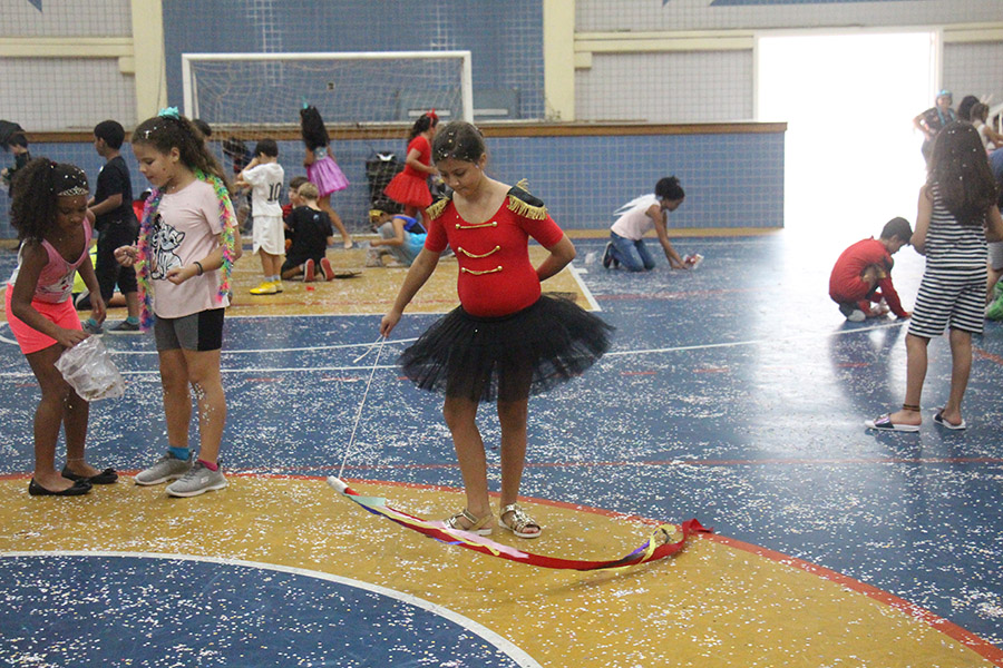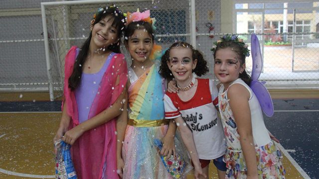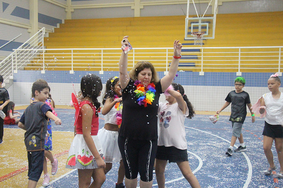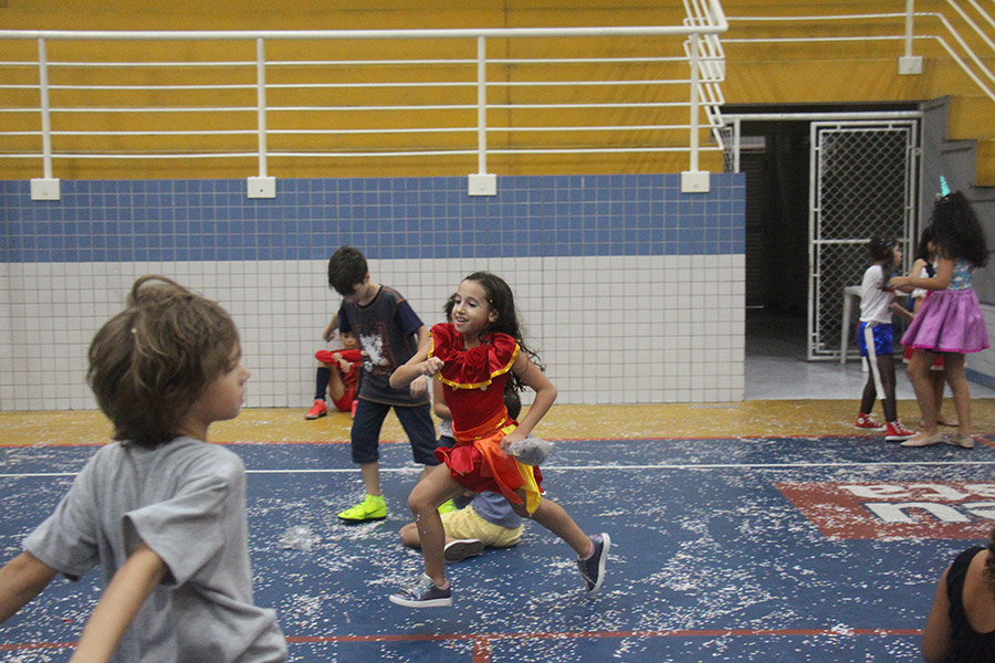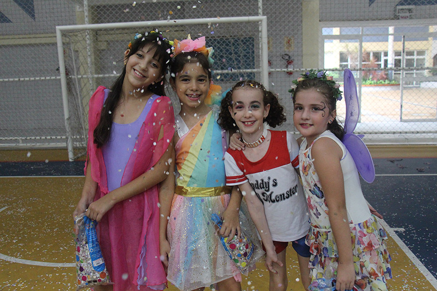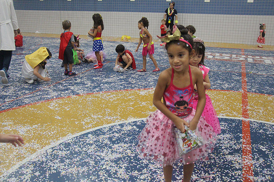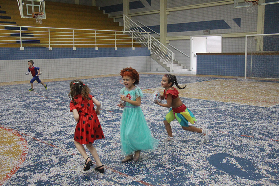 Também no Fundamental 1 não faltou animação. Para os liceístas, o que importava era brincar, correr, jogar confete nos amigos e ser feliz. E eles também capricharam nas fantasias: havaianas, odaliscas, sereias, unicórnios, piratas, centuriões…