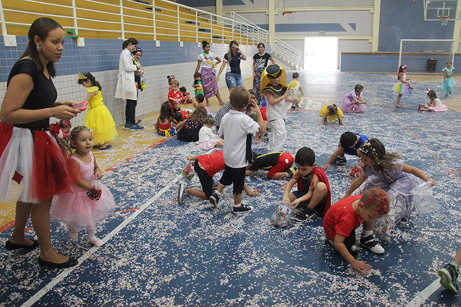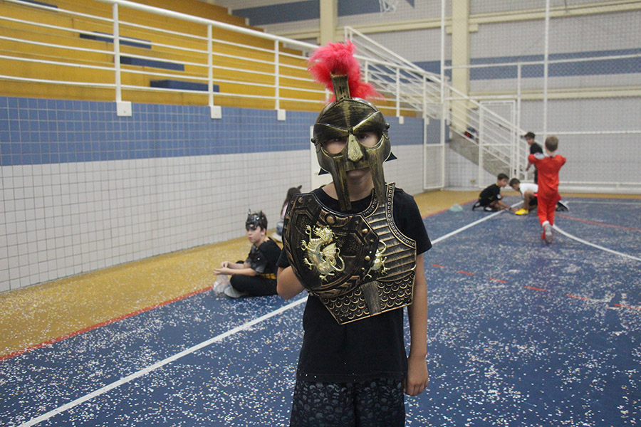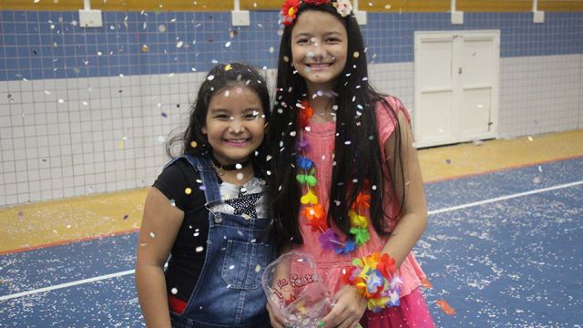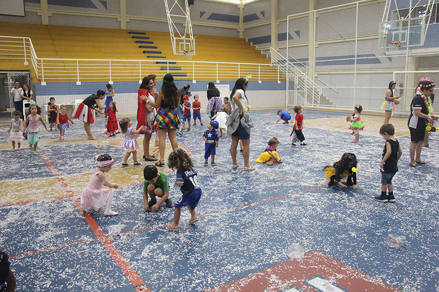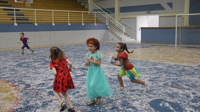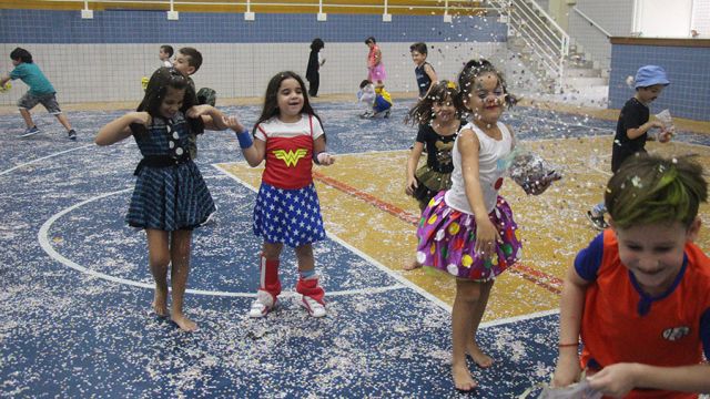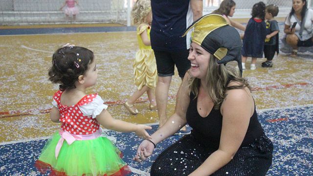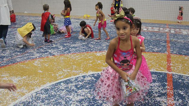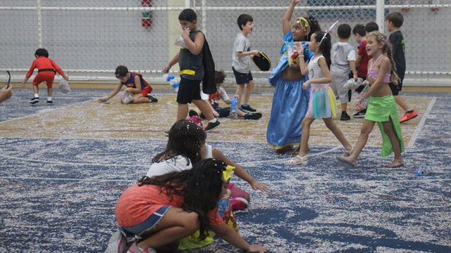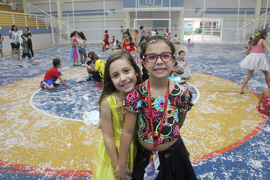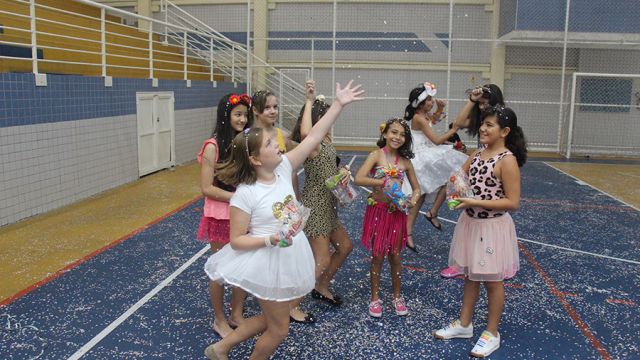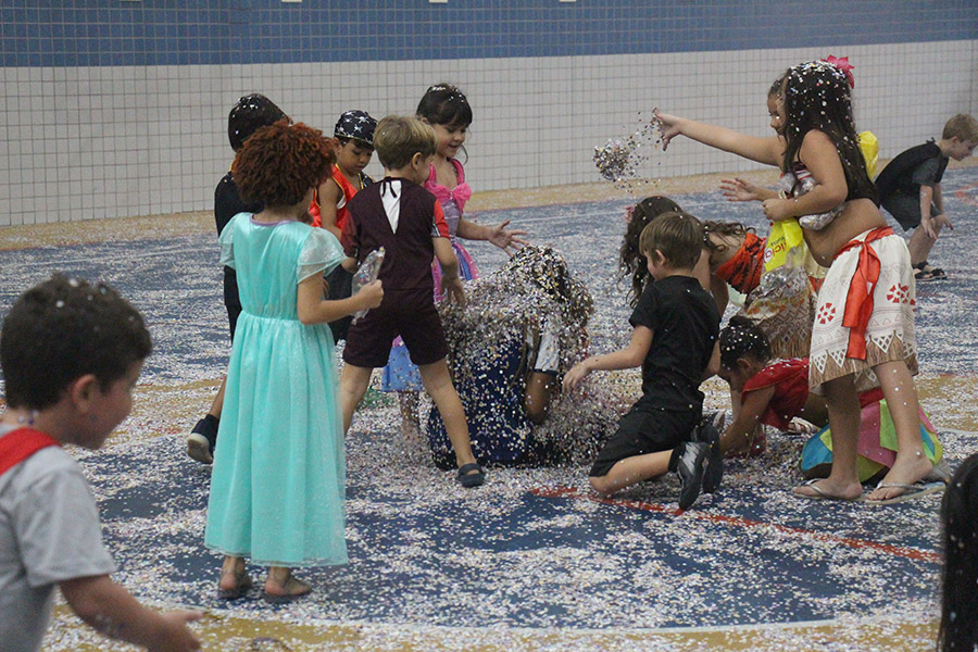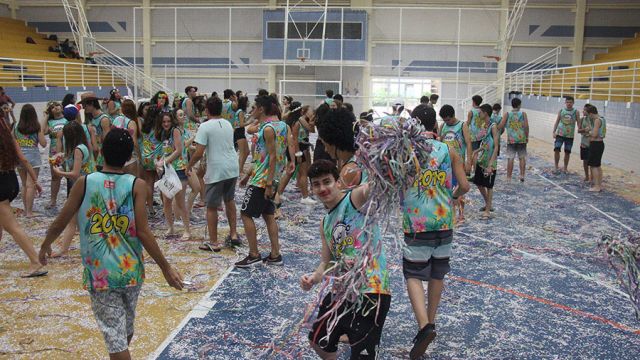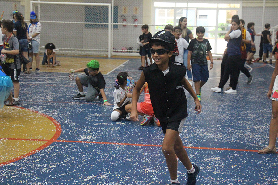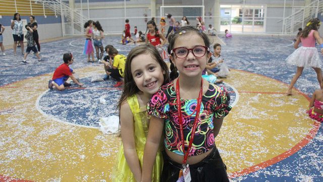 Também no Fundamental 1 não faltou animação. Para os liceístas, o que importava era brincar, correr, jogar confete nos amigos e ser feliz. E eles também capricharam nas fantasias: havaianas, odaliscas, sereias, unicórnios, piratas, centuriões…