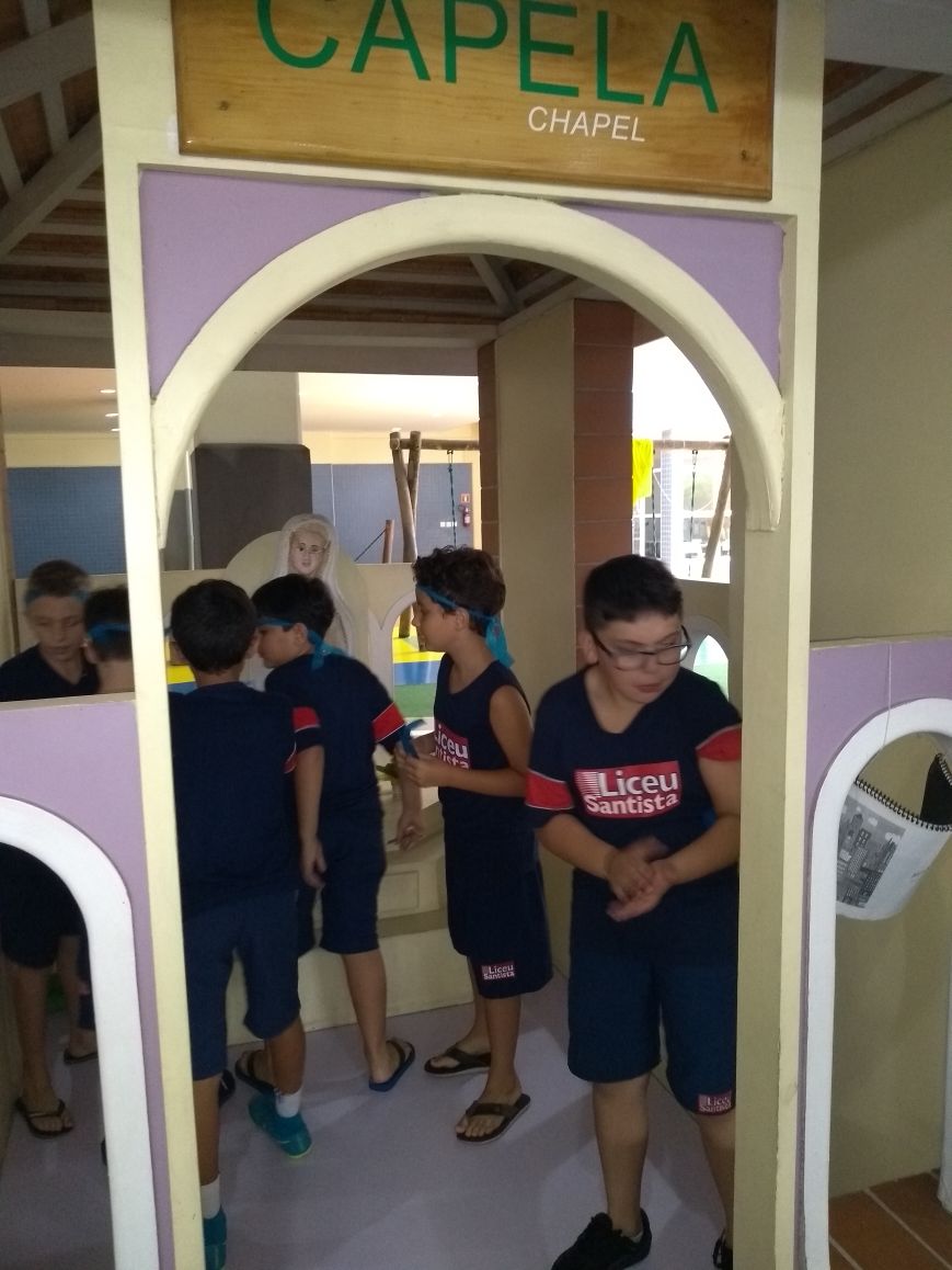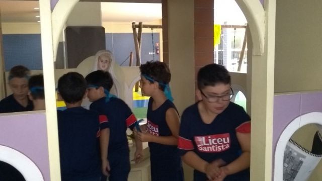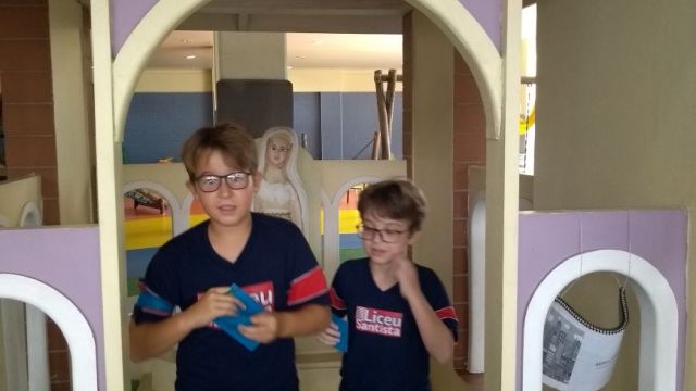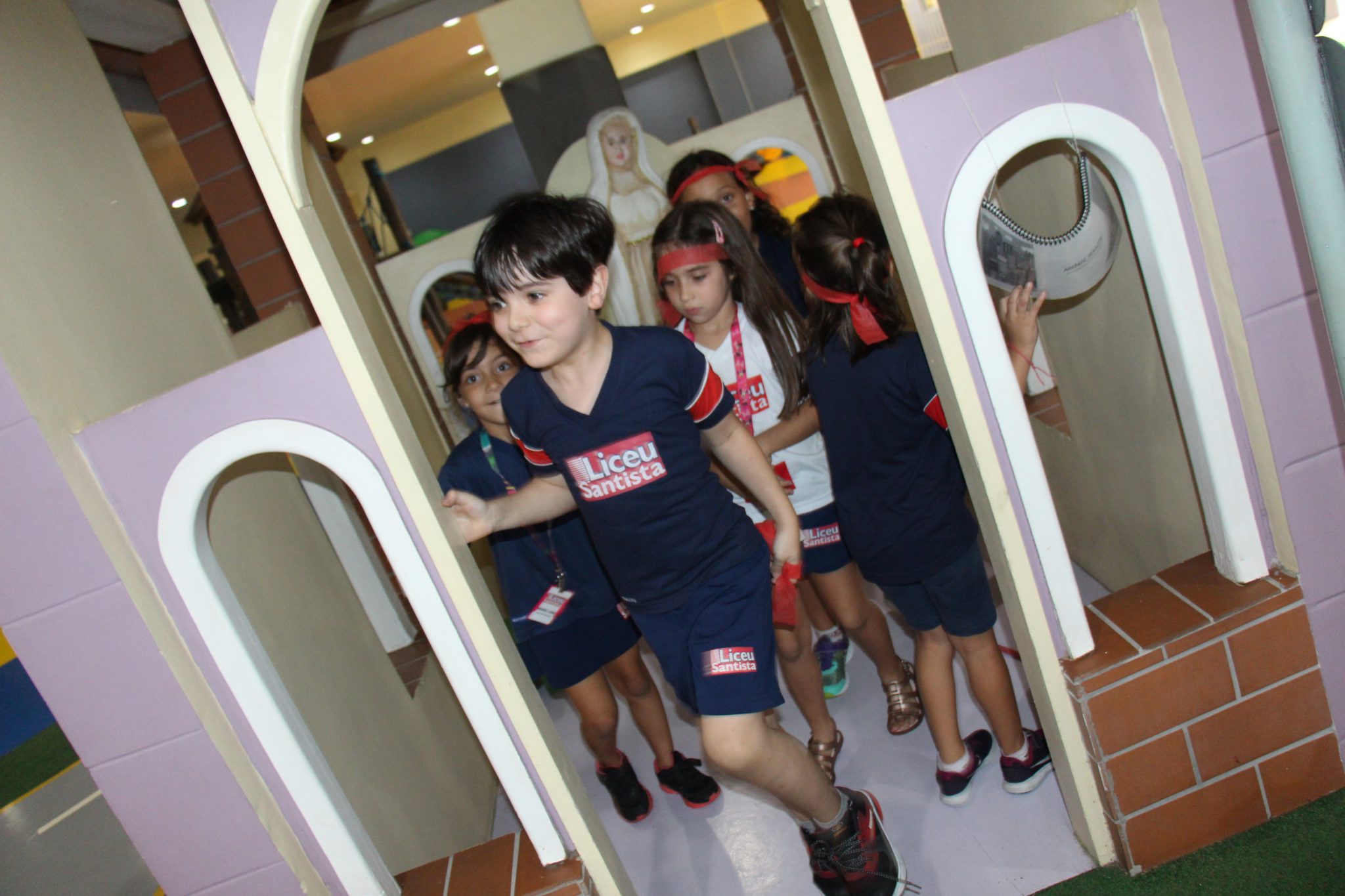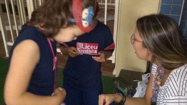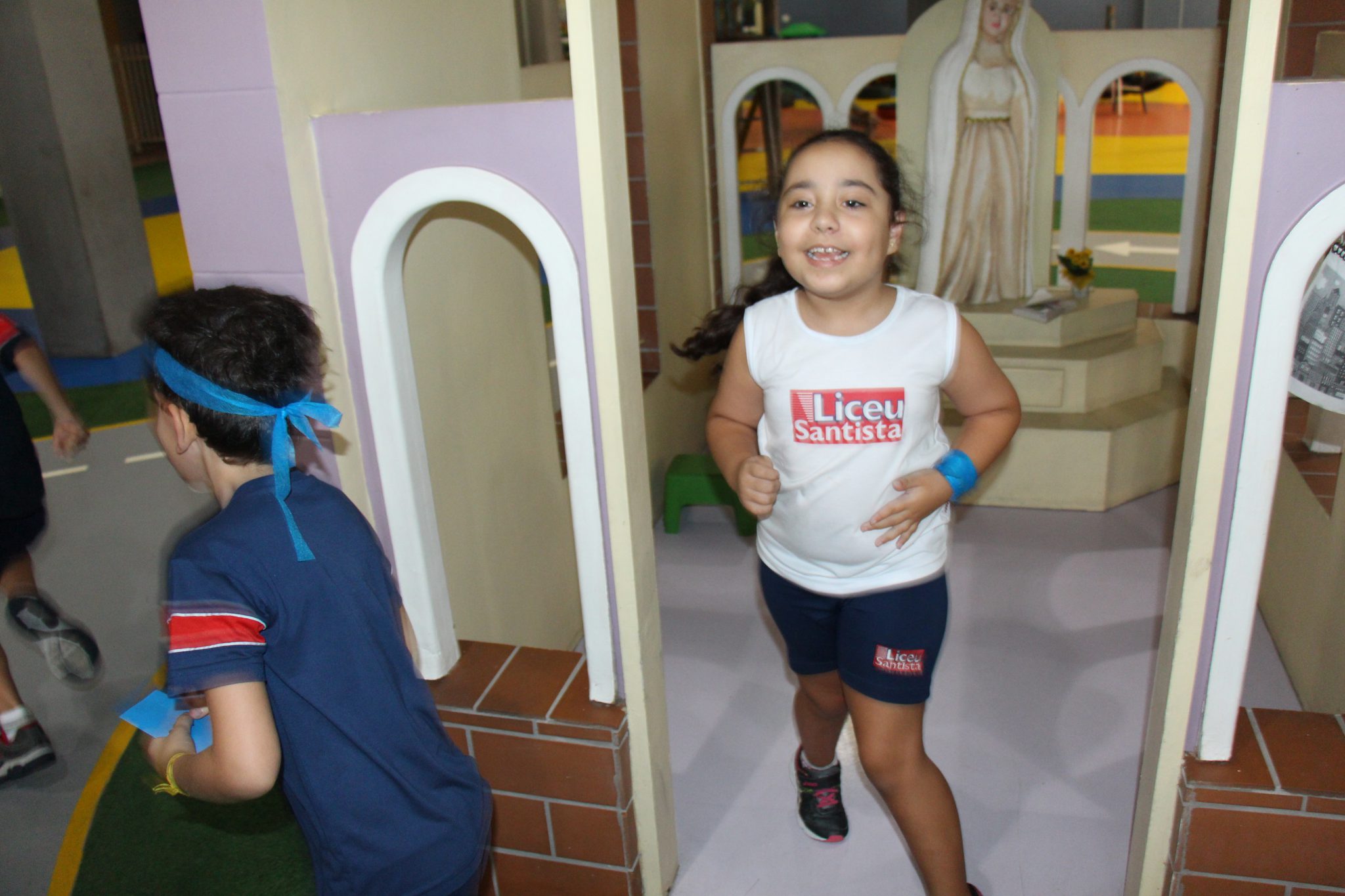 Dada a largada, os liceístas do 2º e do 3º ano buscavam, pelos vários ambientes, as pistas com informações que remetiam ao próximo local. Let´s start! Go to the square, Let´s pray at the chapel, Time to study! Go to school. Great! Now go to the Doctos´s Office, Good job! Now walk around the garden, Well done! It´s time to go to your house, It´s dinner time. Go to the restaurant, You prize is in your classroom foram algumas das pistas que os alunos seguiram para chegar aos docinhos, conhecidos como delicados de páscoa.