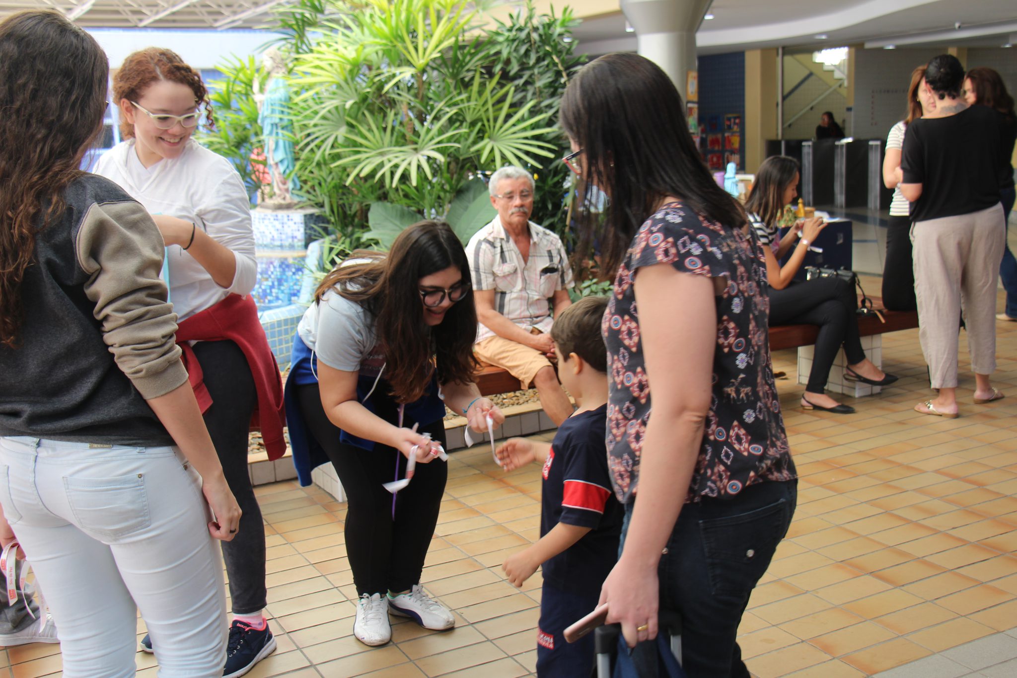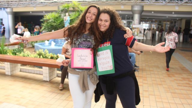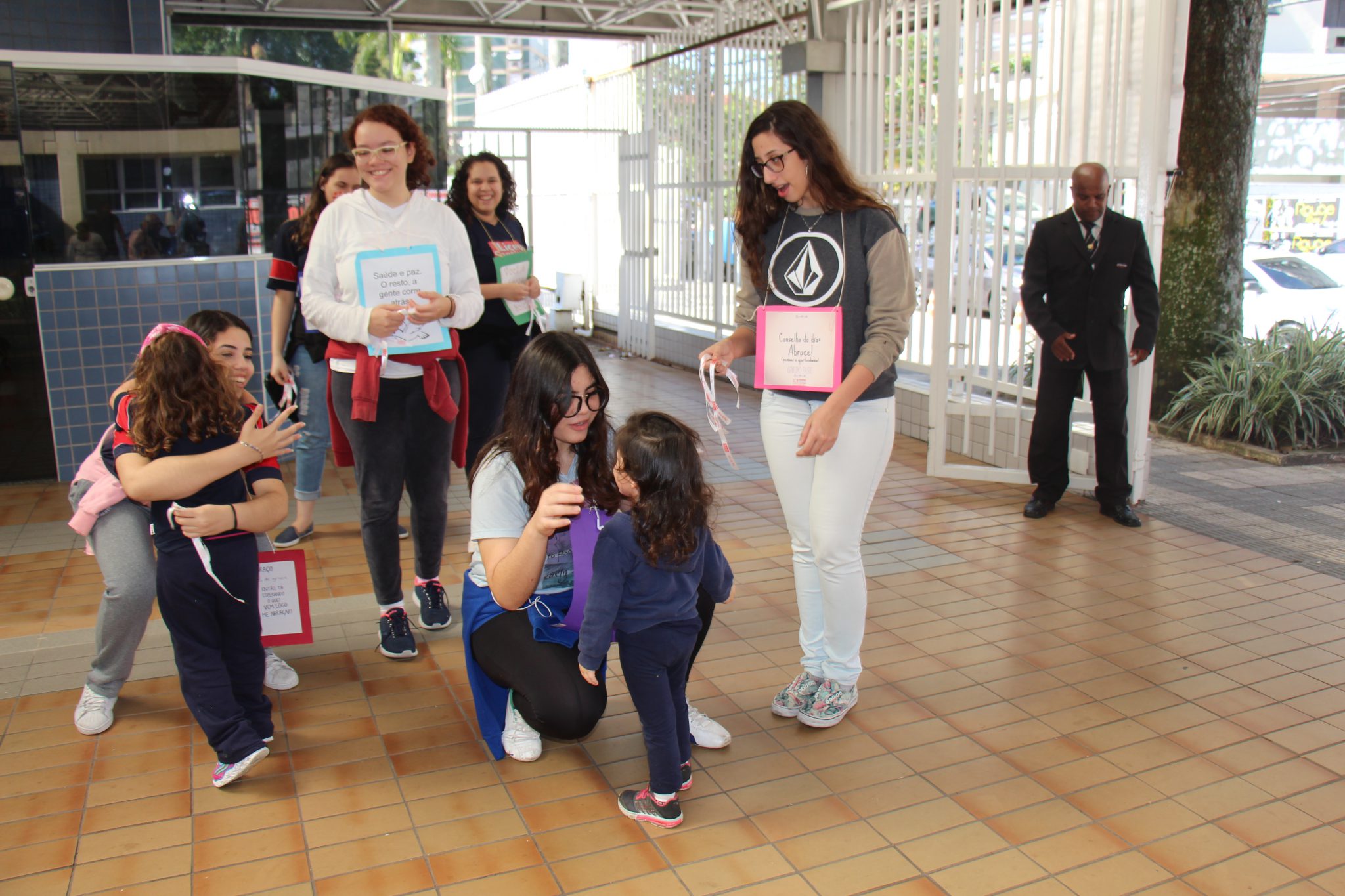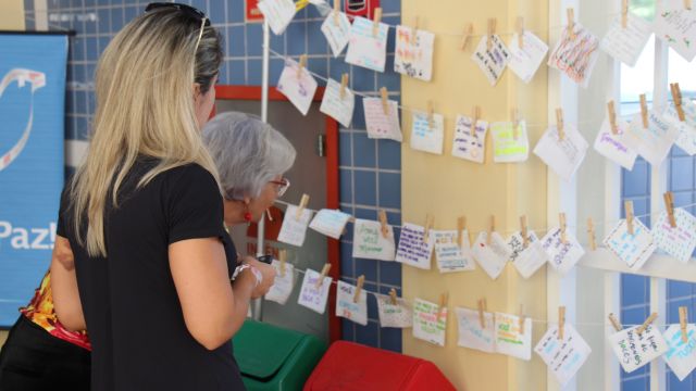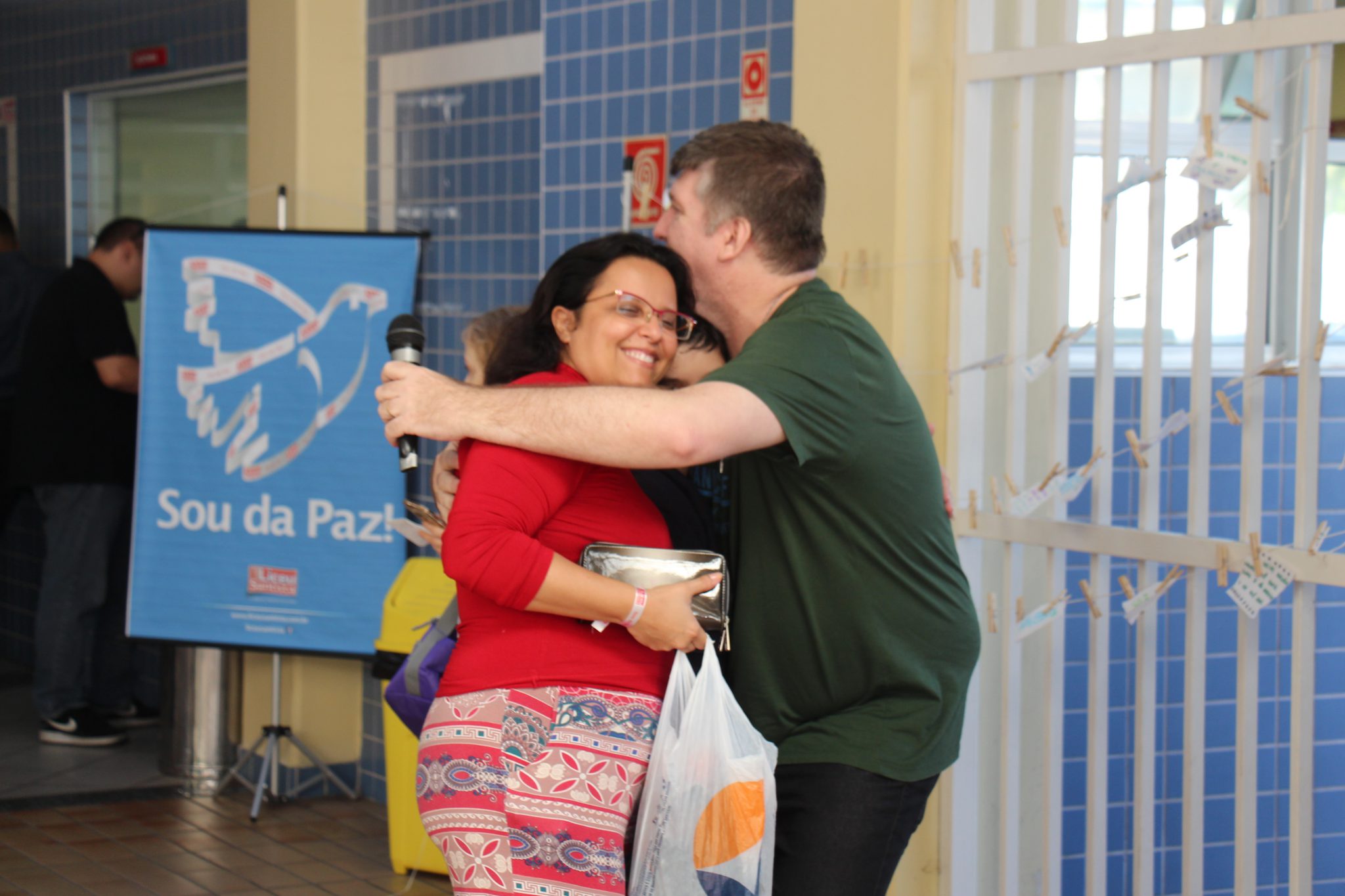 No Dia do Abraço, além do gesto de amizade, as pessoas ganharam uma fita de cetim com a inscrição “Sou da Paz” e puderam escolher mensagens escritas em guardanapos. A proposta é intensificar a cultura da paz no cotidiano e que ela ultrapasse os muros da escola.