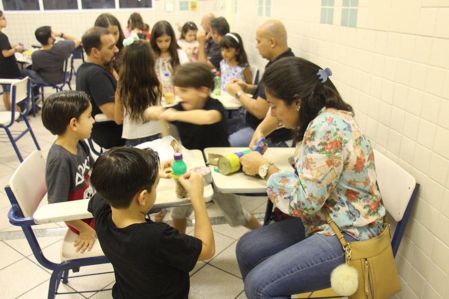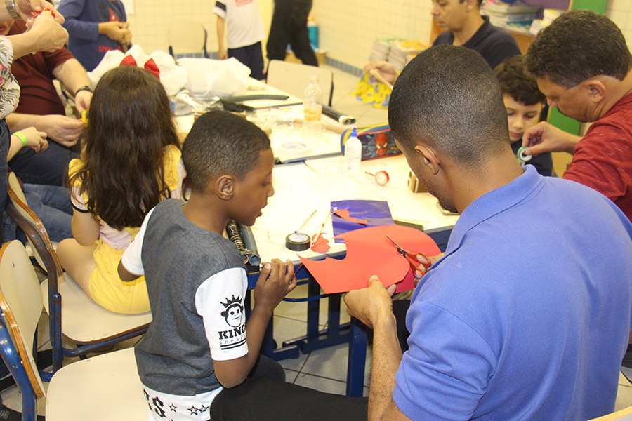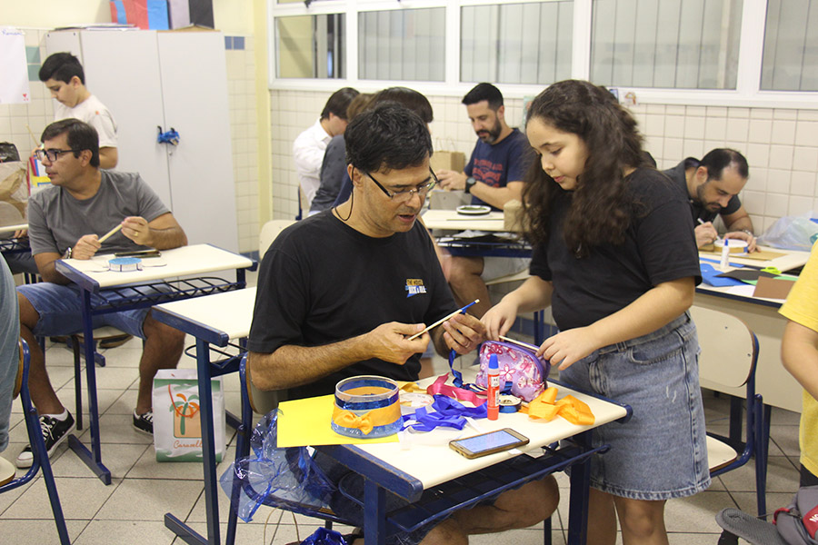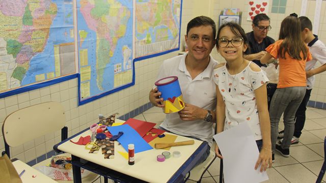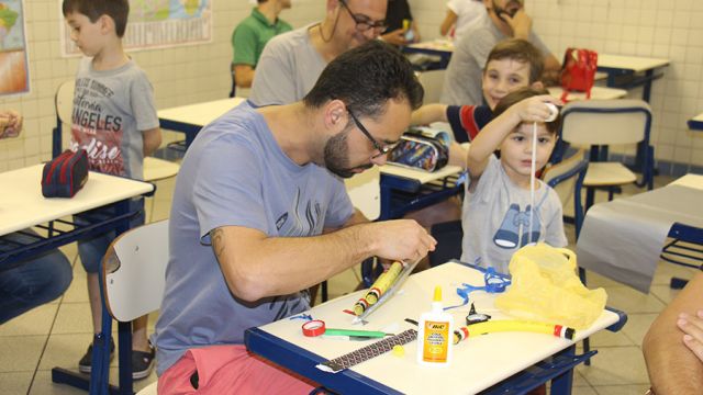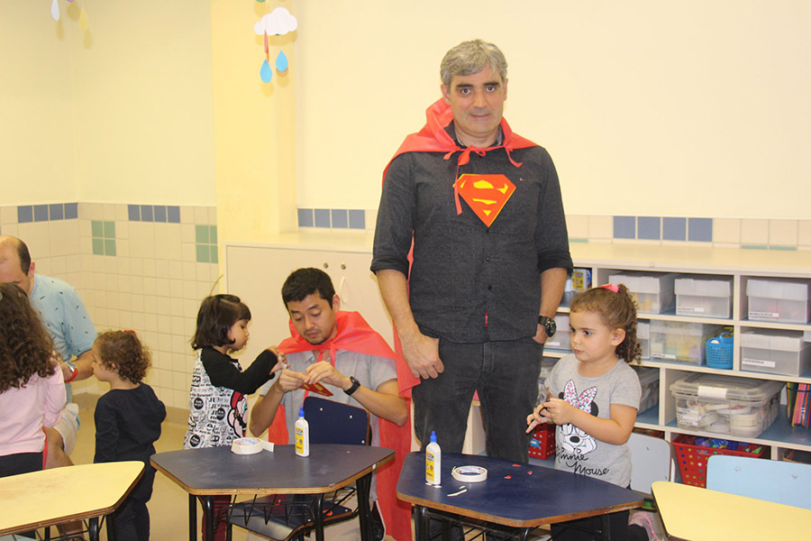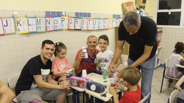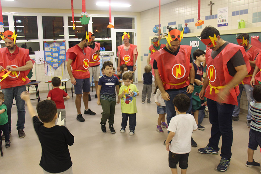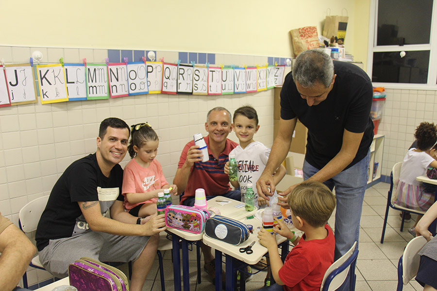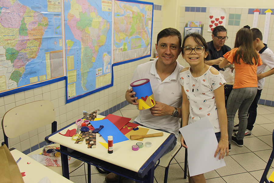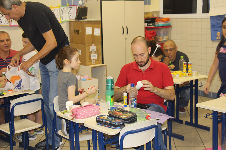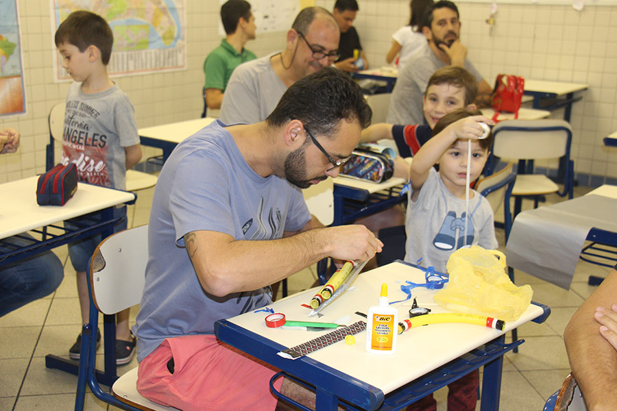 Pai, avô, tio, padrinho, mãe que também é pai também se divertiram confeccionando instrumentos de percussão utilizando materiais reciclados. De posse de seus pandeiros, reco-recos, caixas e tamborins artesanais, eles deram início a uma divertida apresentação que culminou com a chegada especial de integrantes da bateria da Escola de Samba União Imperial, sob o comando do mestre Fabio Manguinha. Com participação especial da professora Jacqueline Fernandes, as crianças entoaram a canção “Amor perfeito”, de Roberto Carlos.