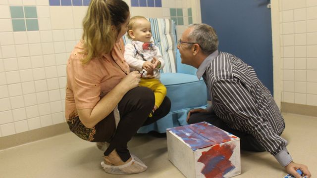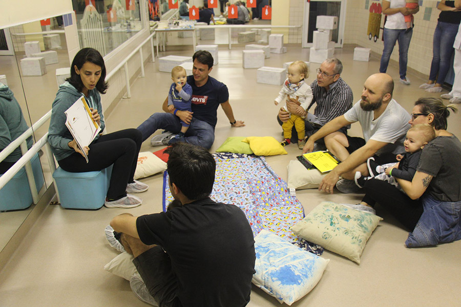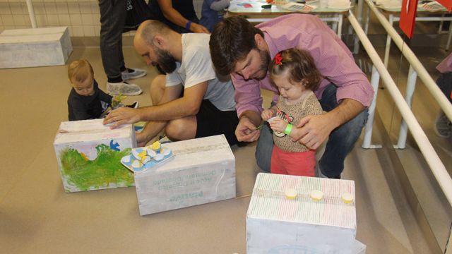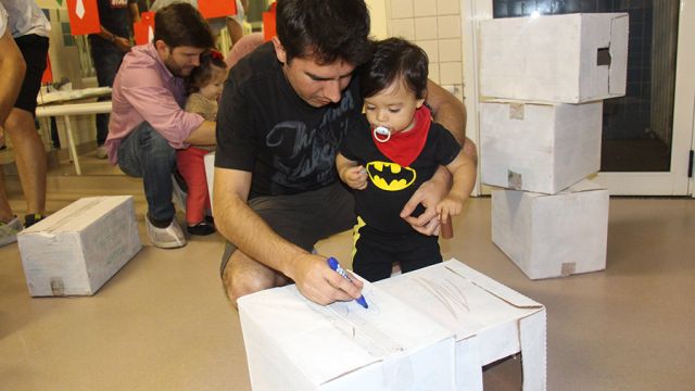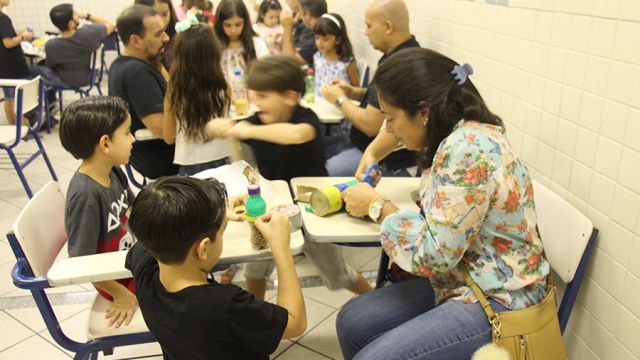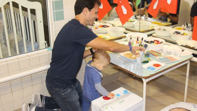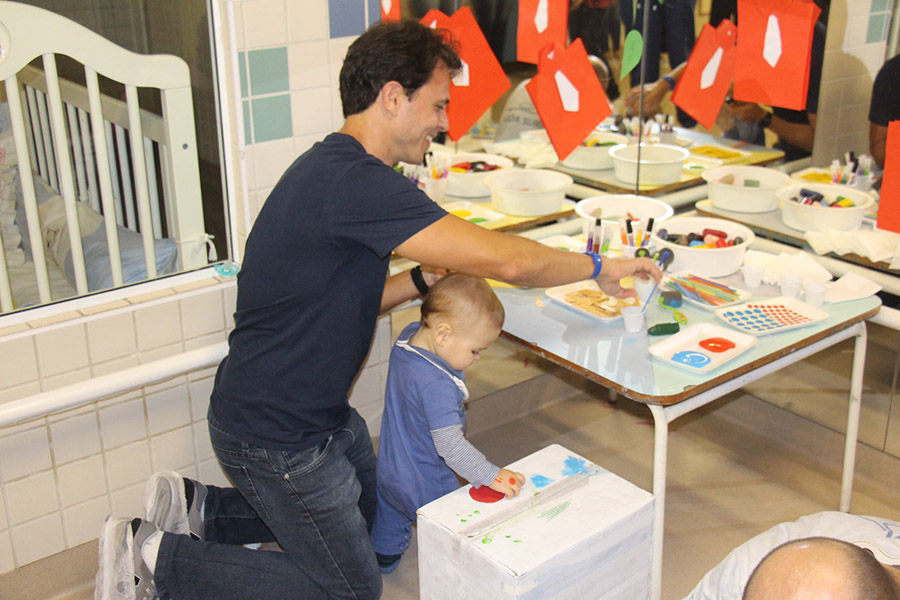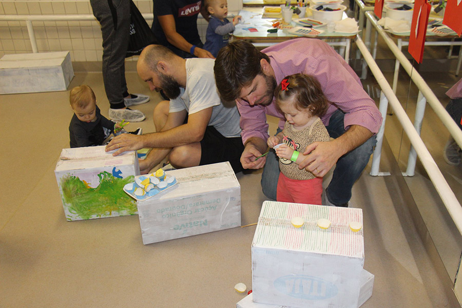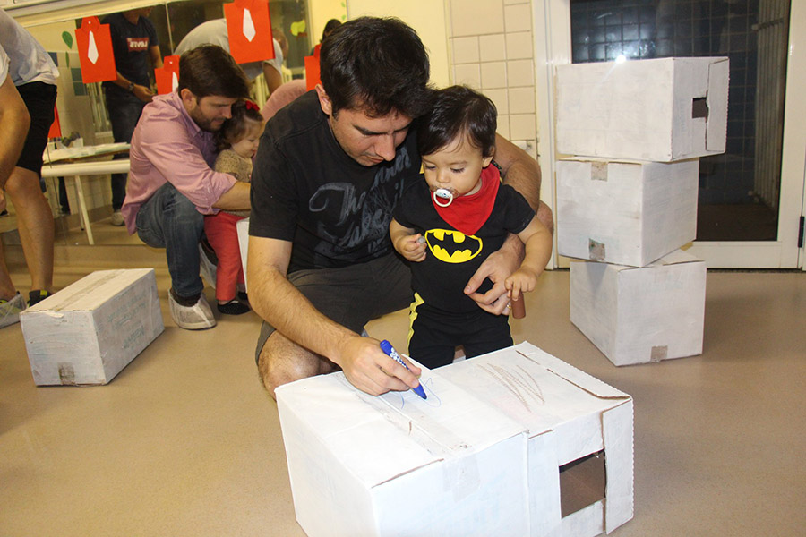 Os pequeninos do berçário receberam os papais com um momento de puro encantamento. Após ouvirem a história “O homem que amava caixas”, de Stephen Michael King, pais e filhos se divertiram personalizando caixas com pintura, colagem e o que a criatividade inspirasse. O livro fala de maneira simples e bonita sobre o relacionamento entre pai e filho.
