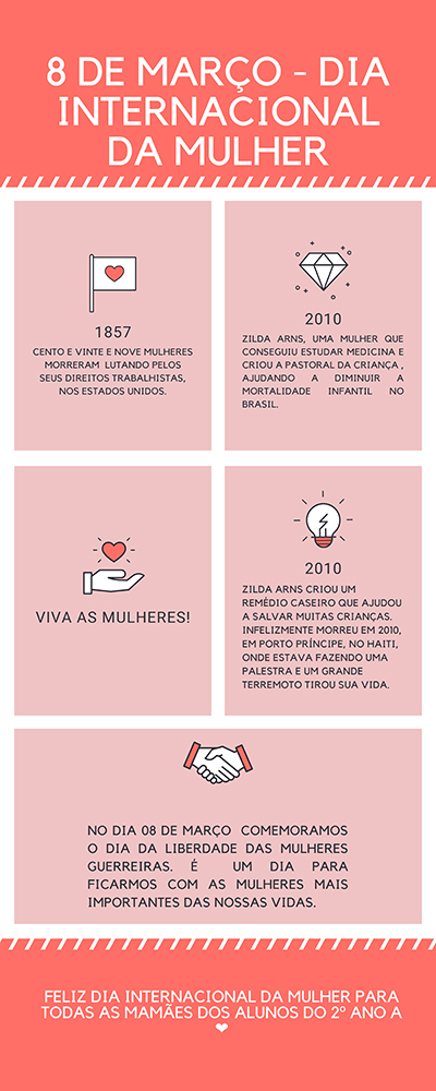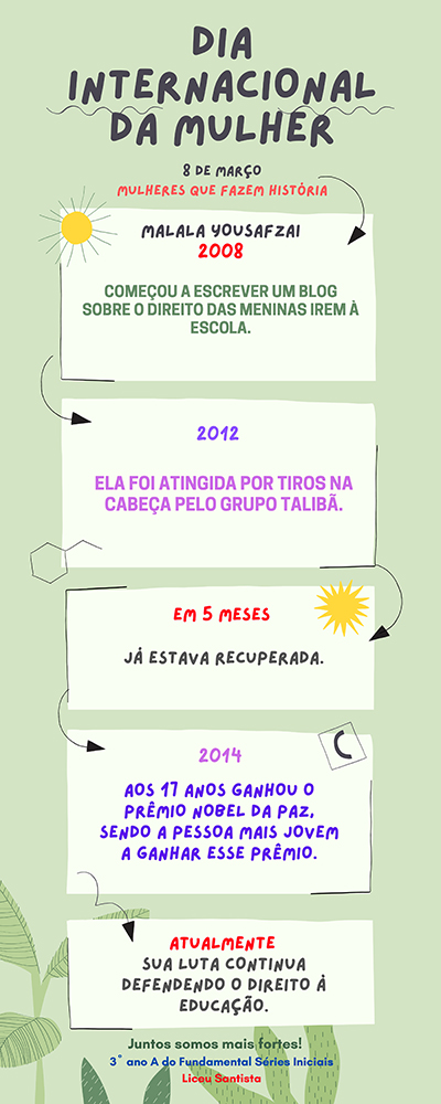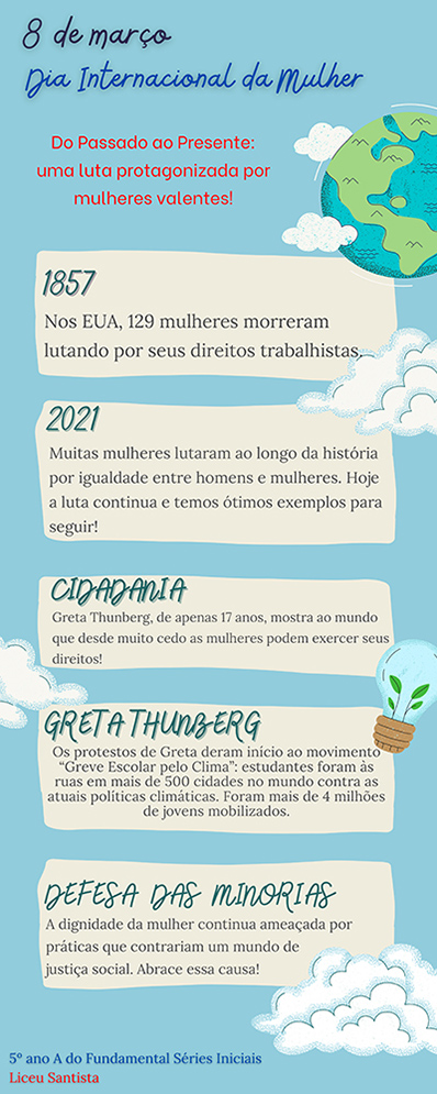 8 de março é uma data simbólica e importante, de reflexão e reconhecimento. Para lembrar o Dia Internacional da Mulher, as turmas do 1º ao 5º ano do Ensino Fundamental Anos Iniciais escolheram algumas personalidades femininas que se destacaram na luta por respeito, dignidade e equidade.