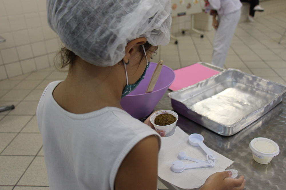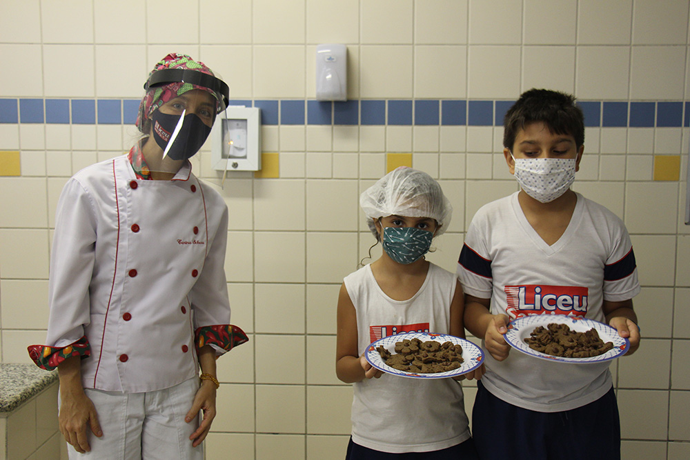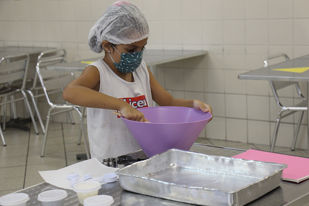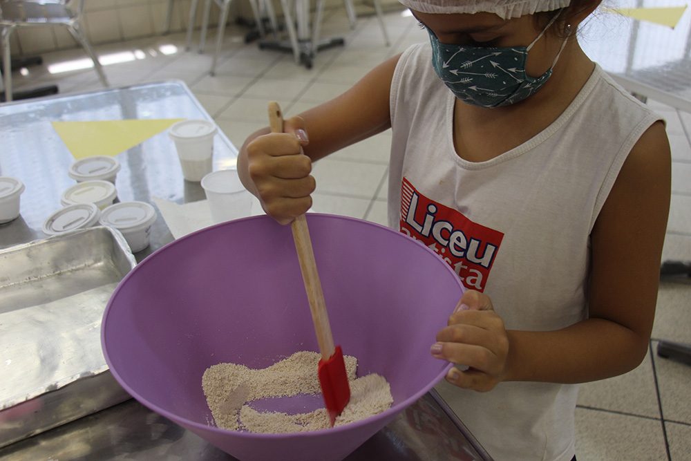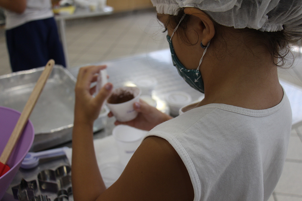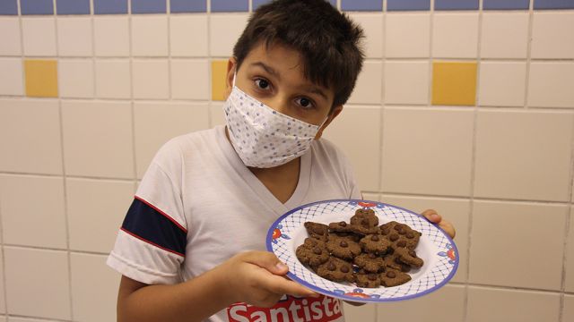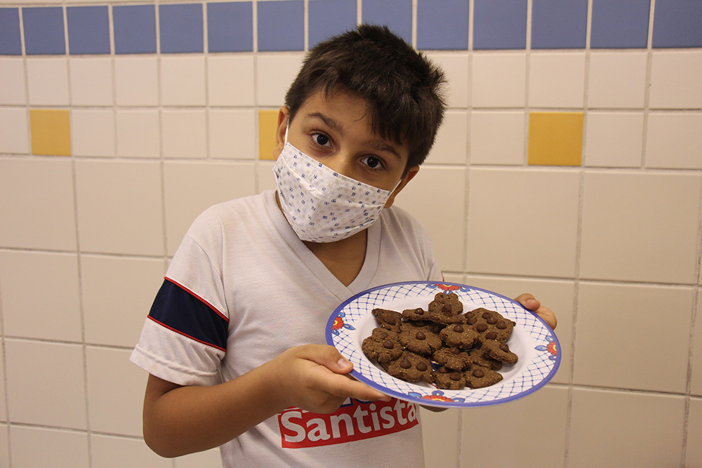 Para o primeiro encontro culinário, a receita escolhida foi cookies de cacau e aveia, cuja preparação é simples e rápida. Com utensílios e ingredientes previamente separados, as crianças puderam iniciar a tarefa de forma tranquila e segura, mantendo todos os cuidados de biossegurança, como a higienização constante dos espaços e das mãos, o uso de máscaras e o distanciamento.