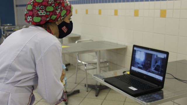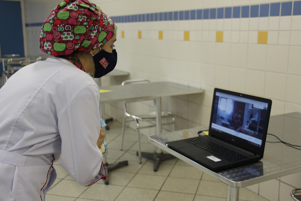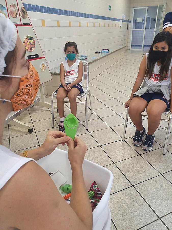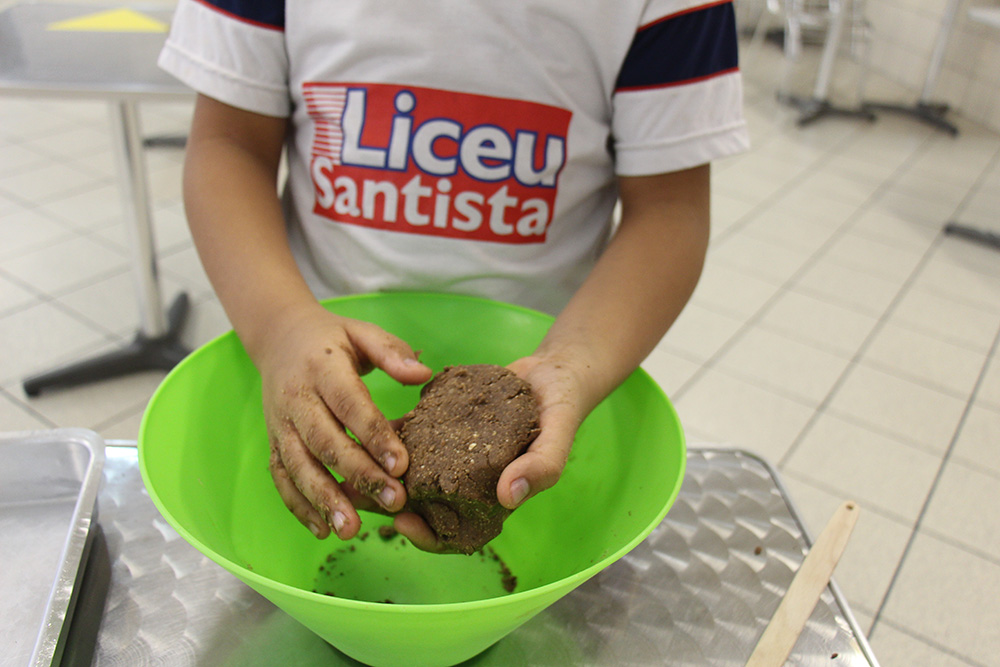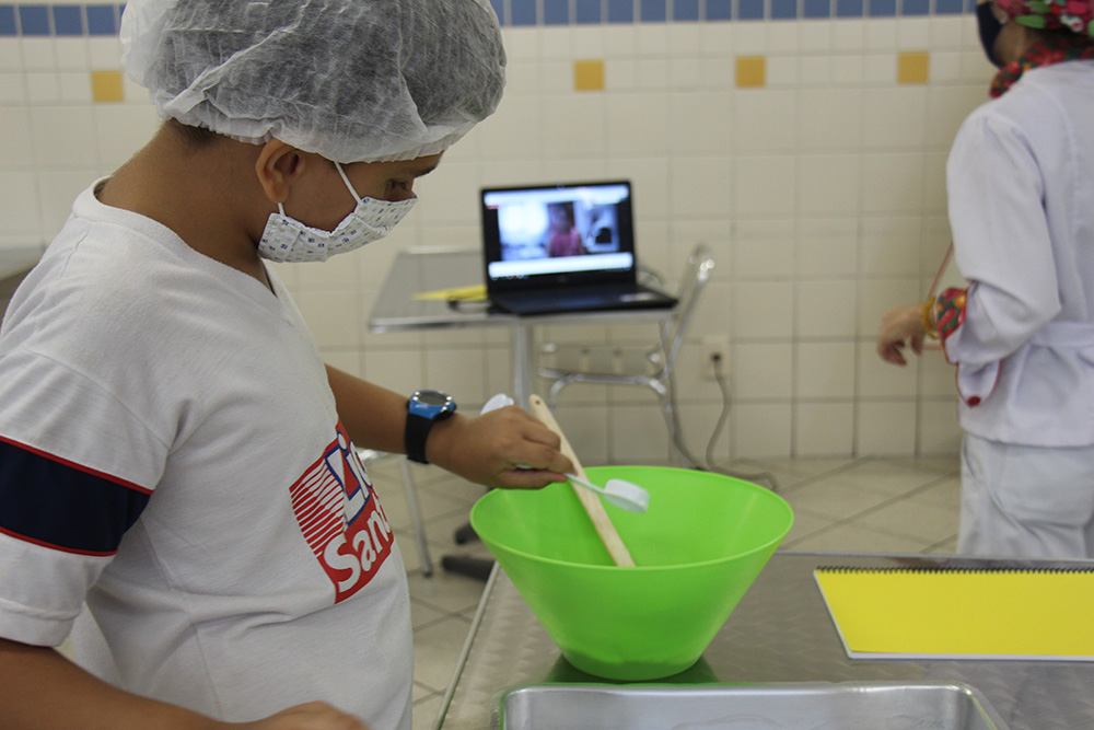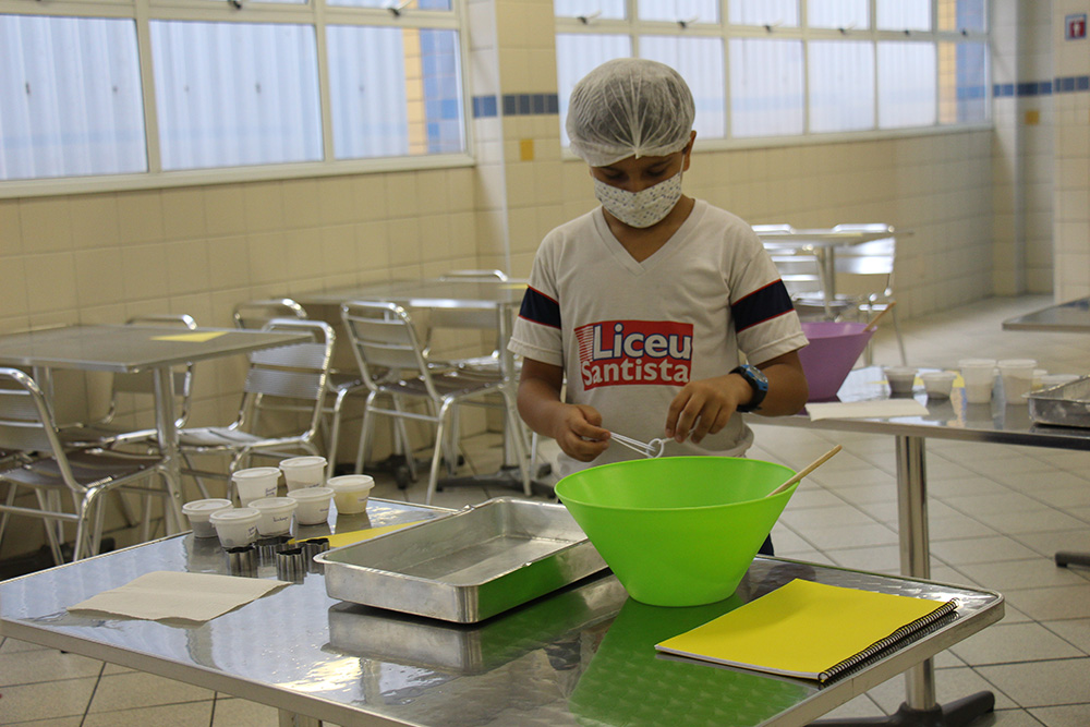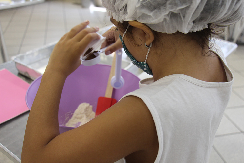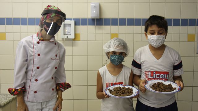 Para o primeiro encontro culinário, a receita escolhida foi cookies de cacau e aveia, cuja preparação é simples e rápida. Com utensílios e ingredientes previamente separados, as crianças puderam iniciar a tarefa de forma tranquila e segura, mantendo todos os cuidados de biossegurança, como a higienização constante dos espaços e das mãos, o uso de máscaras e o distanciamento.