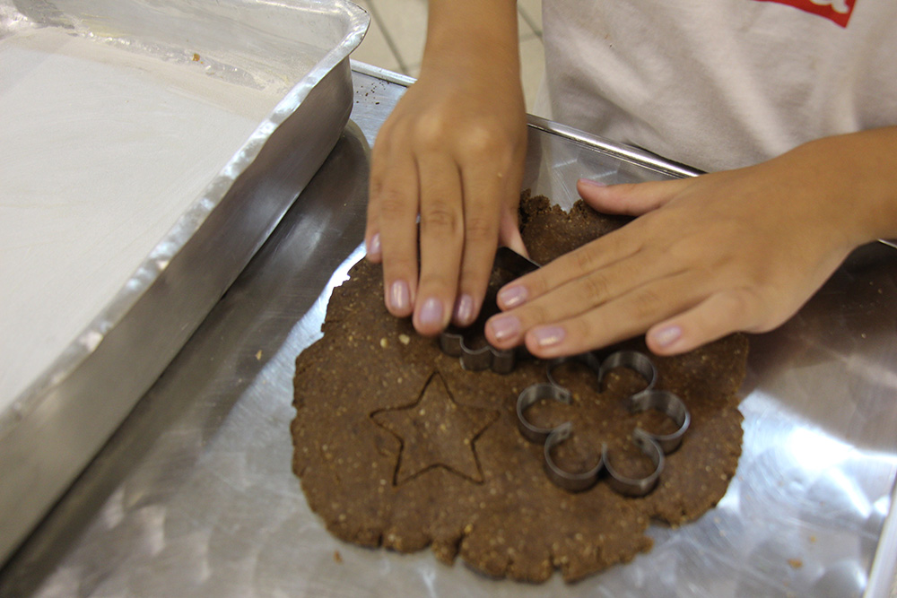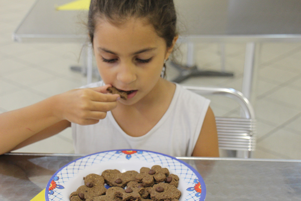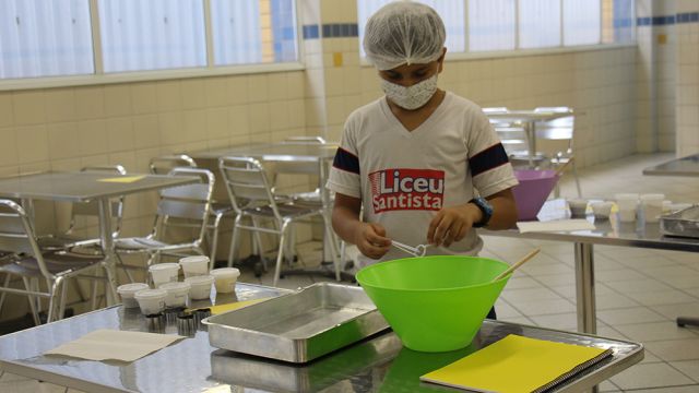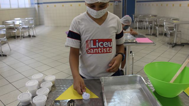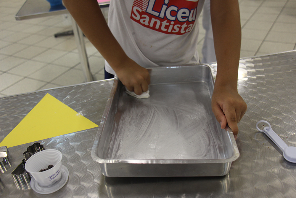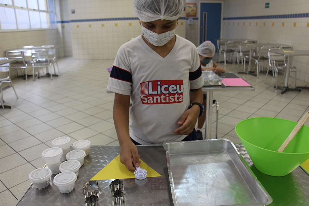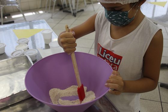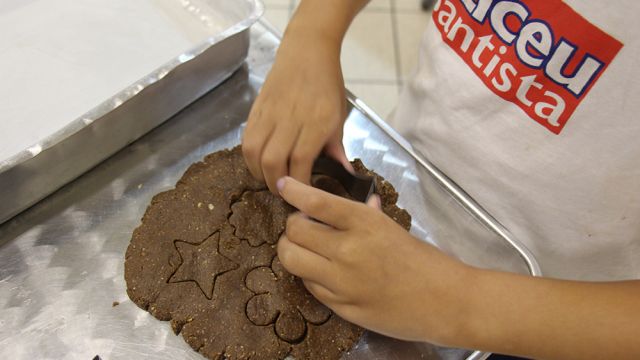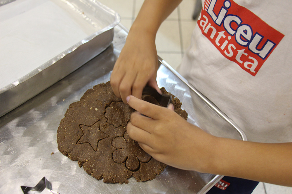 A partir daí, seguindo a orientação da nutricionista, os estudantes foram misturando os itens para fazer a massa, untaram as fôrmas, usaram os cortadores para moldar os biscoitos. Para Carina, incentivar a participação dos estudantes na preparação de receitas estimula uma cultura de alimentação saudável, autonomia, além de possibilitar o fazer e o experimentar de maneira prazerosa, organizada e segura. “Quando são as próprias crianças que fazem as receitas, o envolvimento é diferente. Elas ficam orgulhosas de terem produzido e felizes com o resultado”.