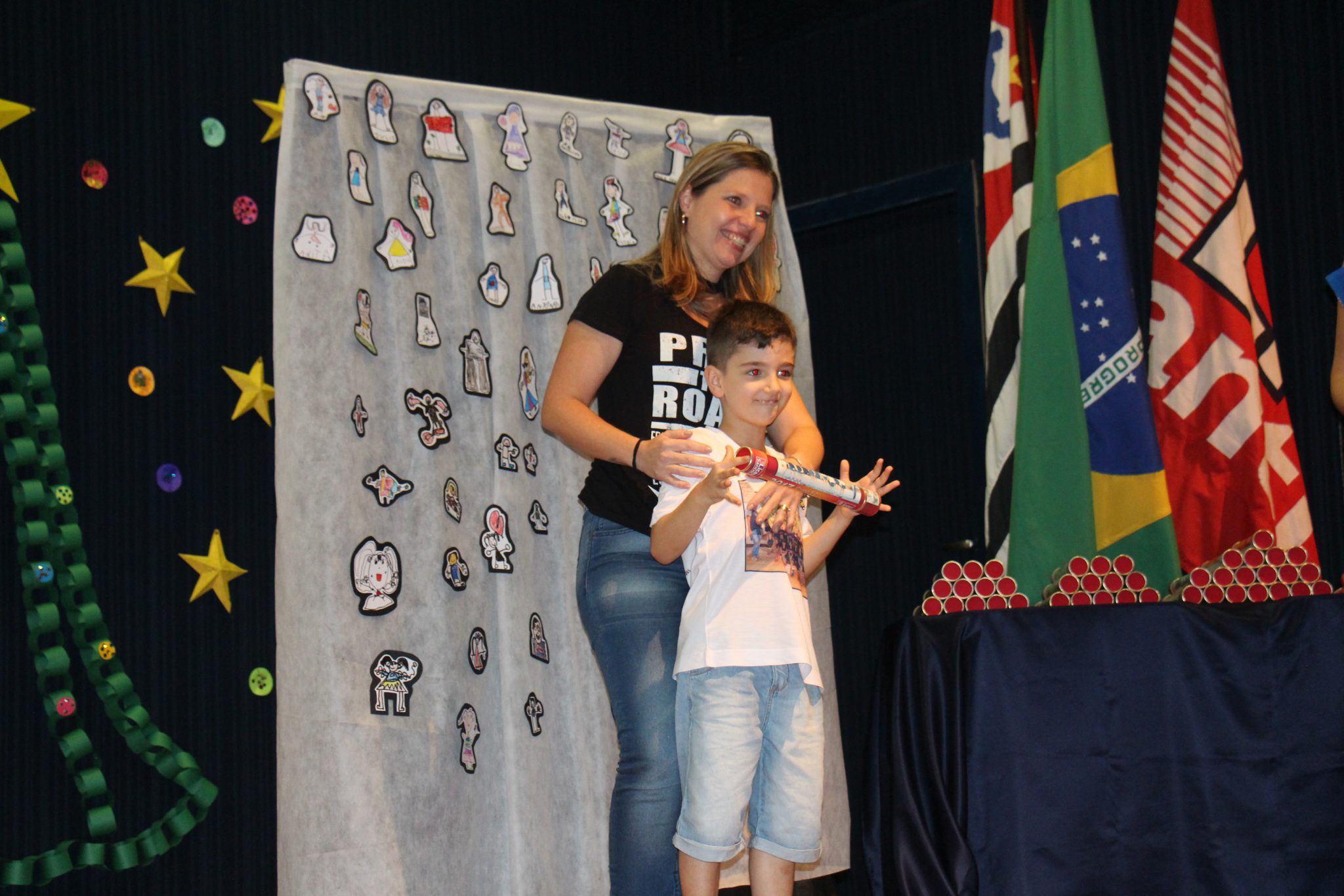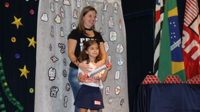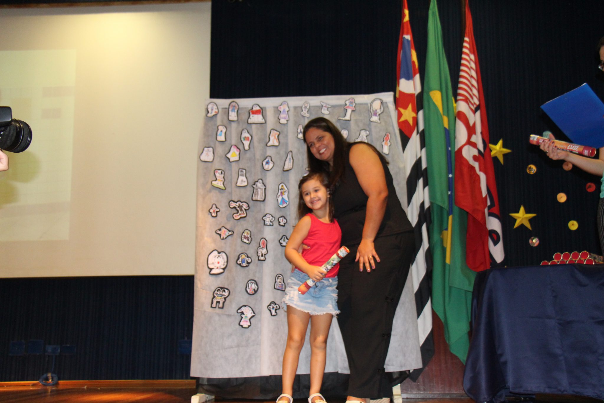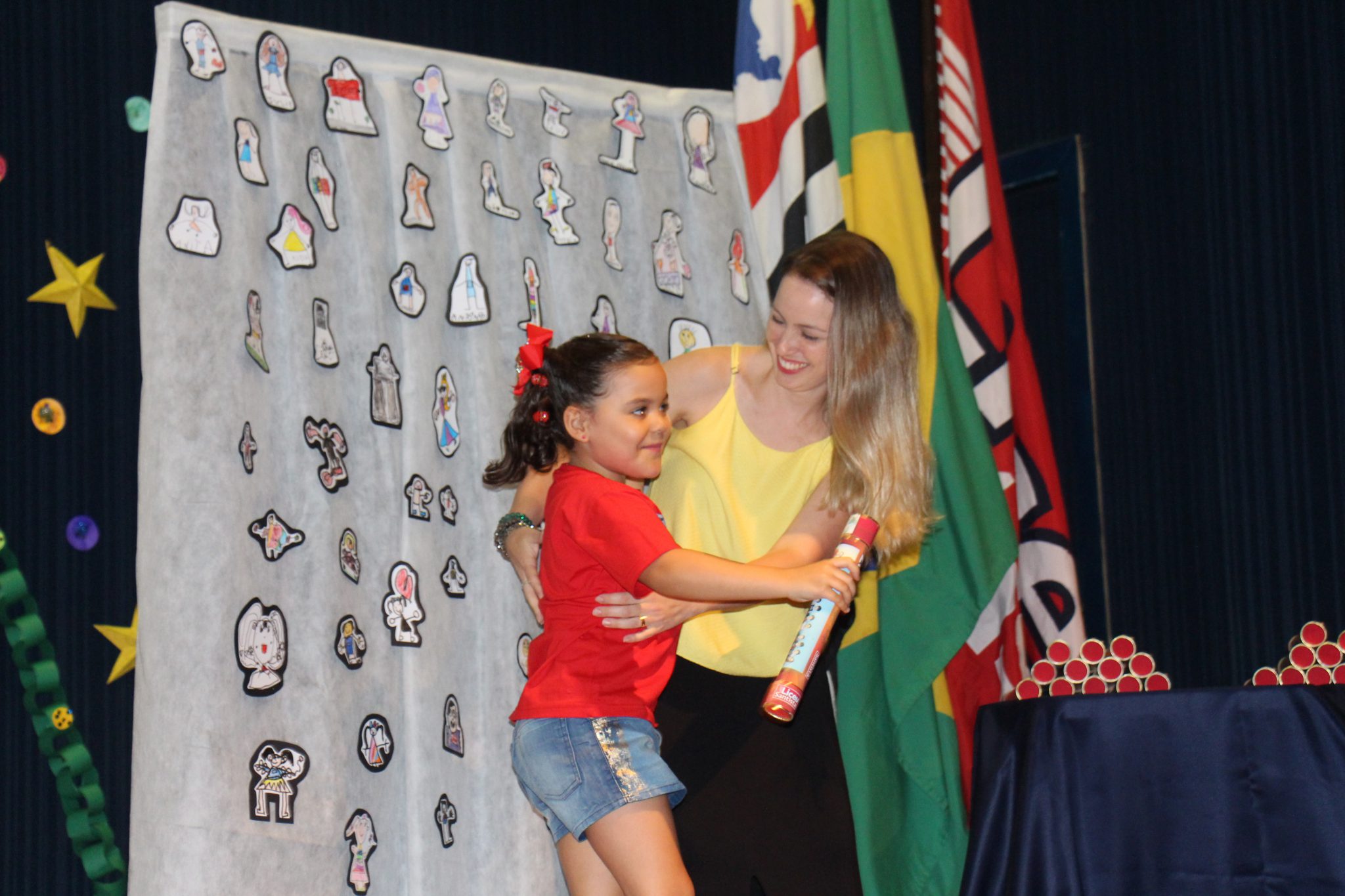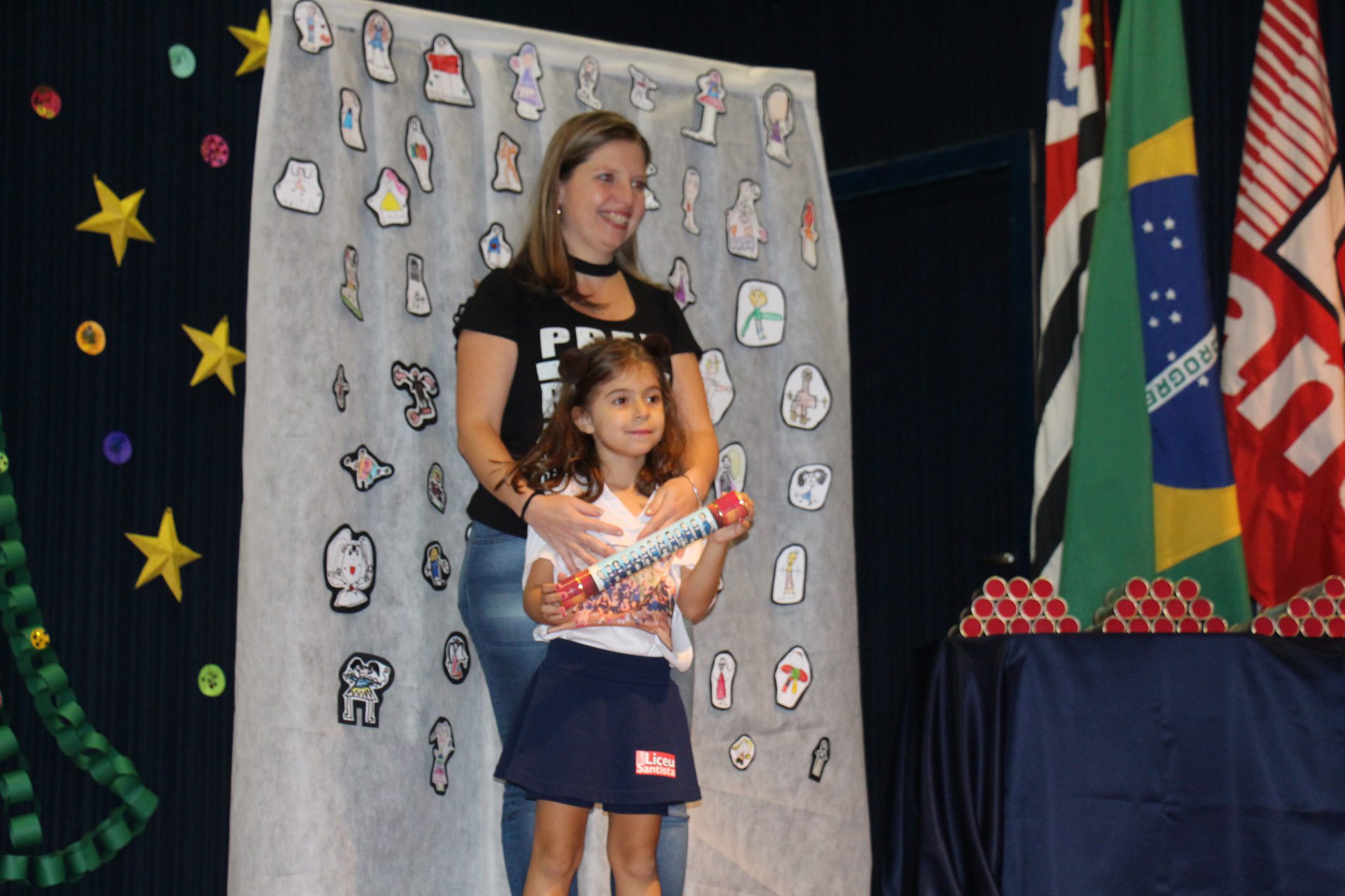 Para marcar a passagem das crianças da Educação Infantil para o 1º ano do Ensino Fundamental, foi realizada uma cerimônia com a entrega de canudos ilustrados com todas as classes.