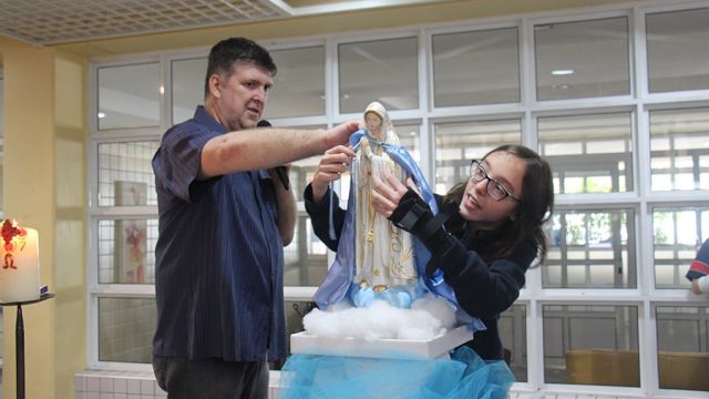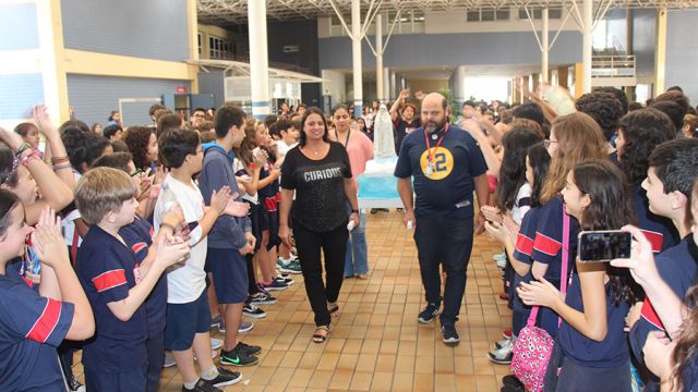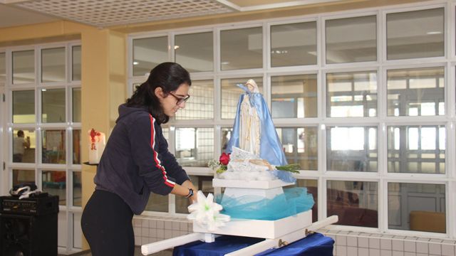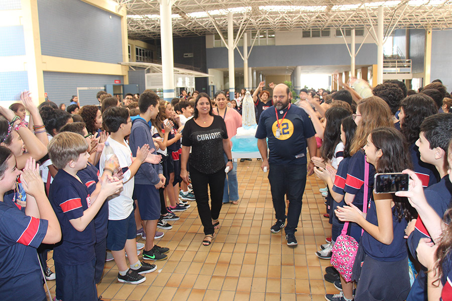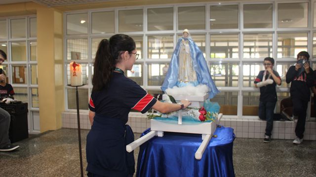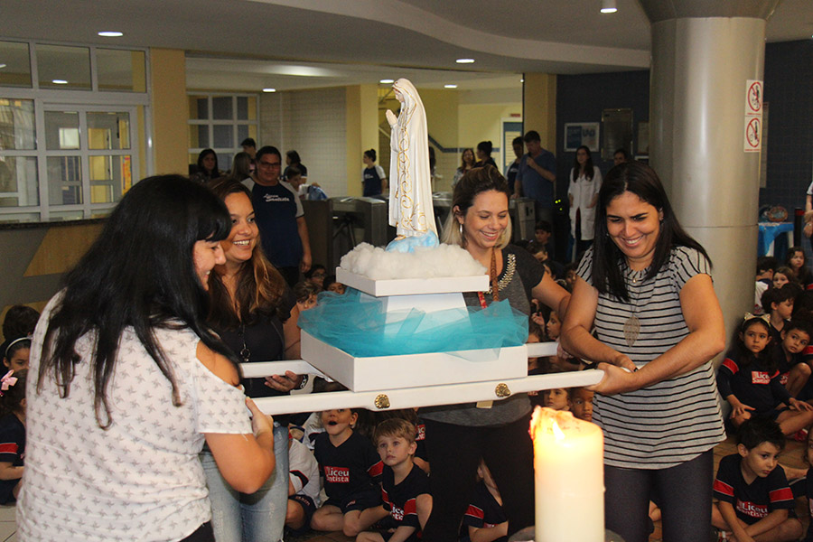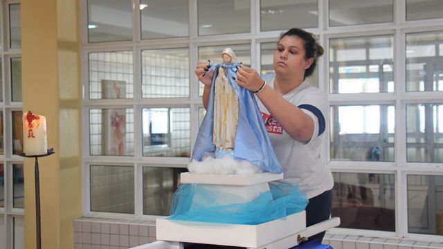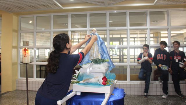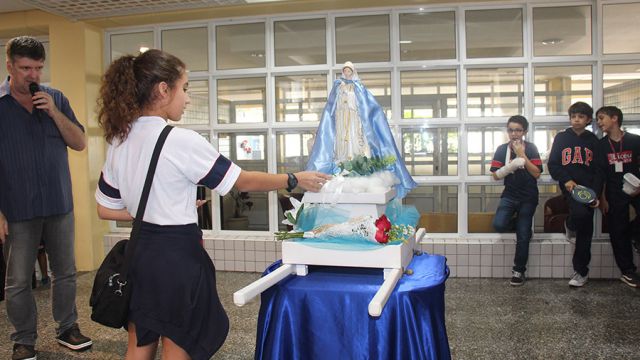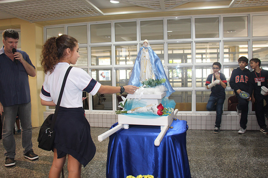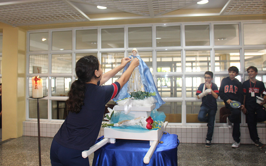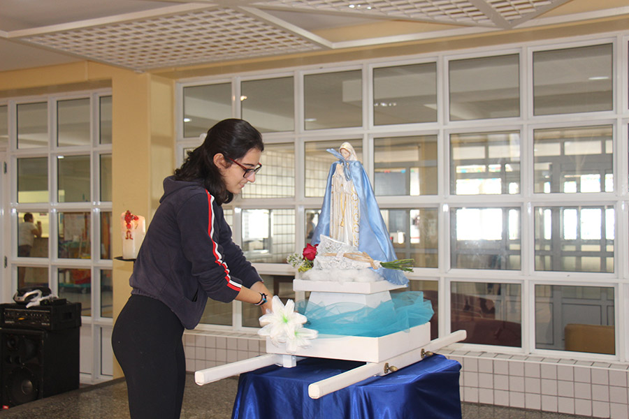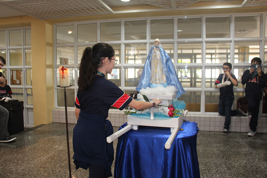 Rainha dos anjos, a imagem é acomodada em flores brancas que representam o divino de Maria. A cada invocação, alunos levavam peças como o manto azul, que representa Nossa Senhora como a Rainha dos Apóstolos; rosas vermelhas para lembrar o sangue derramado por todos aqueles que morreram por acreditar em Jesus e o perfume que remete à docilidade de Maria.