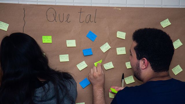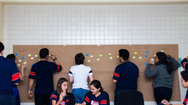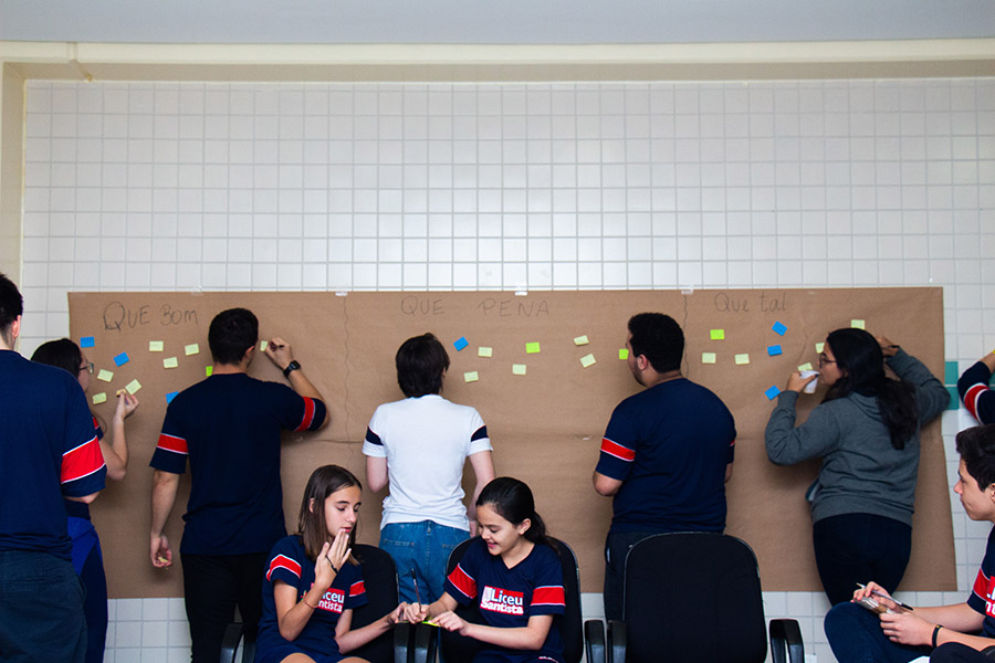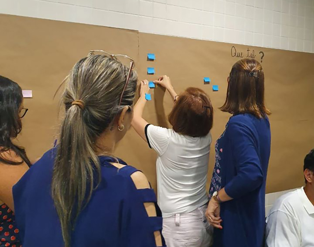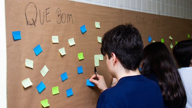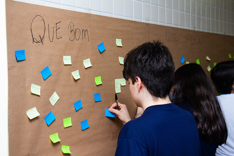 Após as explanações, os participantes foram convidados a expressar o que funciona na escola, o que pode melhorar, além de colaborar com novas ideias. Cada um pôde fazer sua colocação, por meio de post its, em um painel. O resultado será partilhado durante as reuniões pedagógicas com os professores.