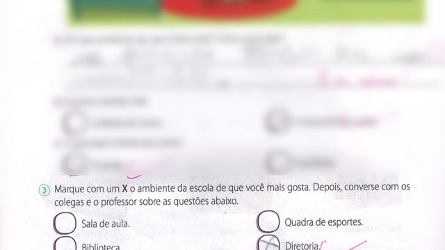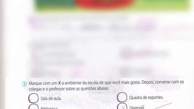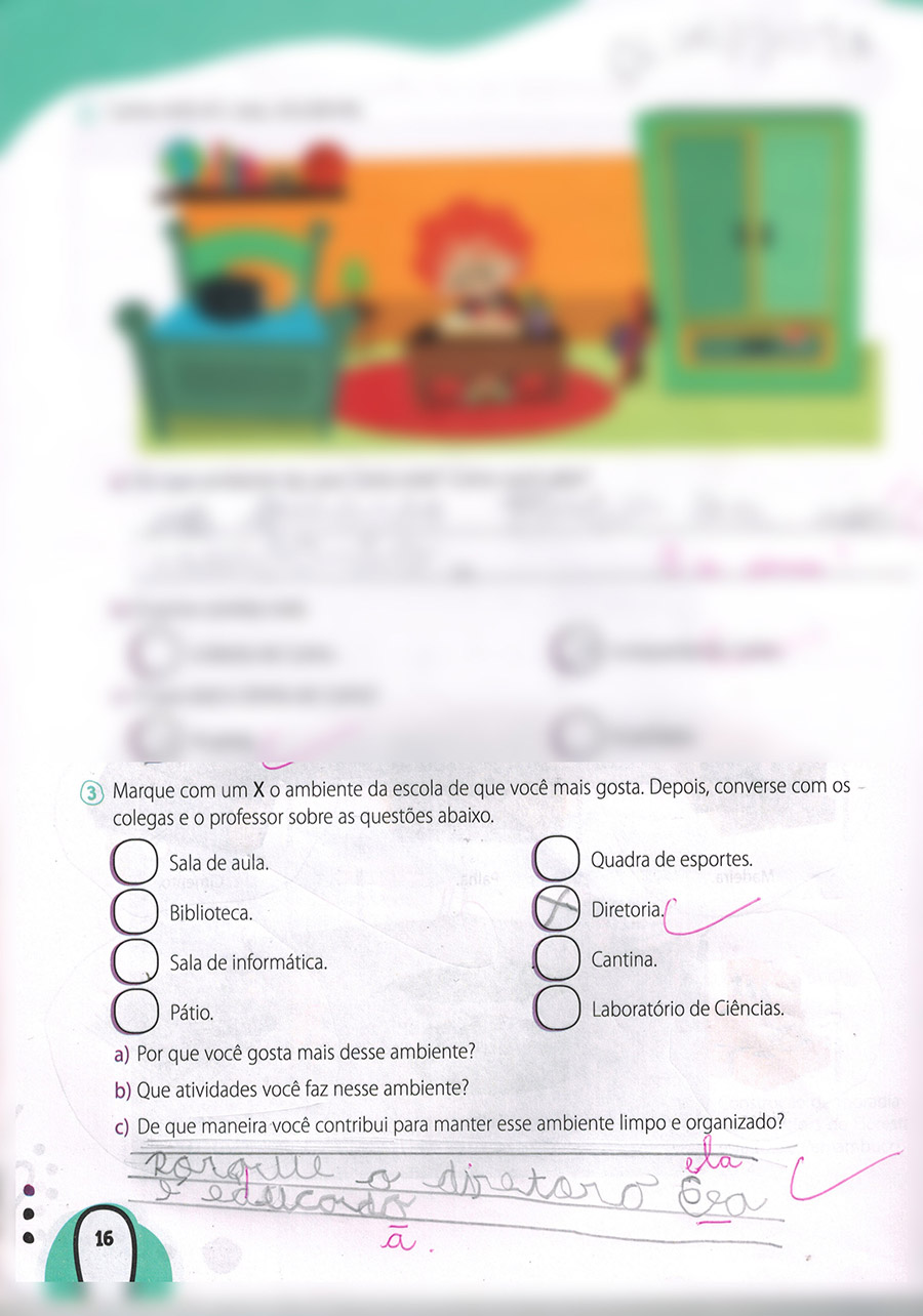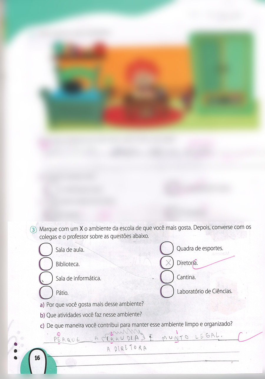 Uma atividade corriqueira do livro solicitava que os alunos do 2º ano do Ensino Fundamental escolhessem o ambiente escolar que eles mais gostavam. Entre as opções, sala de aula, biblioteca, sala de informática, pátio, quadra de esportes, diretoria, cantina e laboratório de Ciências. Será que alguém escolheria a diretoria? A resposta é… sim.
