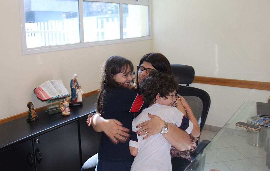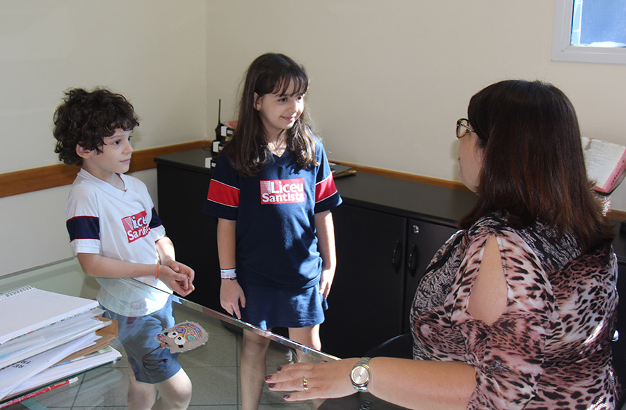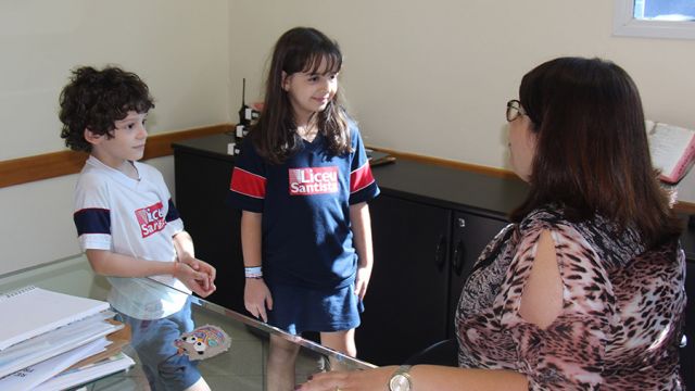 Rafaela estuda no Liceu Santista desde o Grupo 2, da Educação Infantil; Enzo, desde o Grupo 5. Então, pela primeira vez desde chegaram à escola, eles foram para a diretoria. Após um convite surpresa em um dia normal de aula, descobriram como chegar até lá.