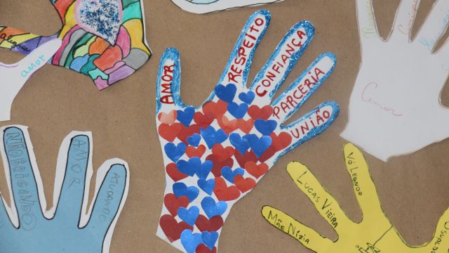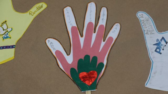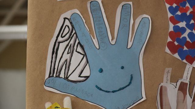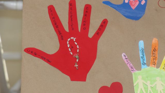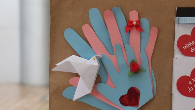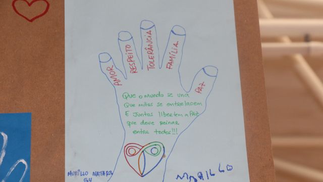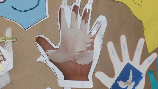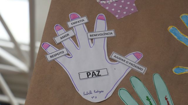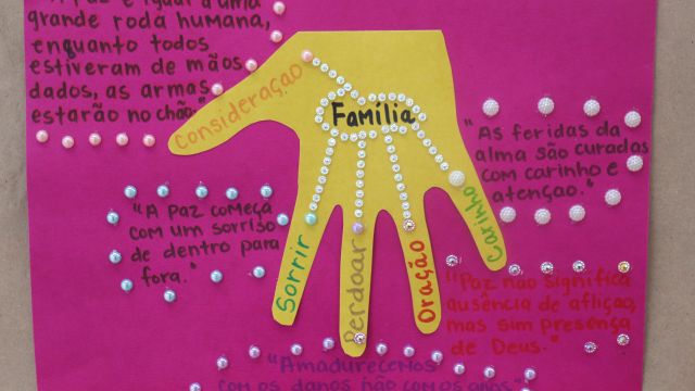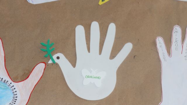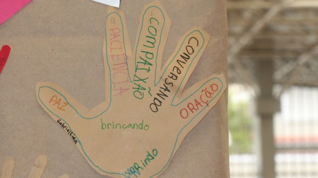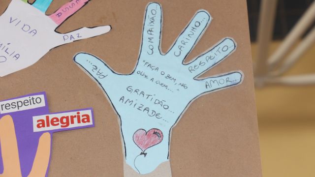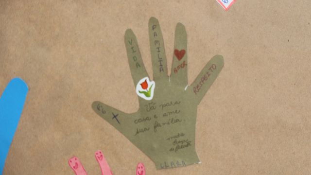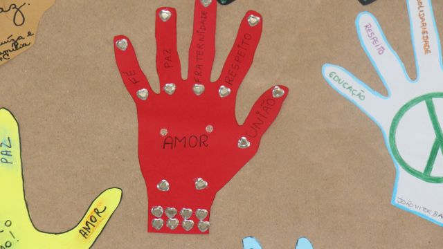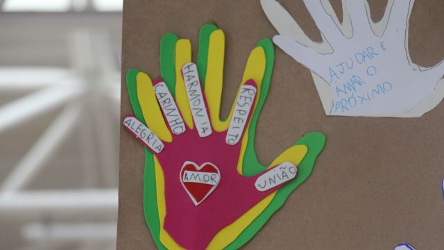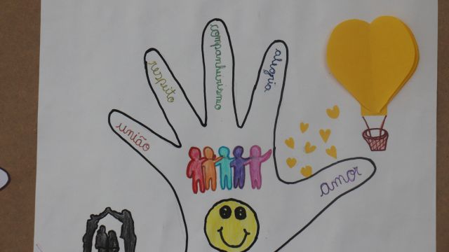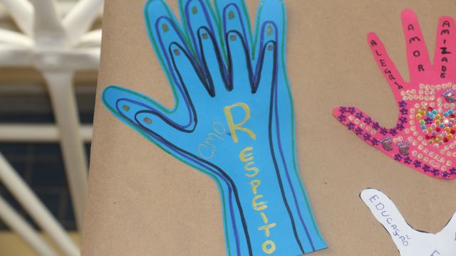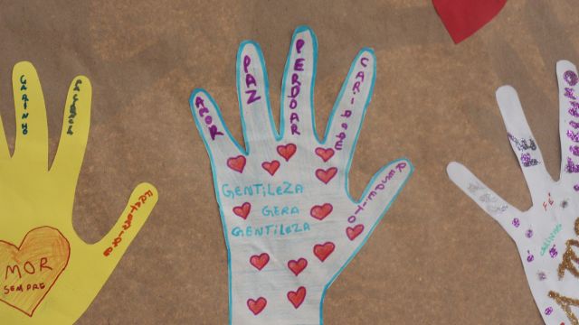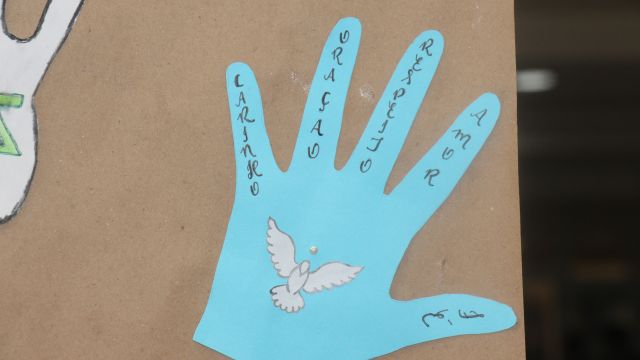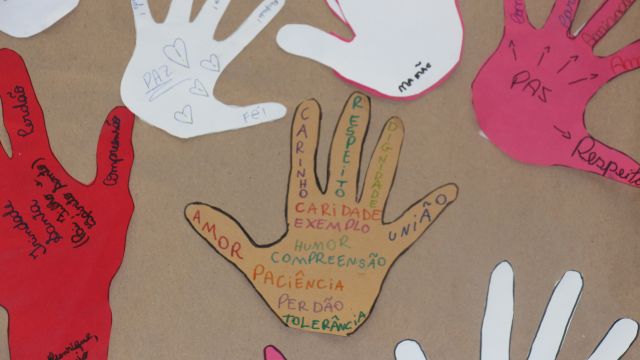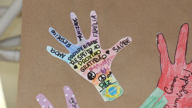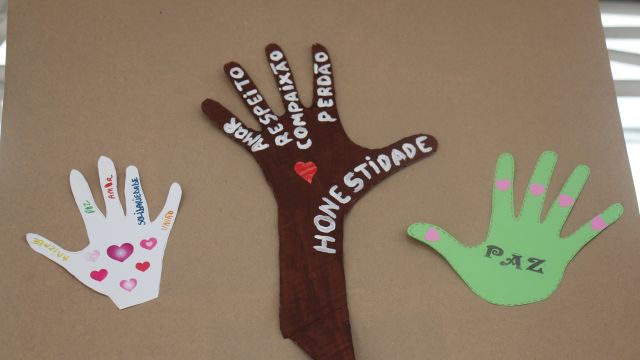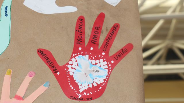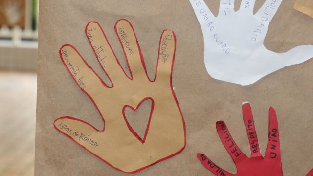 Que valores sua família acredita serem importantes para um mundo de paz? Será que não está nas mãos de cada um ajudar um pouquinho para que tenhamos uma sociedade mais fraterna? Foi a partir de indagações com essas, inspiradas no tema da CF 2018, Fraternidade e Superação da Violência, que as famílias dos alunos da Educação Infantil e do Ensino Fundamental 1 colocaram seus melhores sentimentos nas palmas de centenas de mãozinhas de papel que coloriram a entrada da escola no encerramento da Semana da Família.