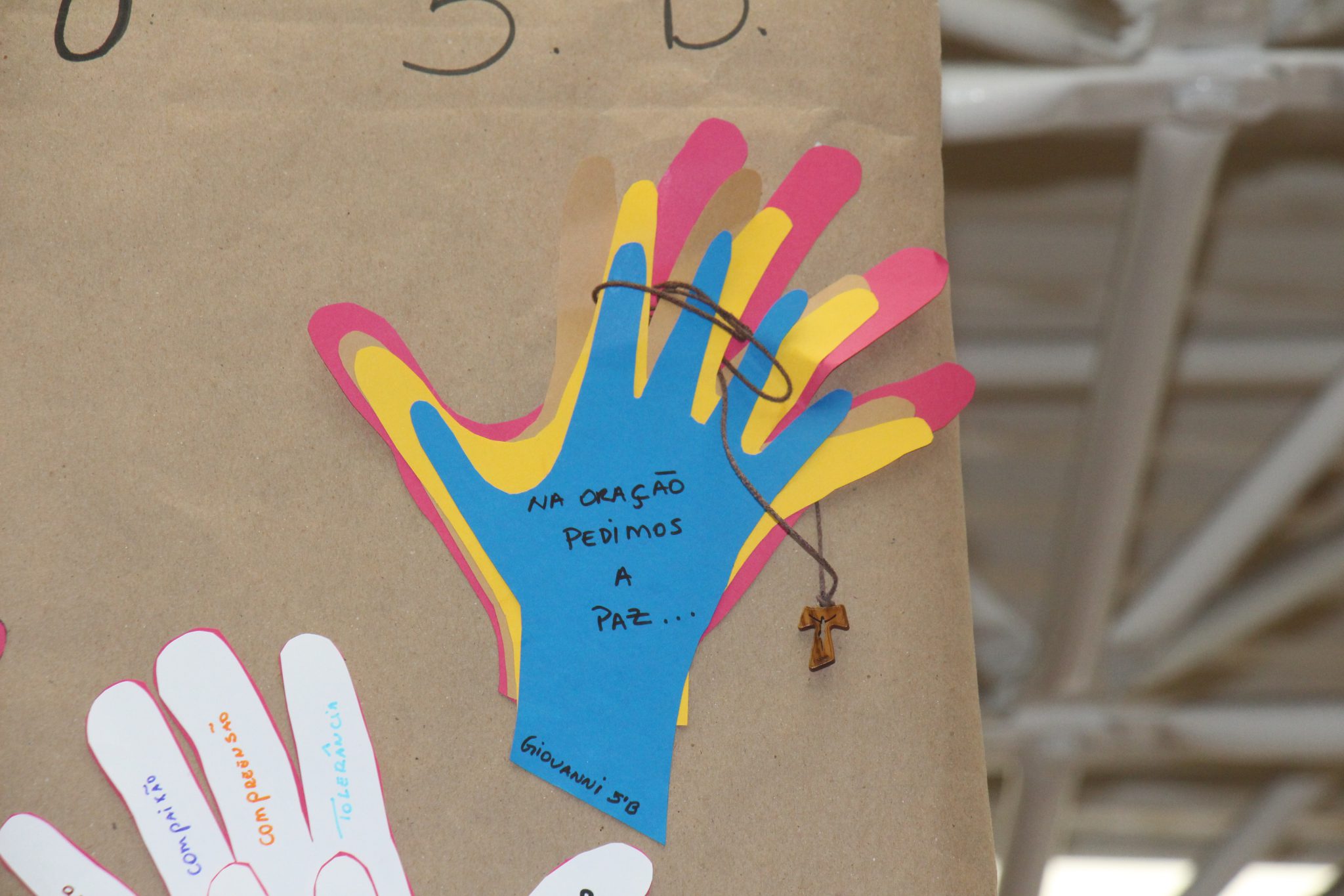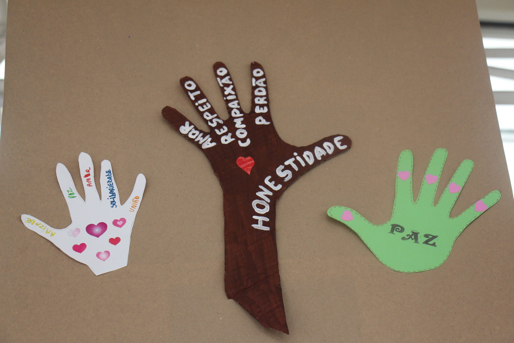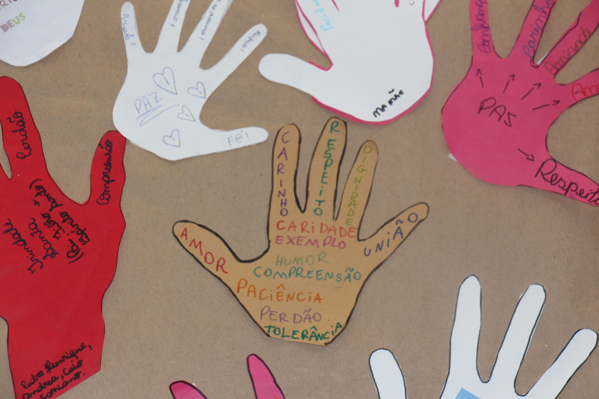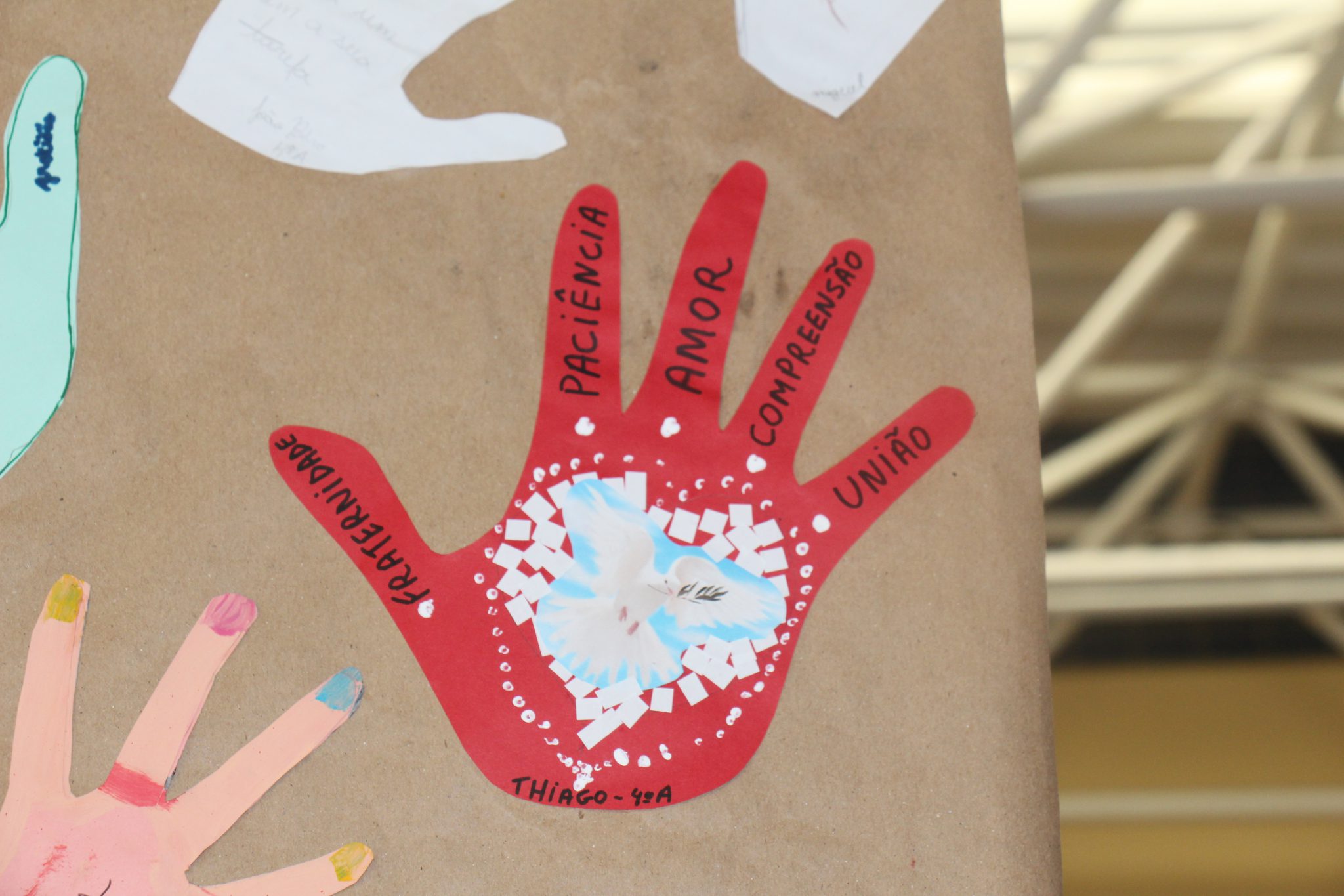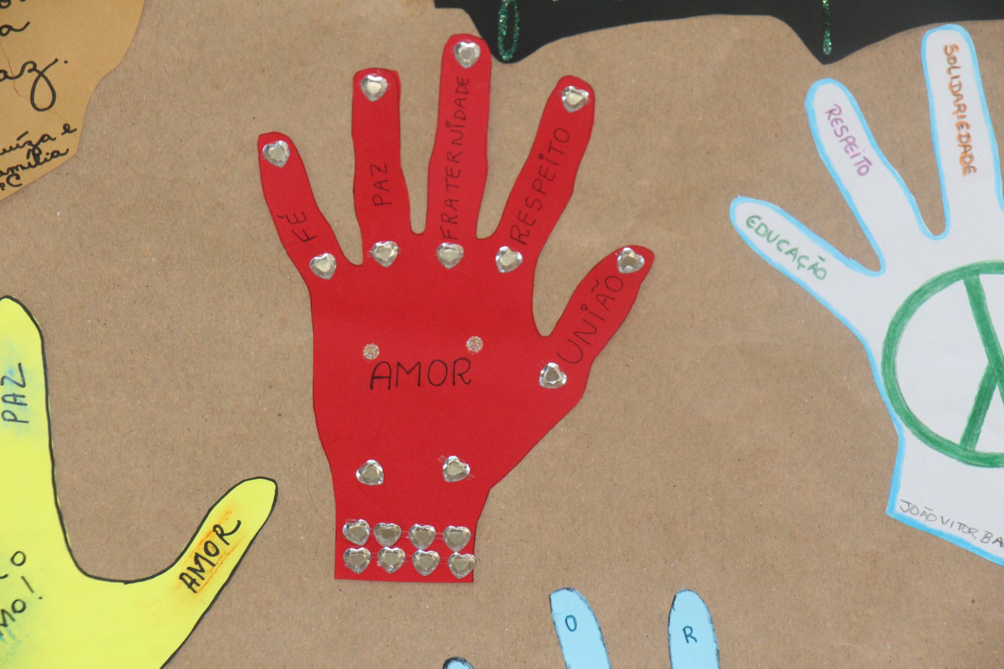 Que valores sua família acredita serem importantes para um mundo de paz? Será que não está nas mãos de cada um ajudar um pouquinho para que tenhamos uma sociedade mais fraterna? Foi a partir de indagações com essas, inspiradas no tema da CF 2018, Fraternidade e Superação da Violência, que as famílias dos alunos da Educação Infantil e do Ensino Fundamental 1 colocaram seus melhores sentimentos nas palmas de centenas de mãozinhas de papel que coloriram a entrada da escola no encerramento da Semana da Família.