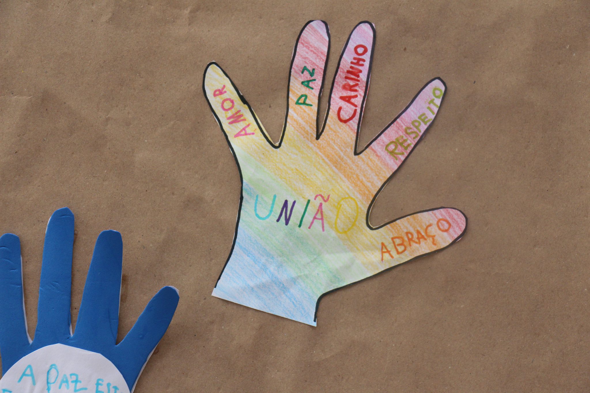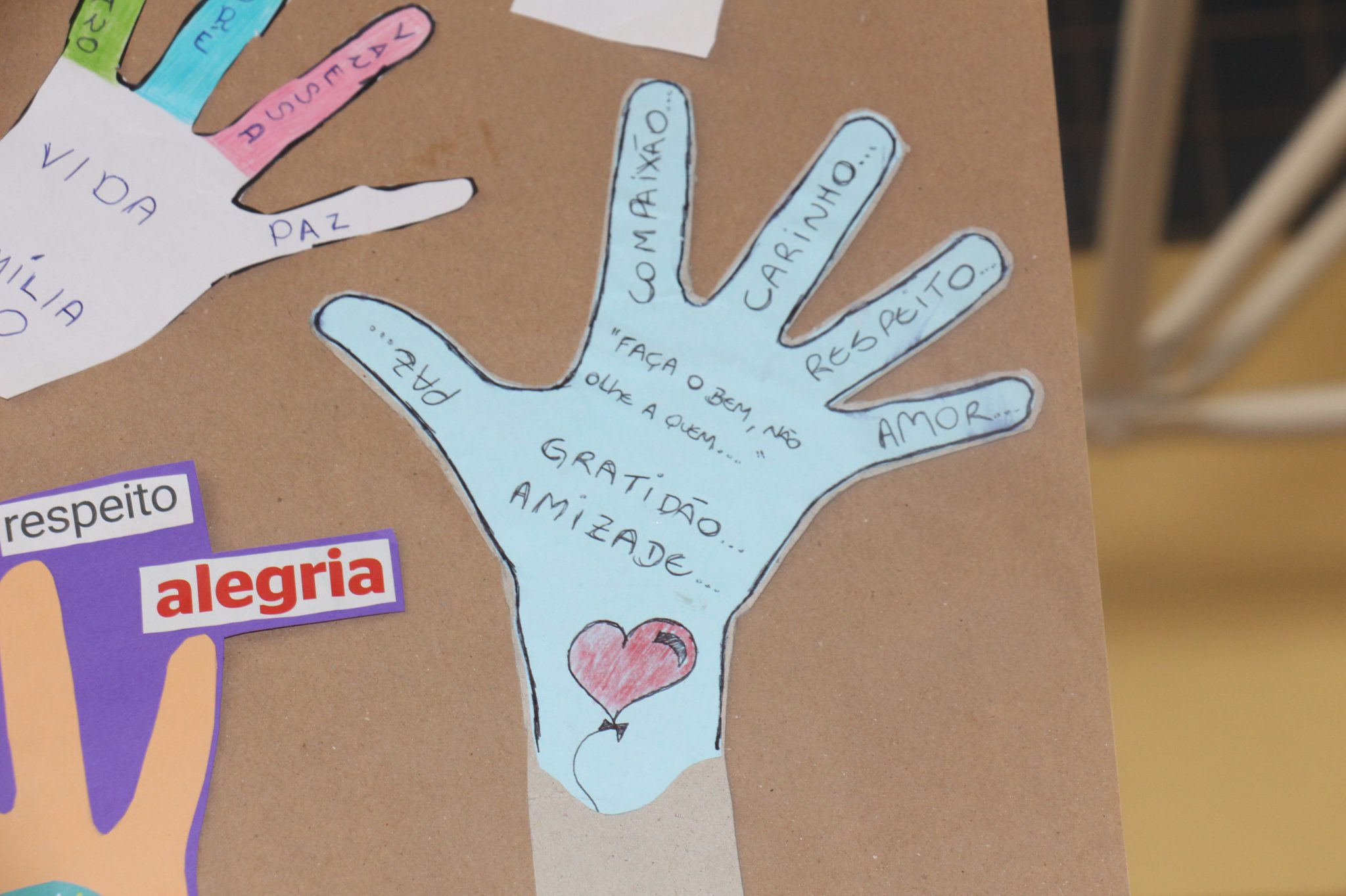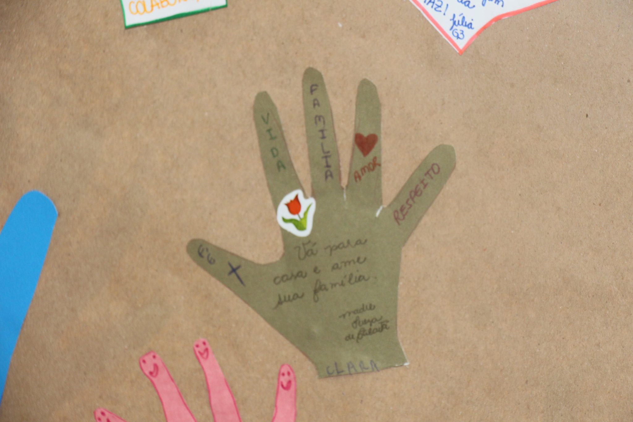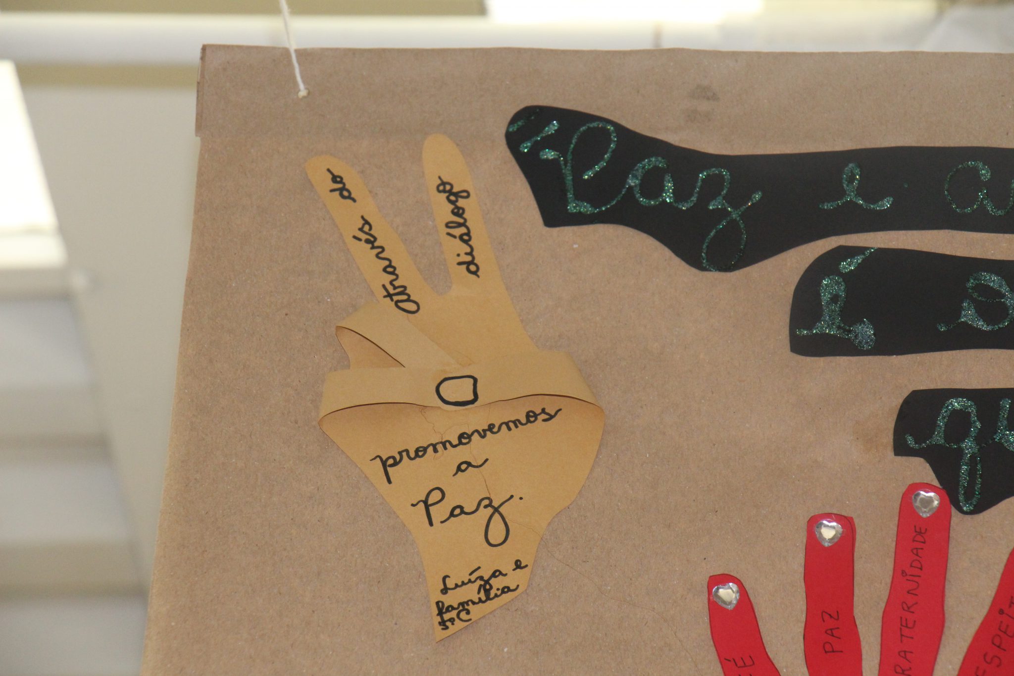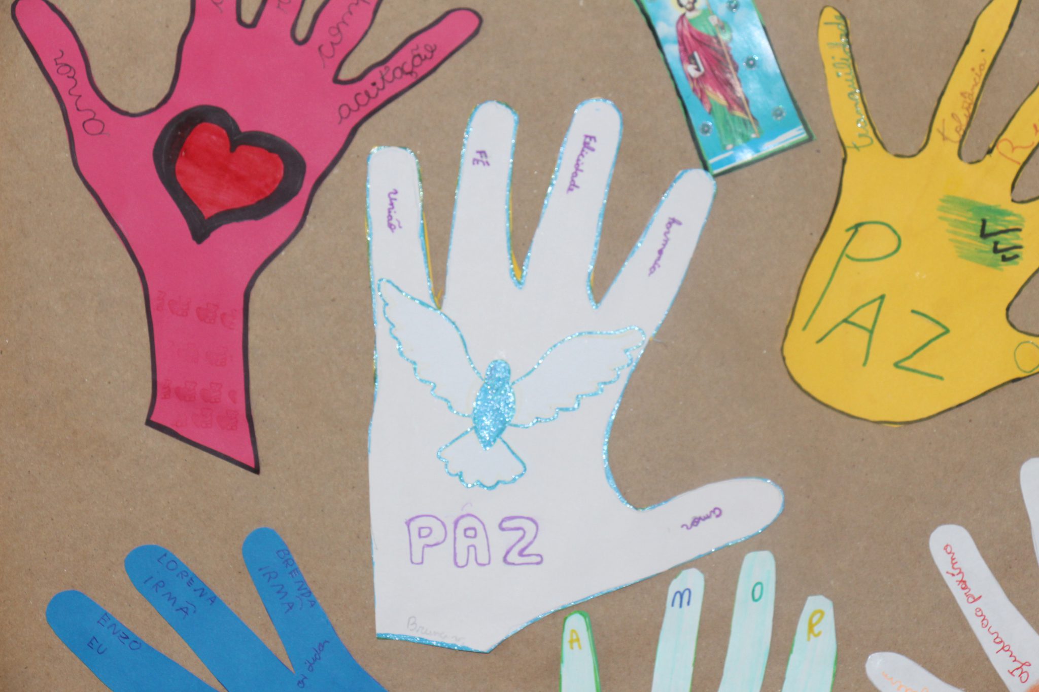 Que valores sua família acredita serem importantes para um mundo de paz? Será que não está nas mãos de cada um ajudar um pouquinho para que tenhamos uma sociedade mais fraterna? Foi a partir de indagações com essas, inspiradas no tema da CF 2018, Fraternidade e Superação da Violência, que as famílias dos alunos da Educação Infantil e do Ensino Fundamental 1 colocaram seus melhores sentimentos nas palmas de centenas de mãozinhas de papel que coloriram a entrada da escola no encerramento da Semana da Família.