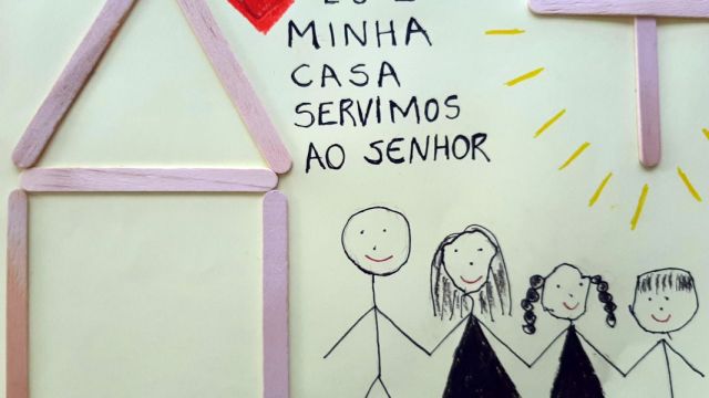Cada curso trabalhou um tema diferente, inspirado no tema “Eu e minha casa serviremos ao Senhor”. Na Educação Infantil, as famílias se reuniram para demonstrar seu amor por meio de desenhos produzidos coletivamente.