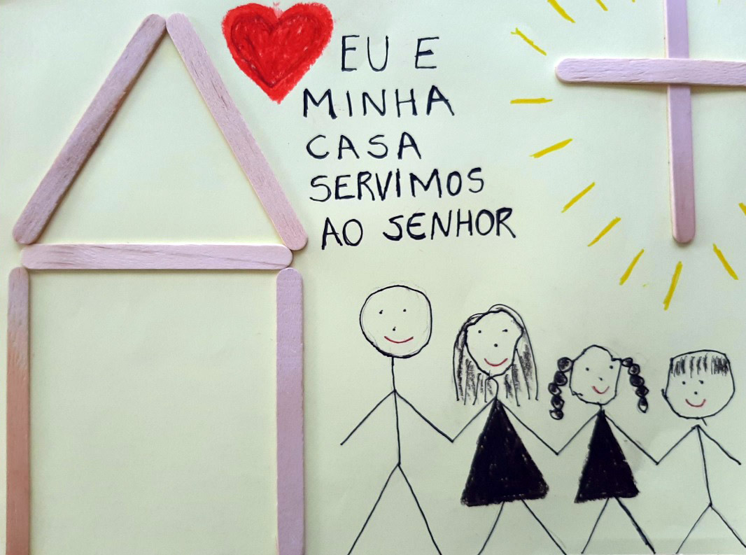 Cada curso trabalhou um tema diferente, inspirado no tema “Eu e minha casa serviremos ao Senhor”. Na Educação Infantil, as famílias se reuniram para demonstrar seu amor por meio de desenhos produzidos coletivamente.