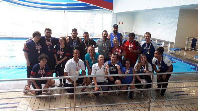 A equipe de arbitragem foi formada pela estagiária Gabriela Faria (árbitra da Federação Aquática Paulista), professor Milton Domingos (mesário) e por alunos do Ensino Médio (cronometragem).