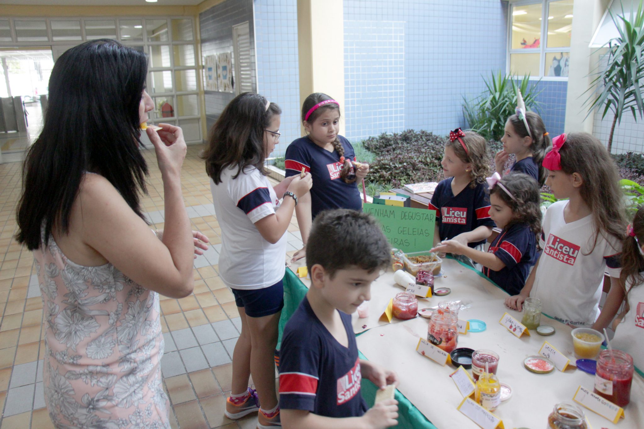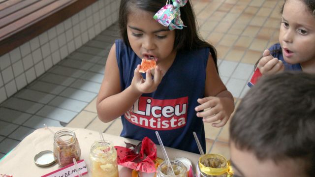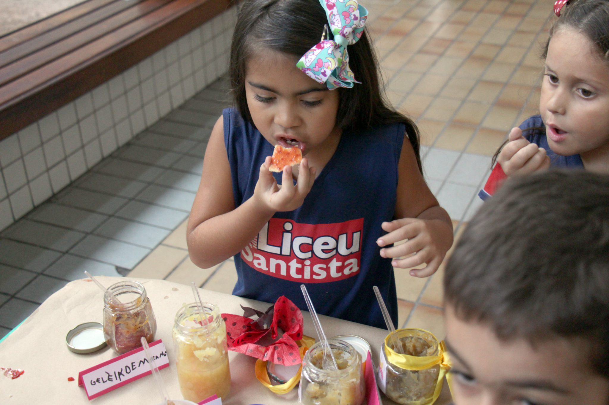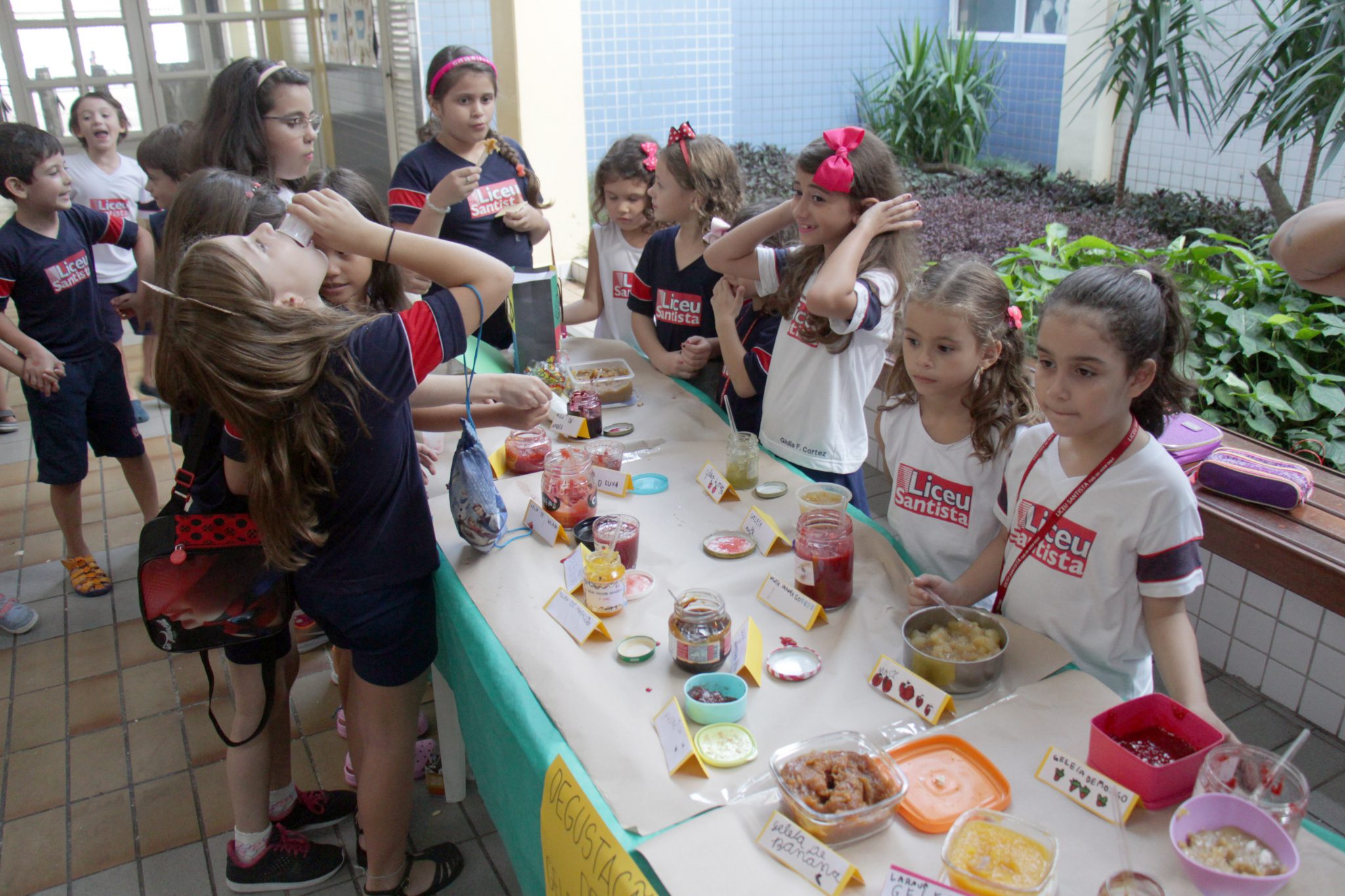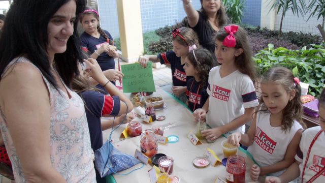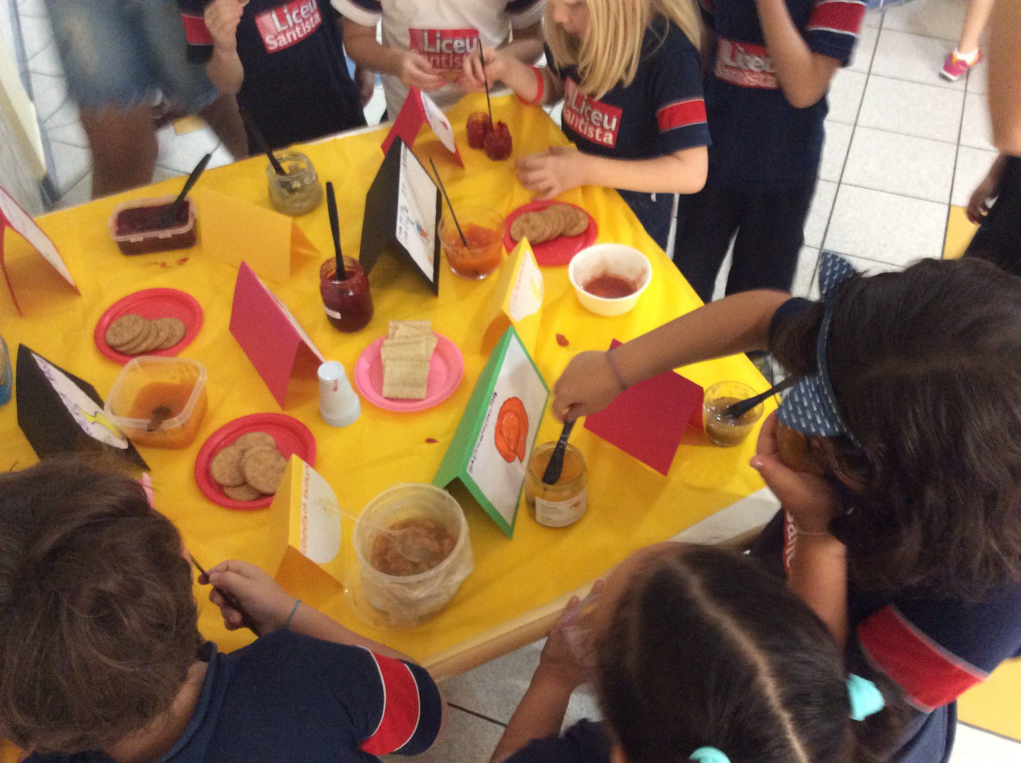 Ao estudar esse tópico, 11 e convidados na escola. O resultado foi uma mesa de colorida composição de potinhos. As crianças tiveram a oportunidade de experimentar geleias e compotas de manga, morango, banana, pêssego, abóbora com coco, abacaxi entre outras.