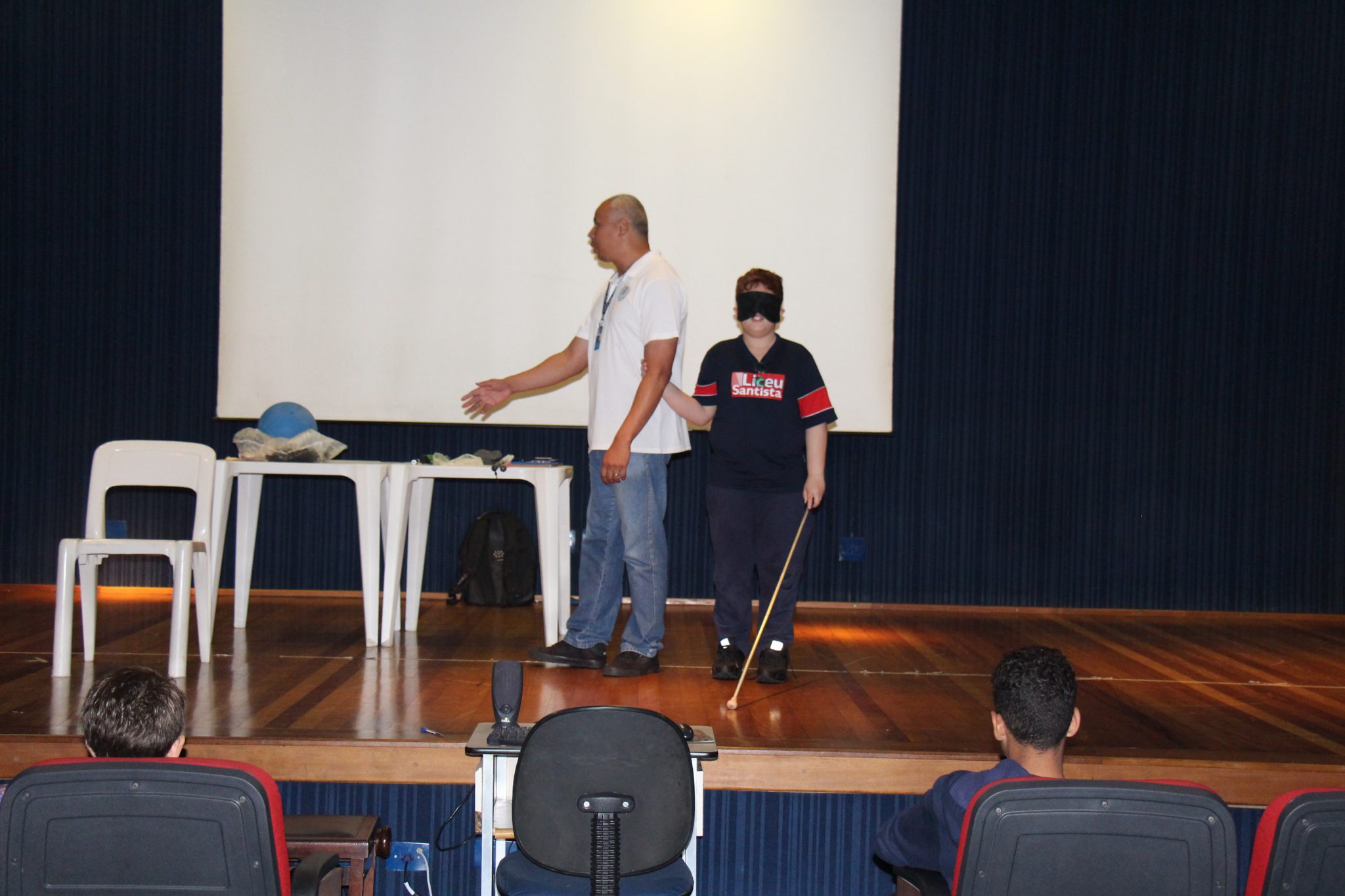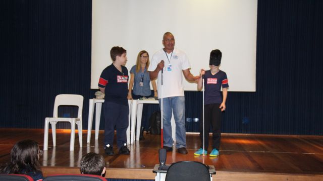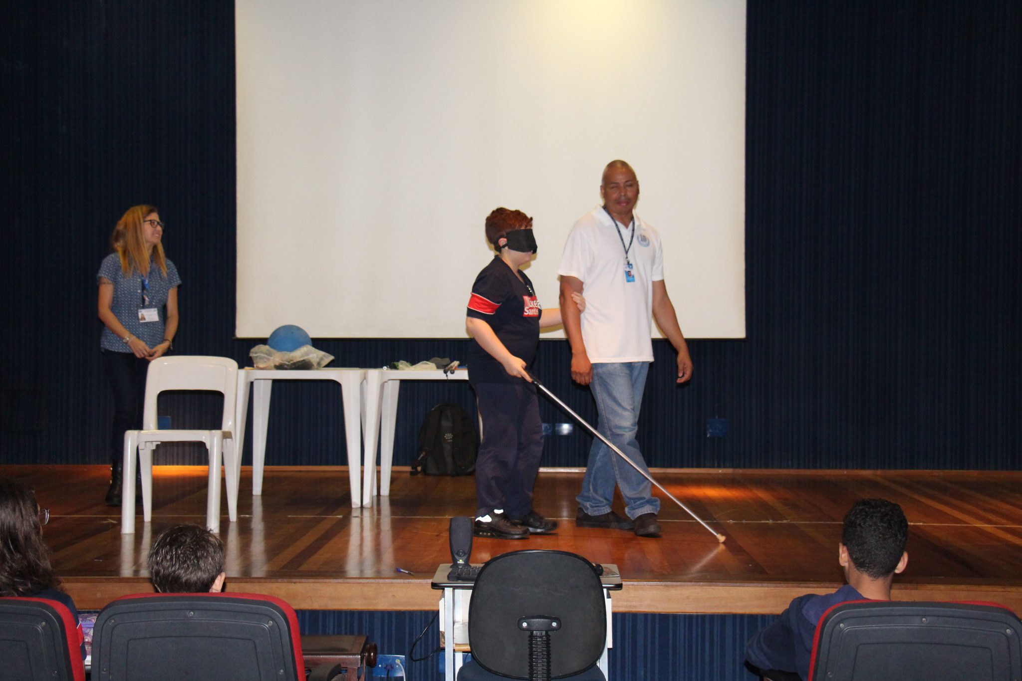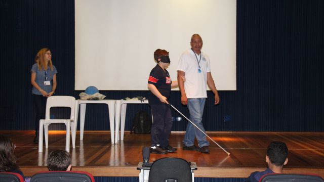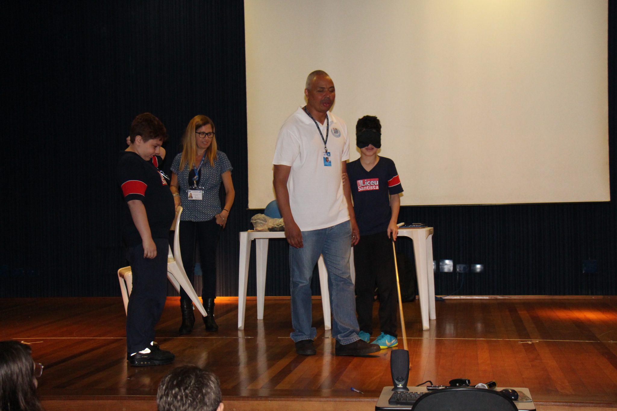 Para exemplificar algumas situações, alguns estudantes subiram ao palco e foram vendados para que vivenciarem a atividade da forma mais próxima possível. Foi assim que, utilizando a bengala do próprio professor Gilmar, os liceístas experimentaram como é movimentarem-se sem a visão.