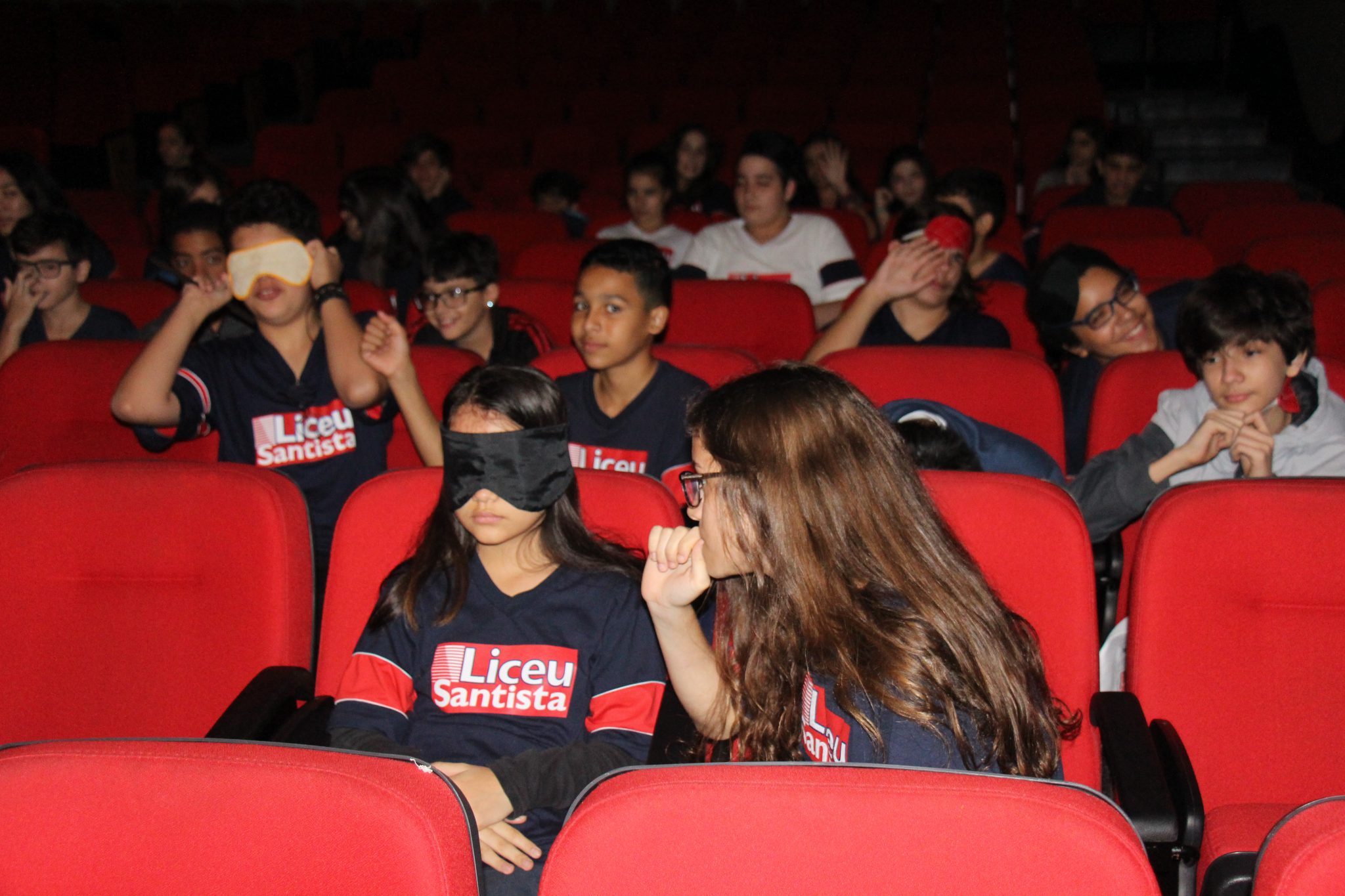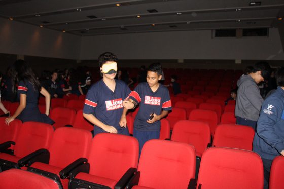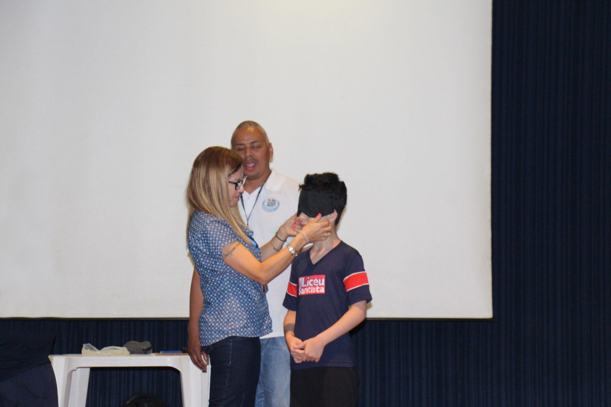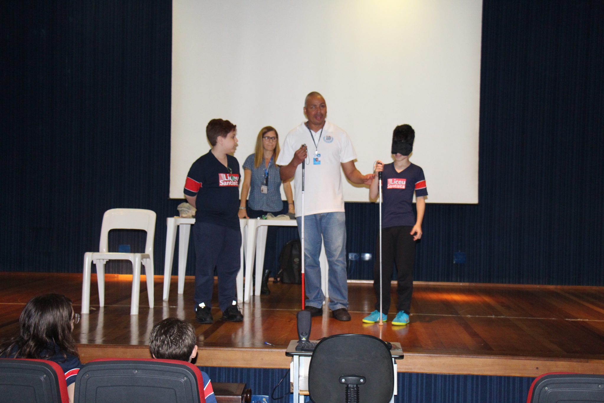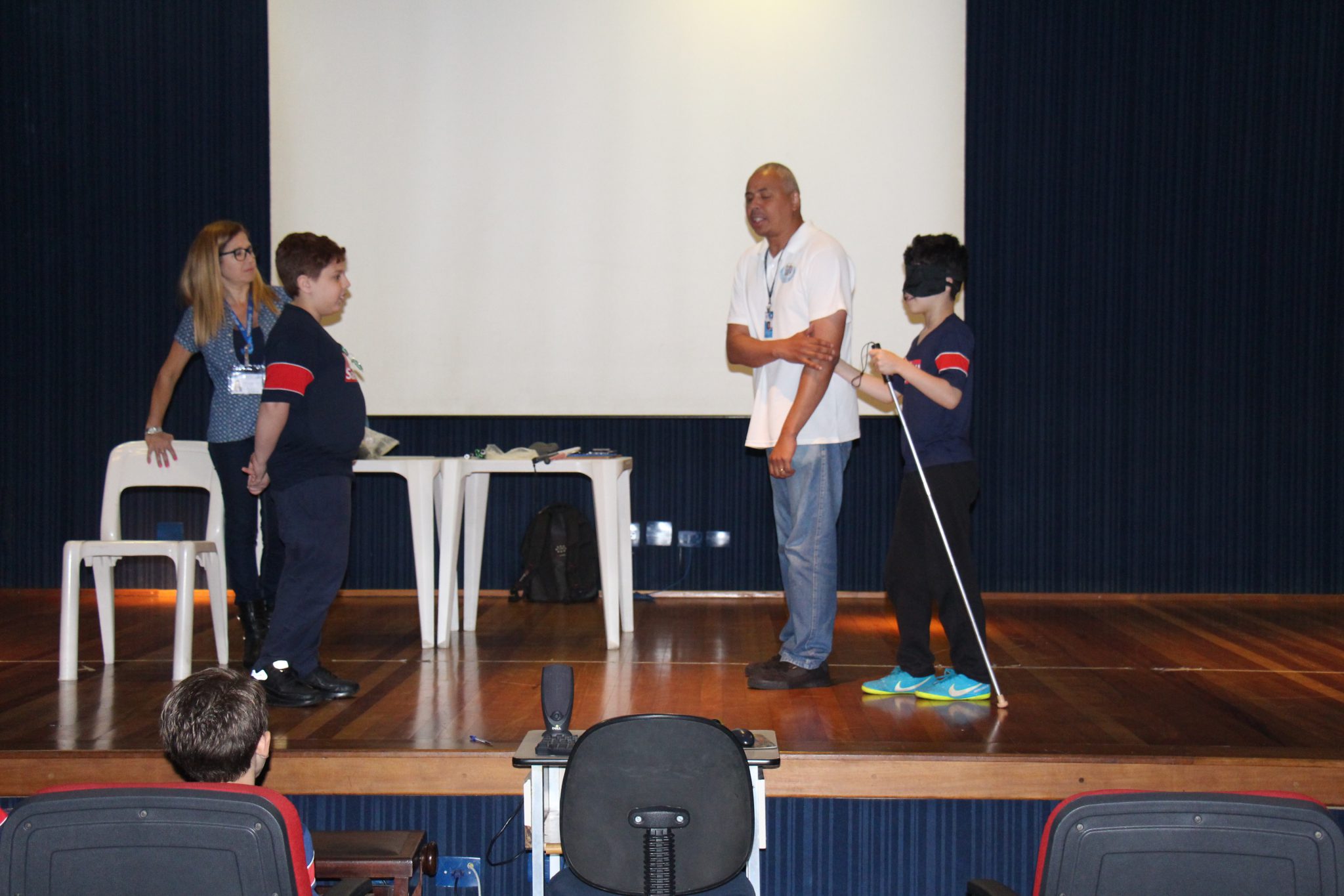 Para exemplificar algumas situações, alguns estudantes subiram ao palco e foram vendados para que vivenciarem a atividade da forma mais próxima possível. Foi assim que, utilizando a bengala do próprio professor Gilmar, os liceístas experimentaram como é movimentarem-se sem a visão.