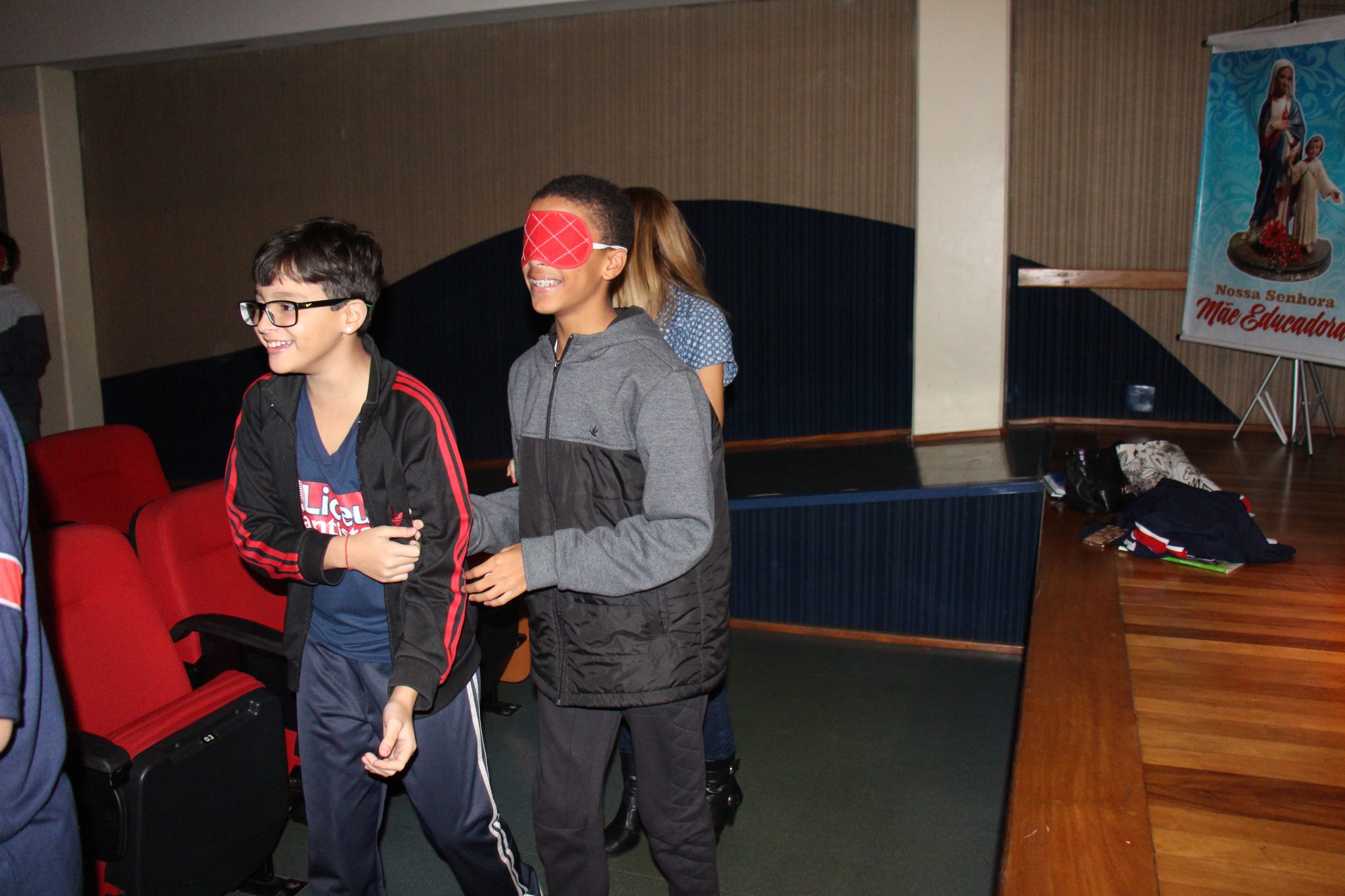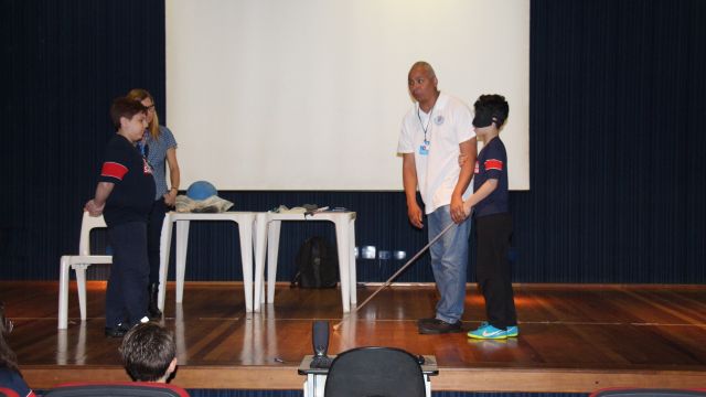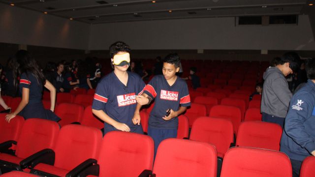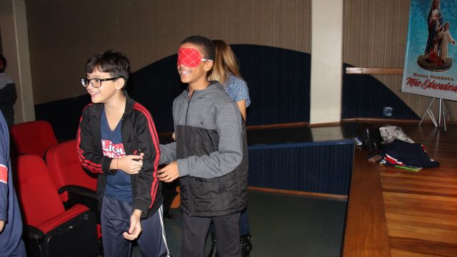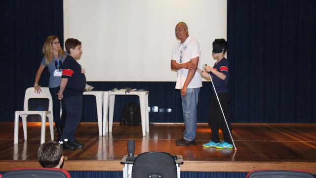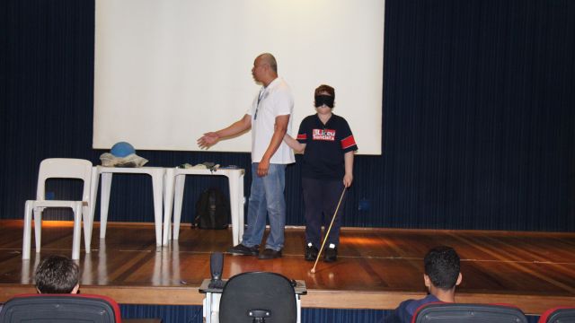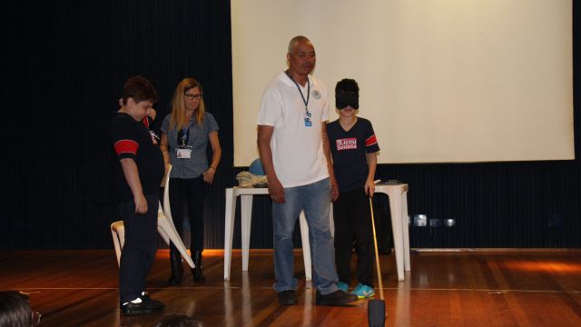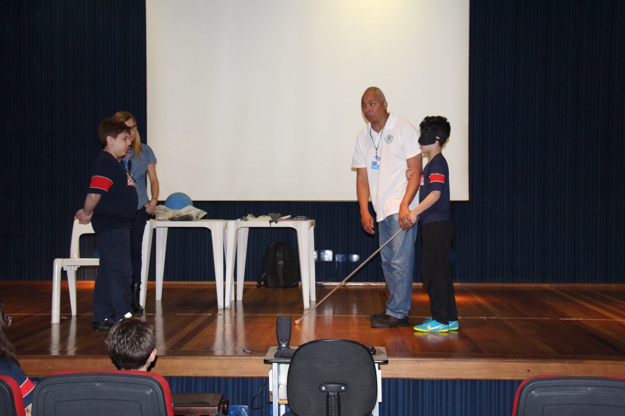 Outros alunos também tiveram a oportunidade de vivenciar como é guiar uma pessoa cega e ser guiado por alguém. As duplas transitaram pelo auditório e puderam perceber a importância da confiança no outro e o respeito mantido entre ambos. Também conheceram uma bola de golbol, que possui guizos para que os atletas cegos e/ou de baixa visão possam ouvi-la durante o jogo.