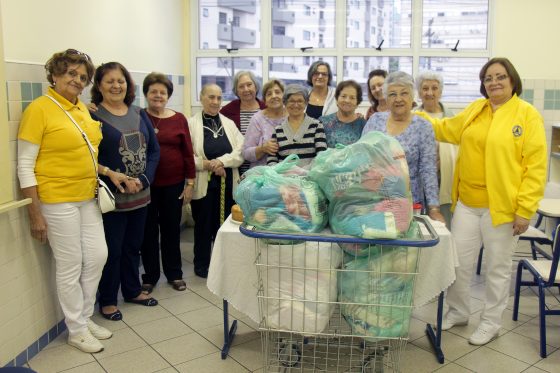 Representantes da Associação dos Voluntários da Santa Casa de Misericórdia de Santos (AVOSC) estiveram no Liceu Santista para receber a doação de centenas de peças de tricô, produzidas pelas vovós que integram o grupo Vamos Tricotar.